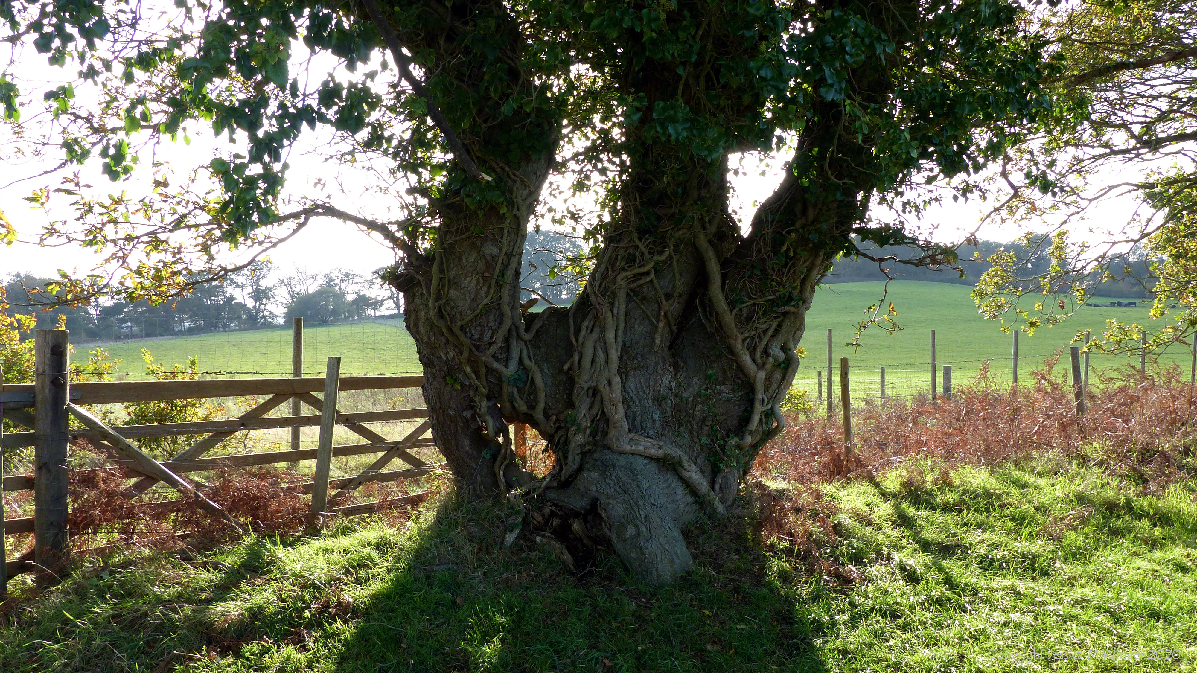 Arne Autumn 1.51 Old oak with multiple trunks in a field boundary at Arne RSPB Reserve in Dorset, 3 November 2020.