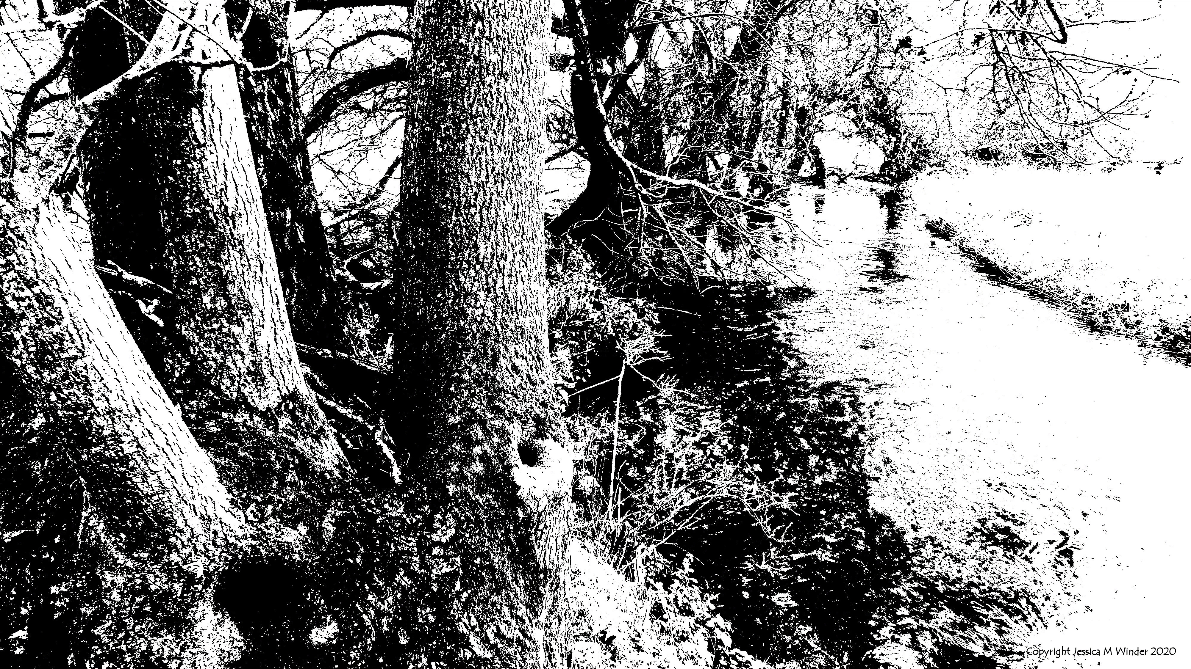 Riverbank 1.1 Black and white image of trees on a the banks of the River Cerne near Charminster in Dorset, November 2020.