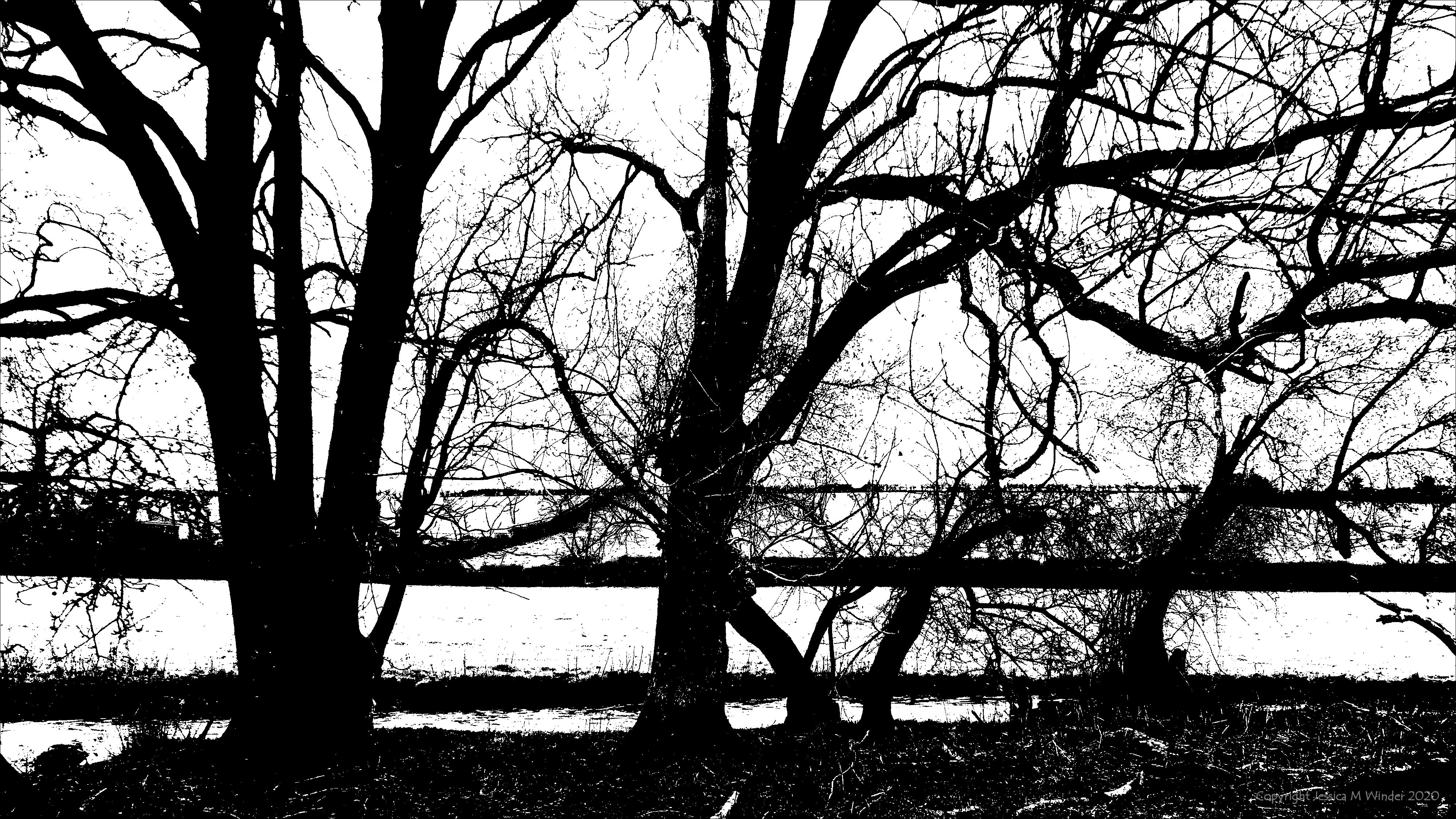 Riverbank 1.2 Black and white image of trees on a the banks of the River Cerne near Charminster in Dorset, November 2020.