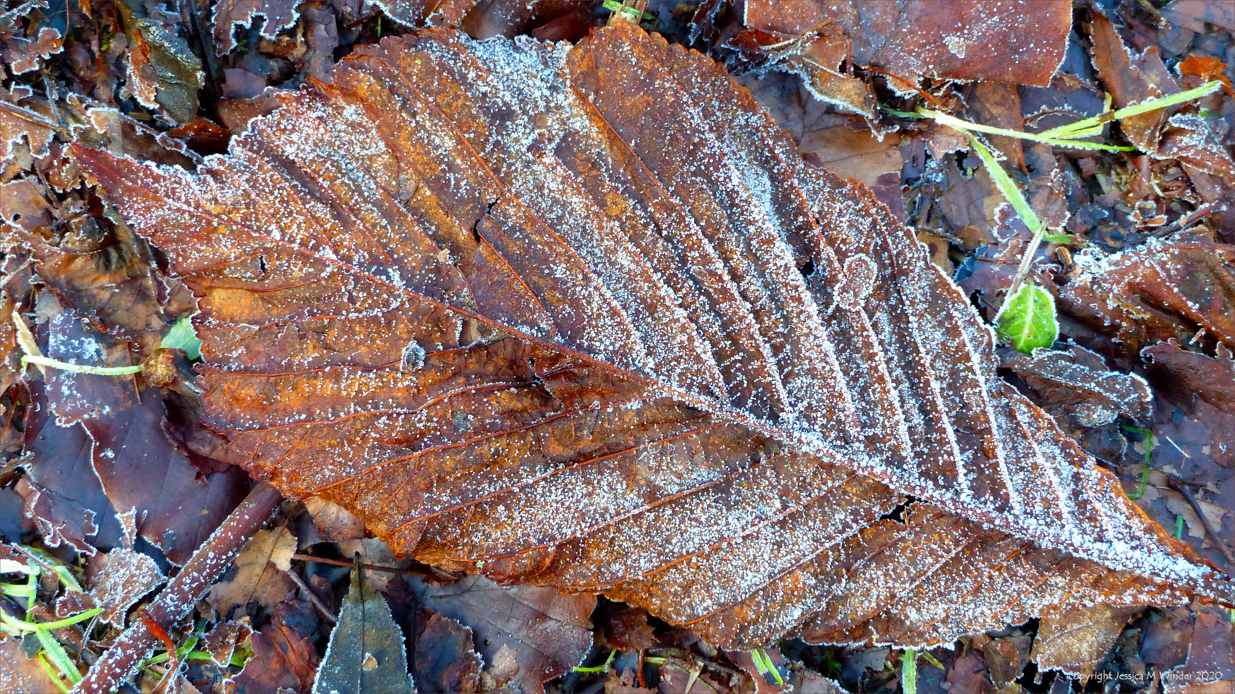 Fallen leaves on the ground, seen on a winter walk one frosty morning in Charlton Down, Dorset, 8th December 2020.