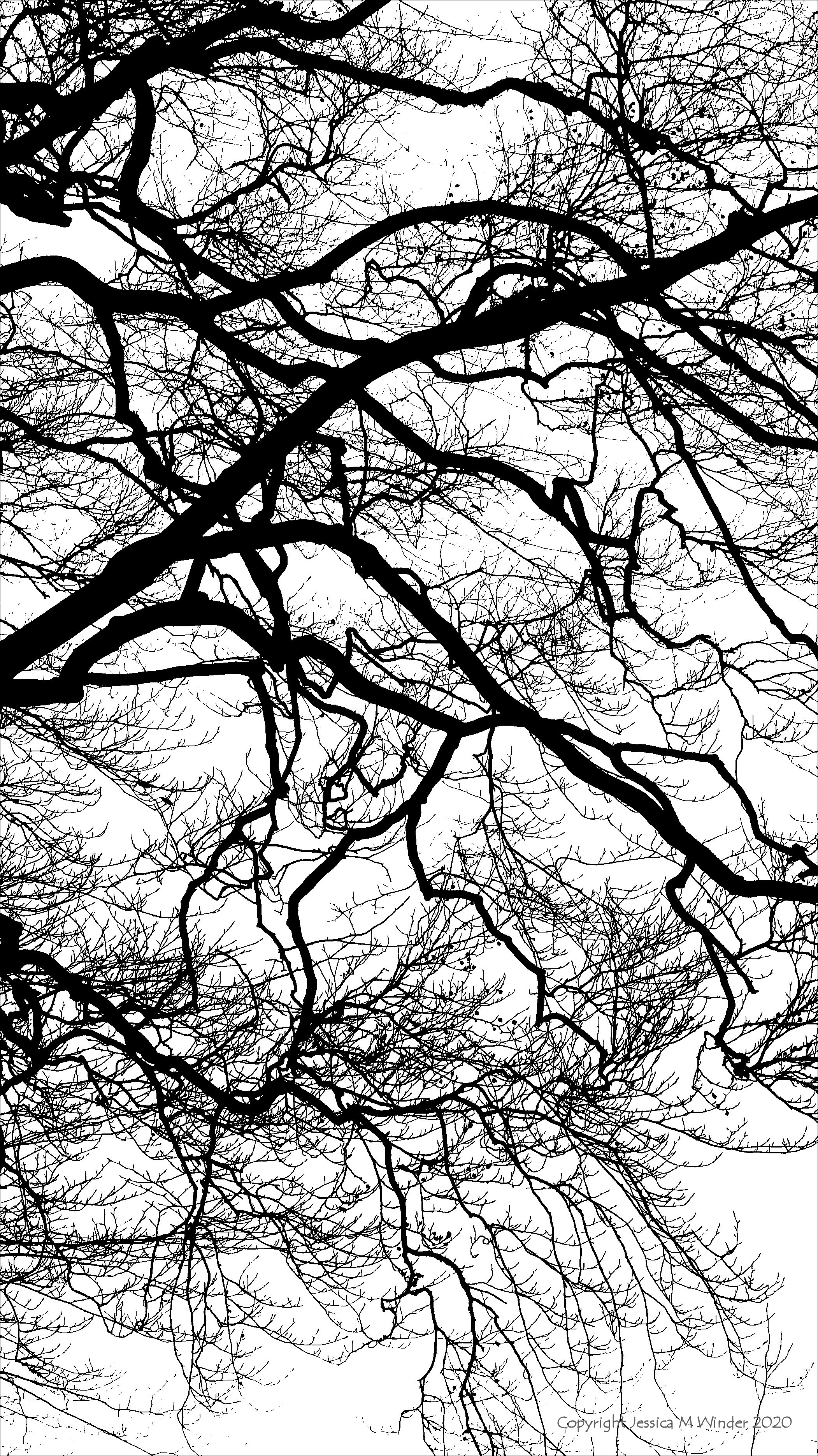 Black and white images of the natural patterns of bare branches on beech trees silhouetted against the sky in the village of Charlton Down in Dorset 20 December 2020.