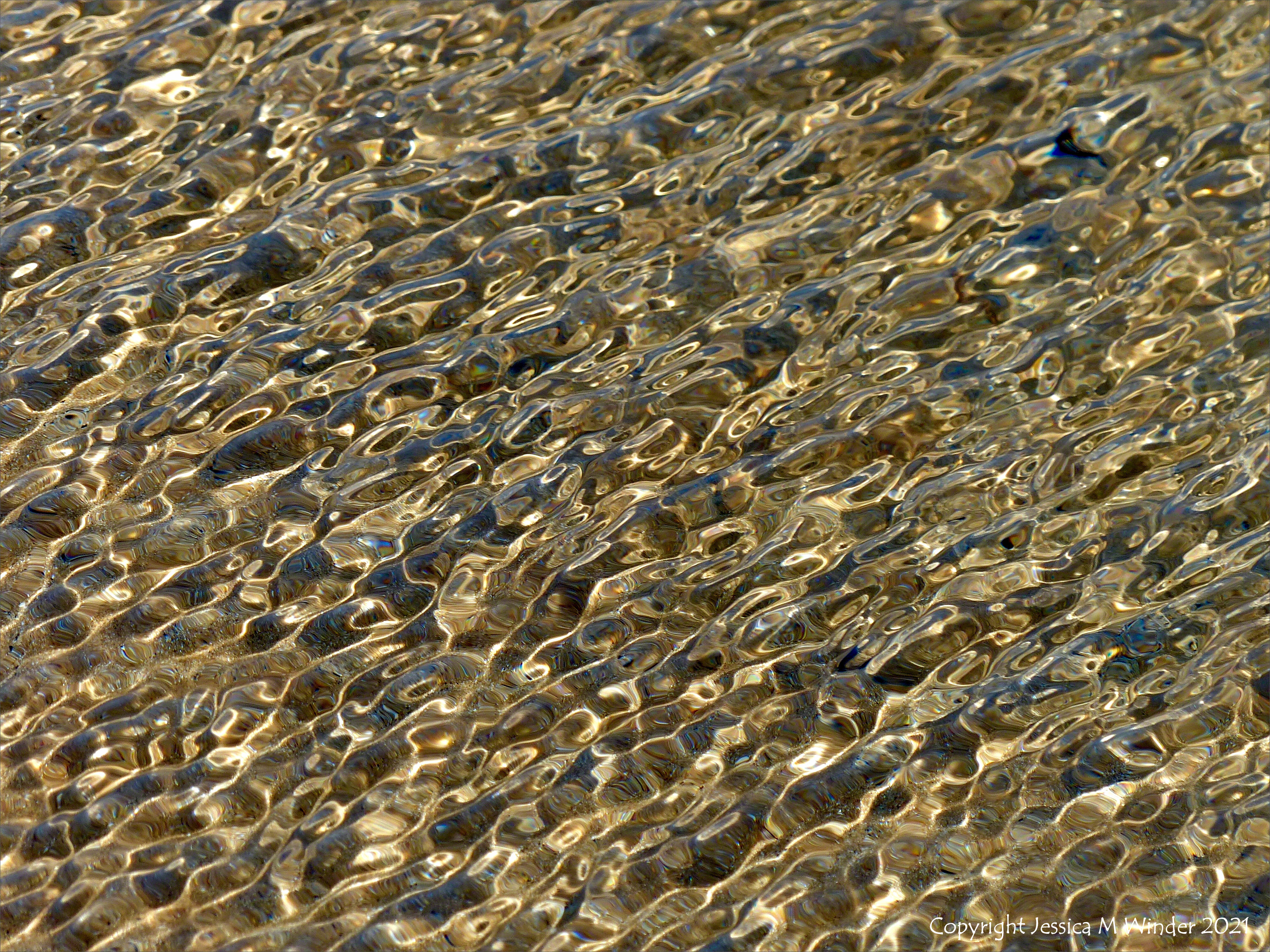 One of a series of close-up photographs of the transient and ever-changing natural patterns of rippled water with reflected light in shallow tidal sea water at Burry Holms on Rhossili Bay in Gower, South Wales.