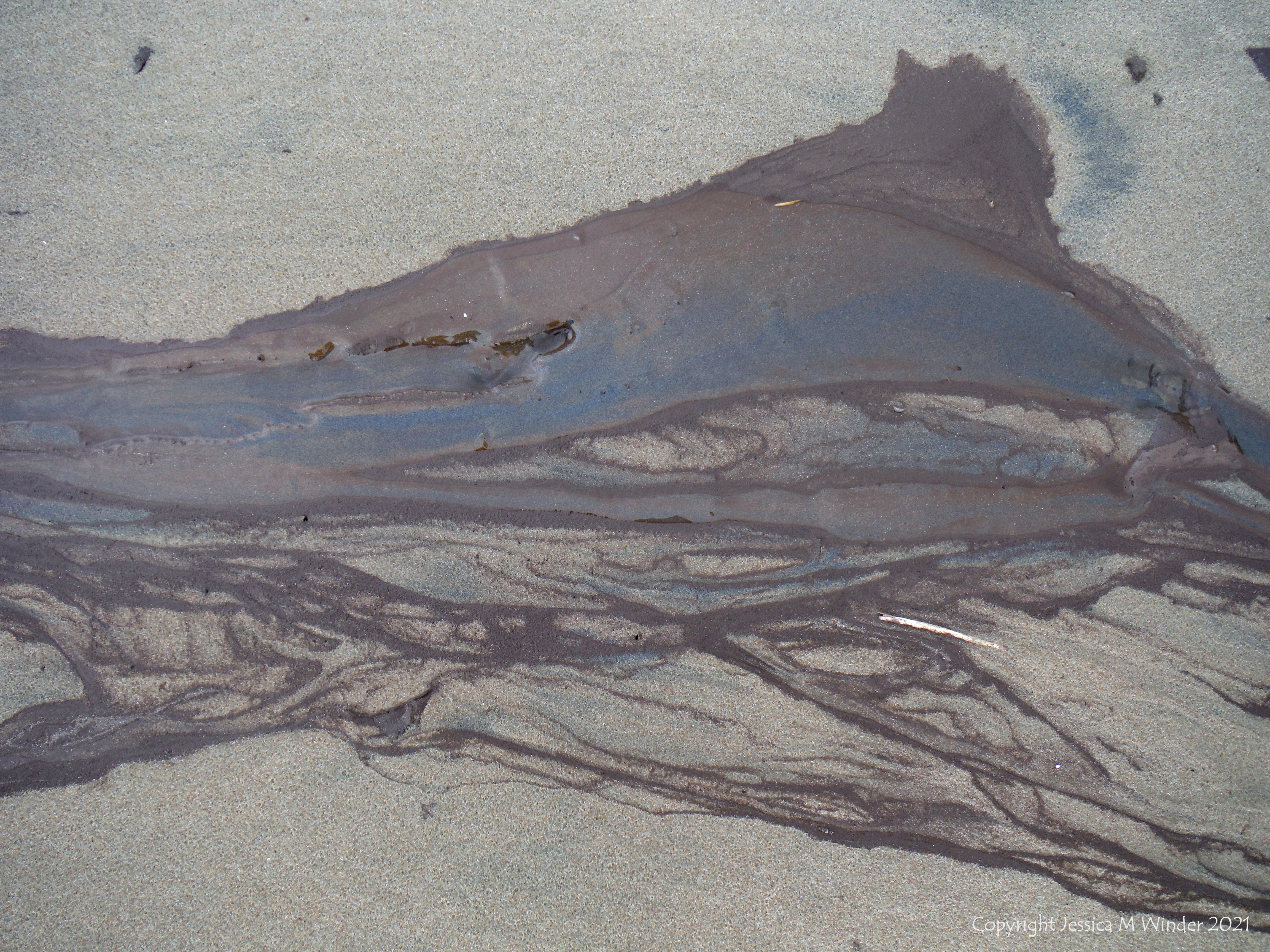 Patterns on seashore sand caused by storm water running off red and grey soil onto the beach at Rhossili Bay in Gower, South Wales, October 2013.