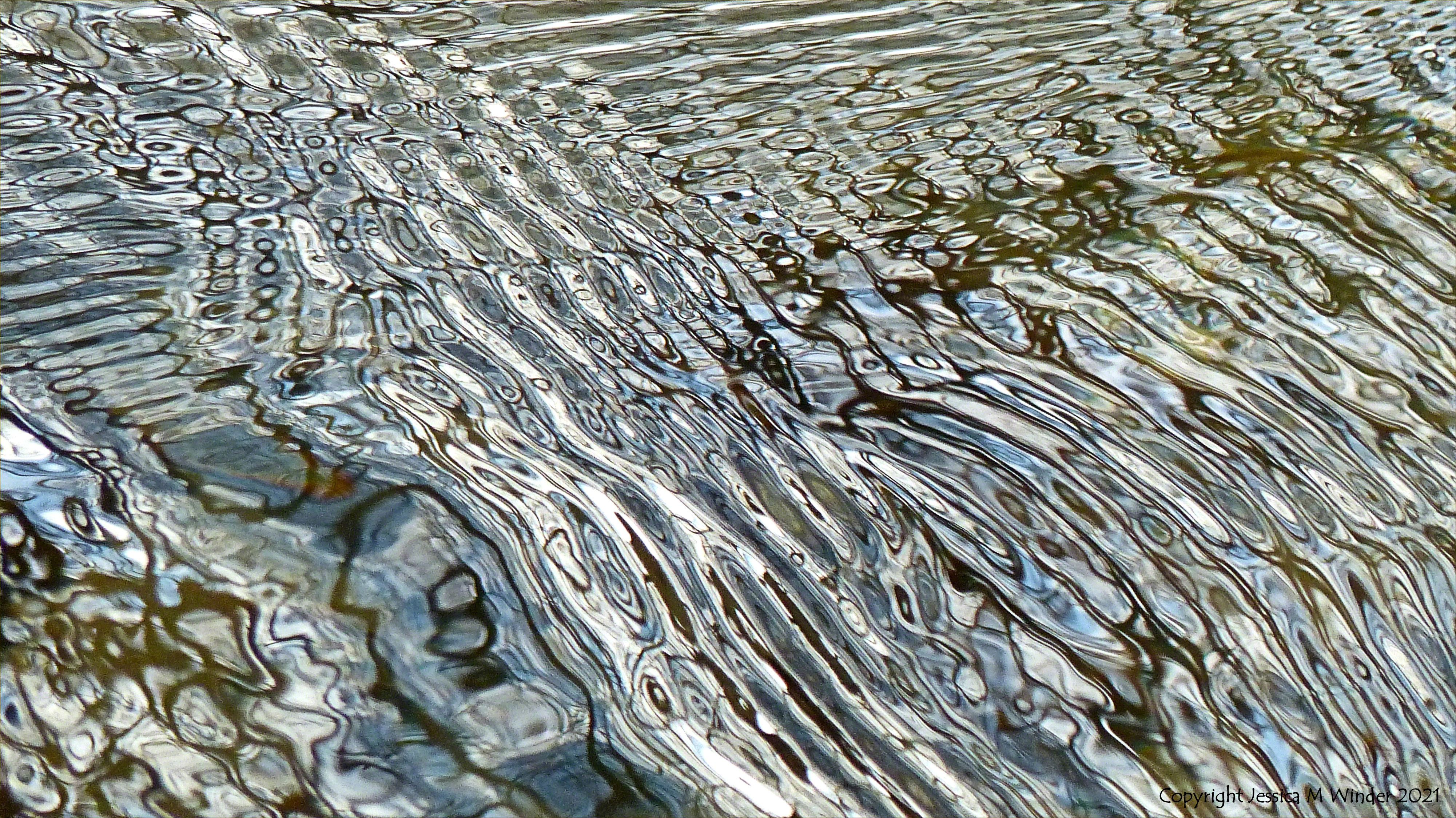 Natural patterns of reflection and texture on the surface of fast-flowing water in the Cerne River at Charlton Down in Dorset, 8th March 2021. To the casual glance, the river appears to be sparkling in the sunlight, but a close examination reveals these sparkles are made up of intricate and continually changing patterns of reflected blue sky, white clouds and over-hanging vegetation.