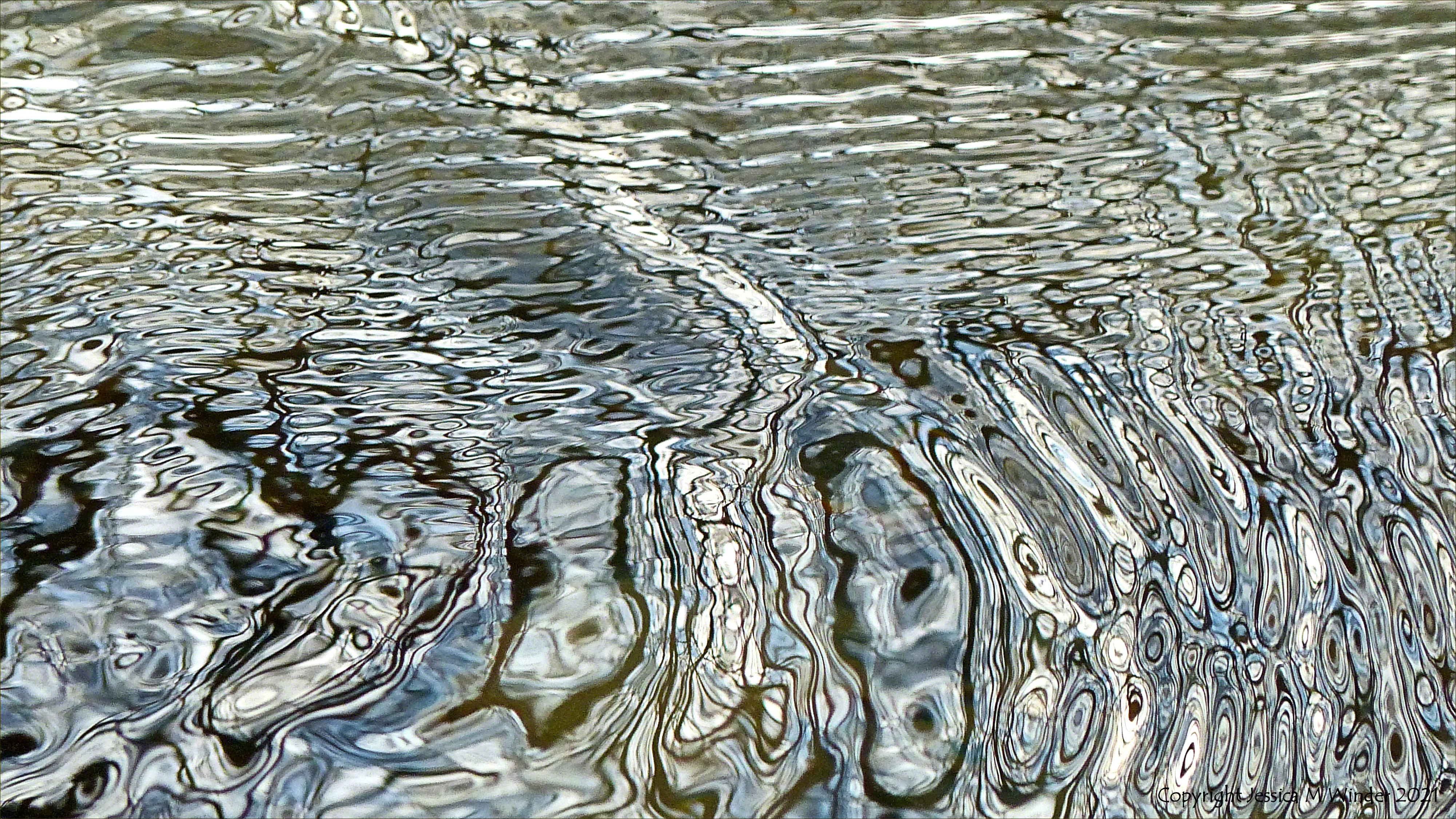 Natural patterns of reflection and texture on the surface of fast-flowing water in the Cerne River at Charlton Down in Dorset, 8th March 2021. To the casual glance, the river appears to be sparkling in the sunlight, but a close examination reveals these sparkles are made up of intricate and continually changing patterns of reflected blue sky, white clouds and over-hanging vegetation.