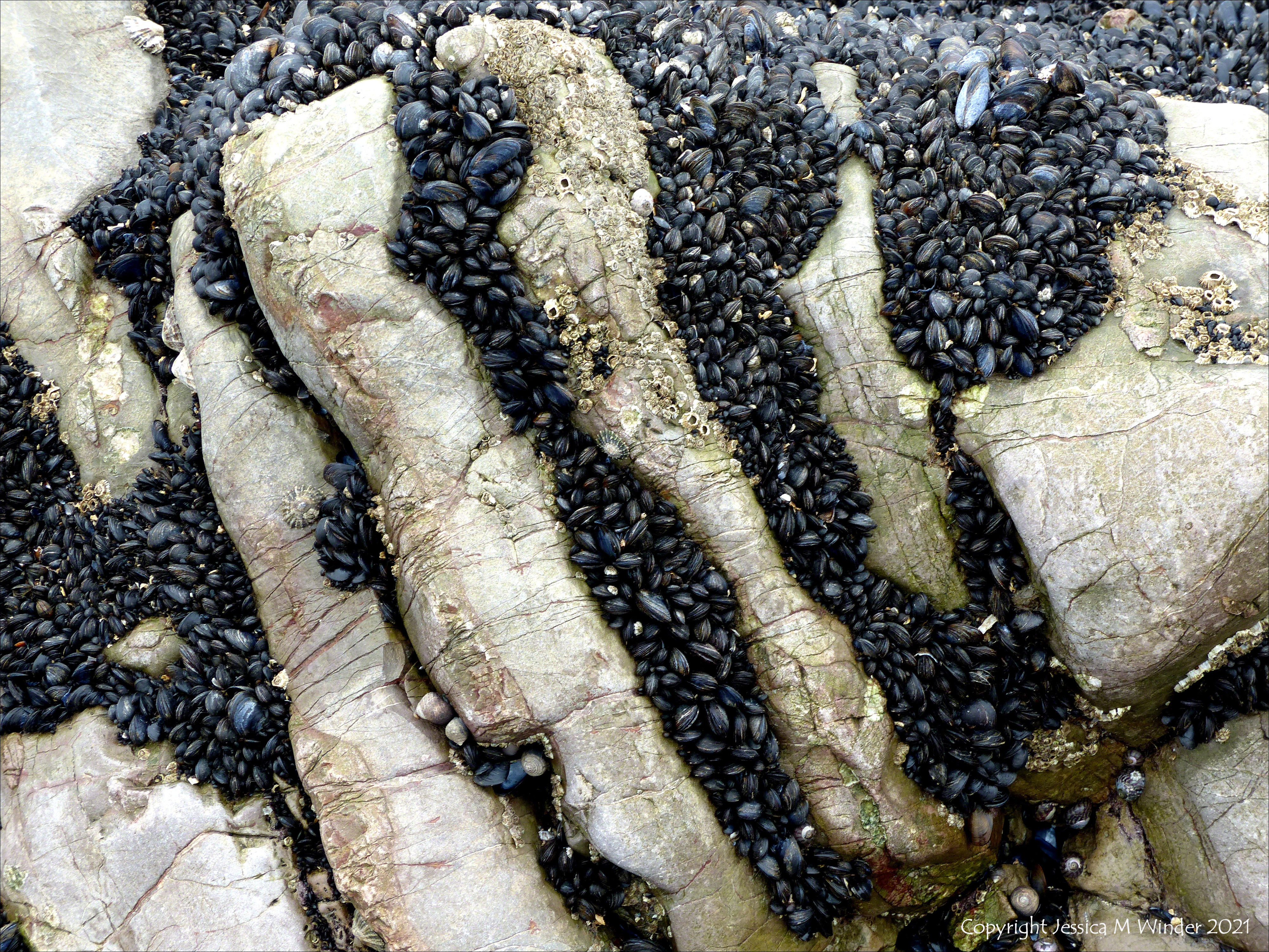 Natural abstract vaguely-geometrical monochrome patterns of living mussels growing in the cracks, crevices, and gullies of Carboniferous limestone outcropping on the Worm’s Head Causeway at Rhossilli Bay on Gower, South Wales, April 2017.
