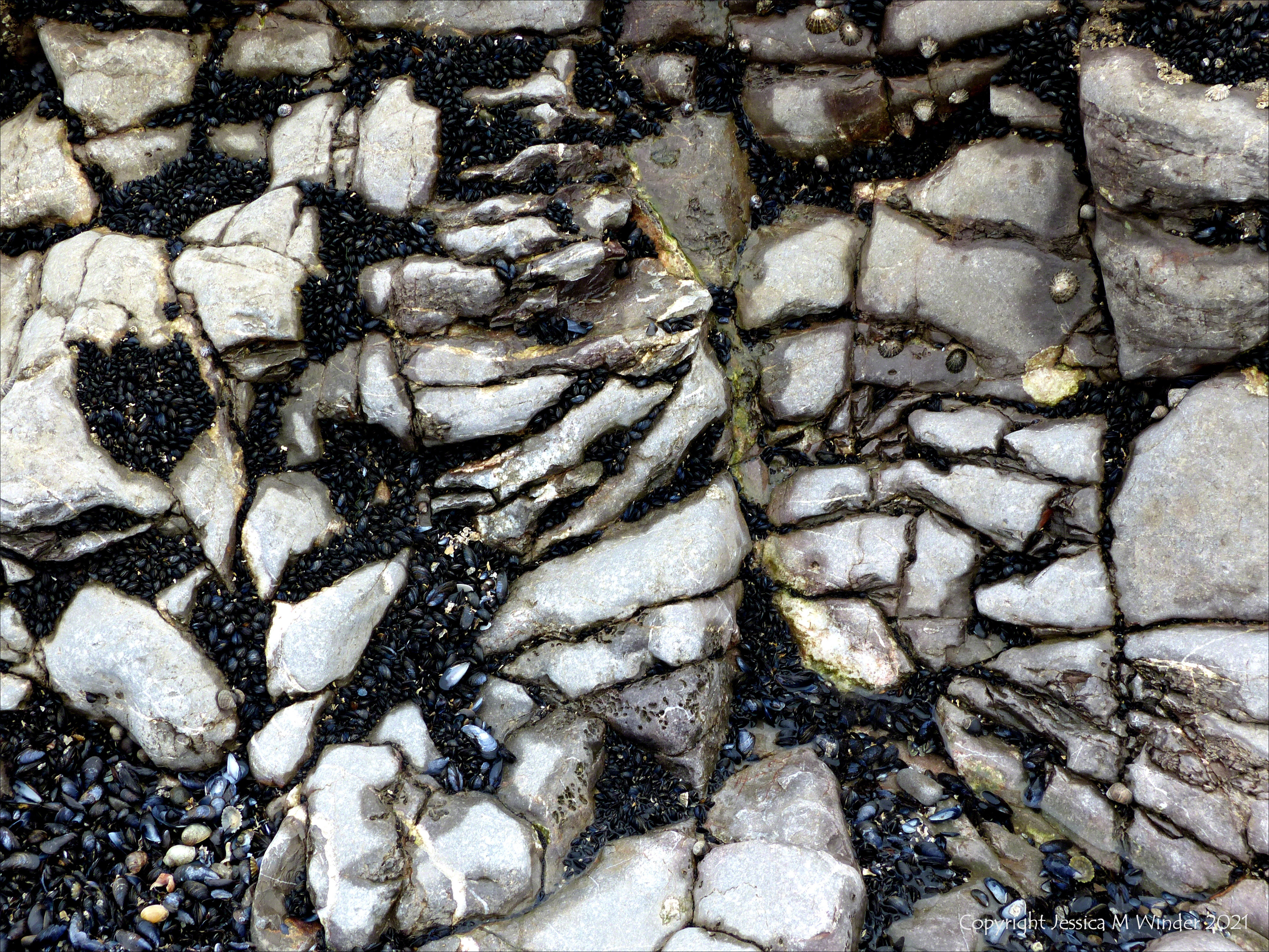 Natural abstract vaguely-geometrical monochrome patterns of living mussels growing in the cracks, crevices, and gullies of Carboniferous limestone outcropping on the Worm’s Head Causeway at Rhossilli Bay on Gower, South Wales, April 2017.