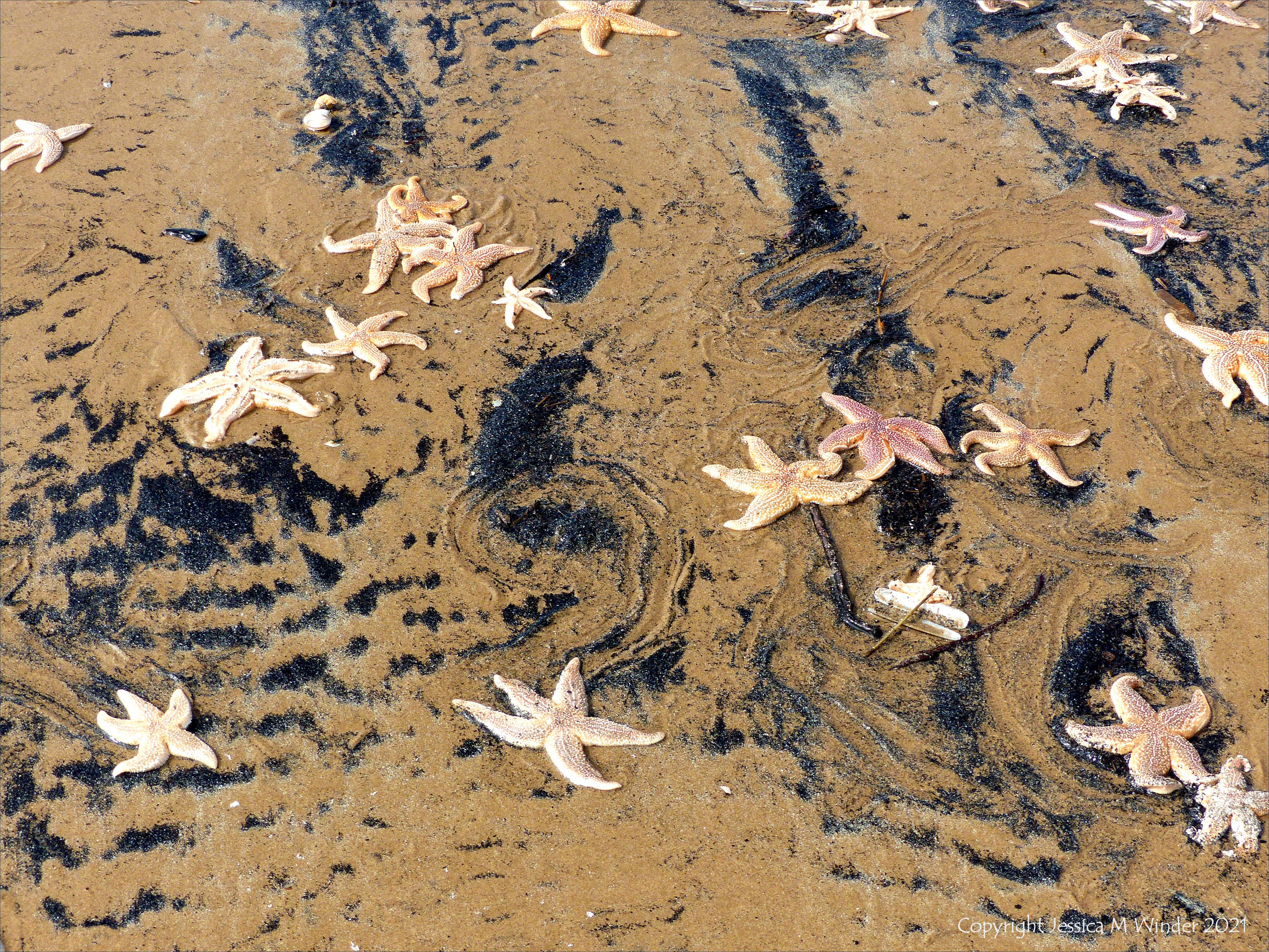 Patterns of black sediment on yellow sand at low tide on the beach. Photographed at Rhossili Bay in Gower, South Wales, April 2017.