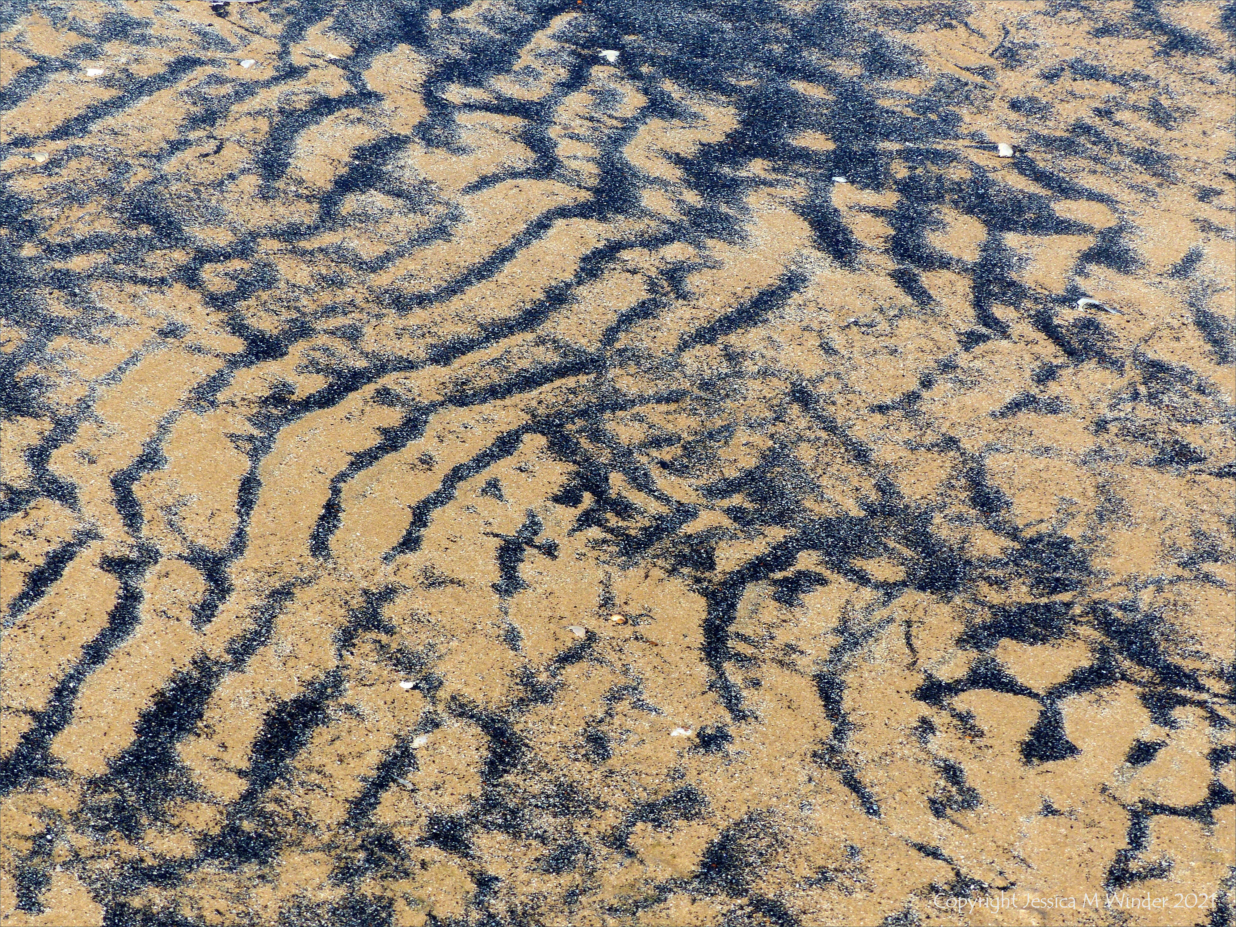 Patterns of black sediment on sand at low tide