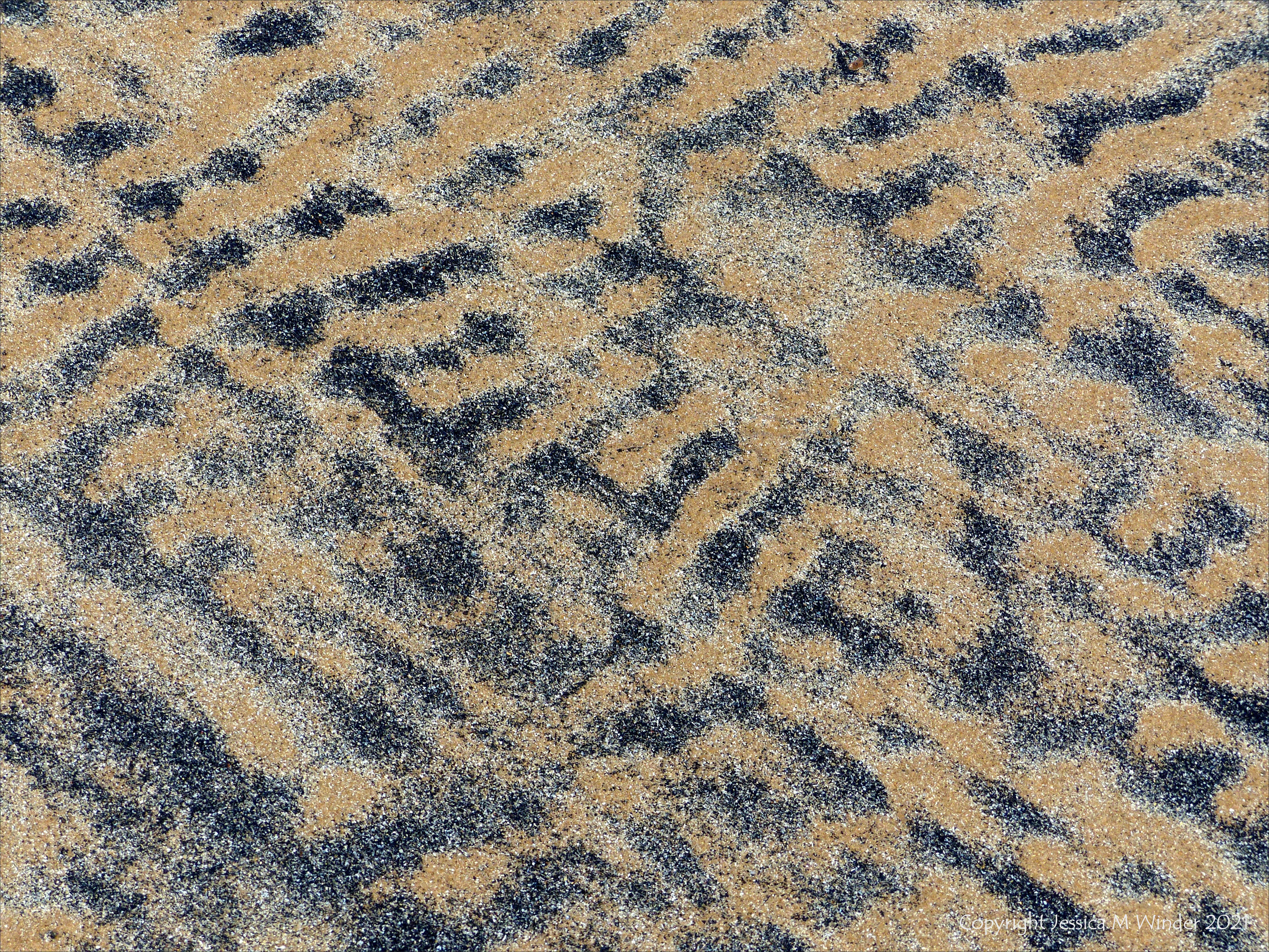 Patterns of fine particle black drift detritus on intertidal sand at Rhossili Bay in Gower, South Wales April 2017