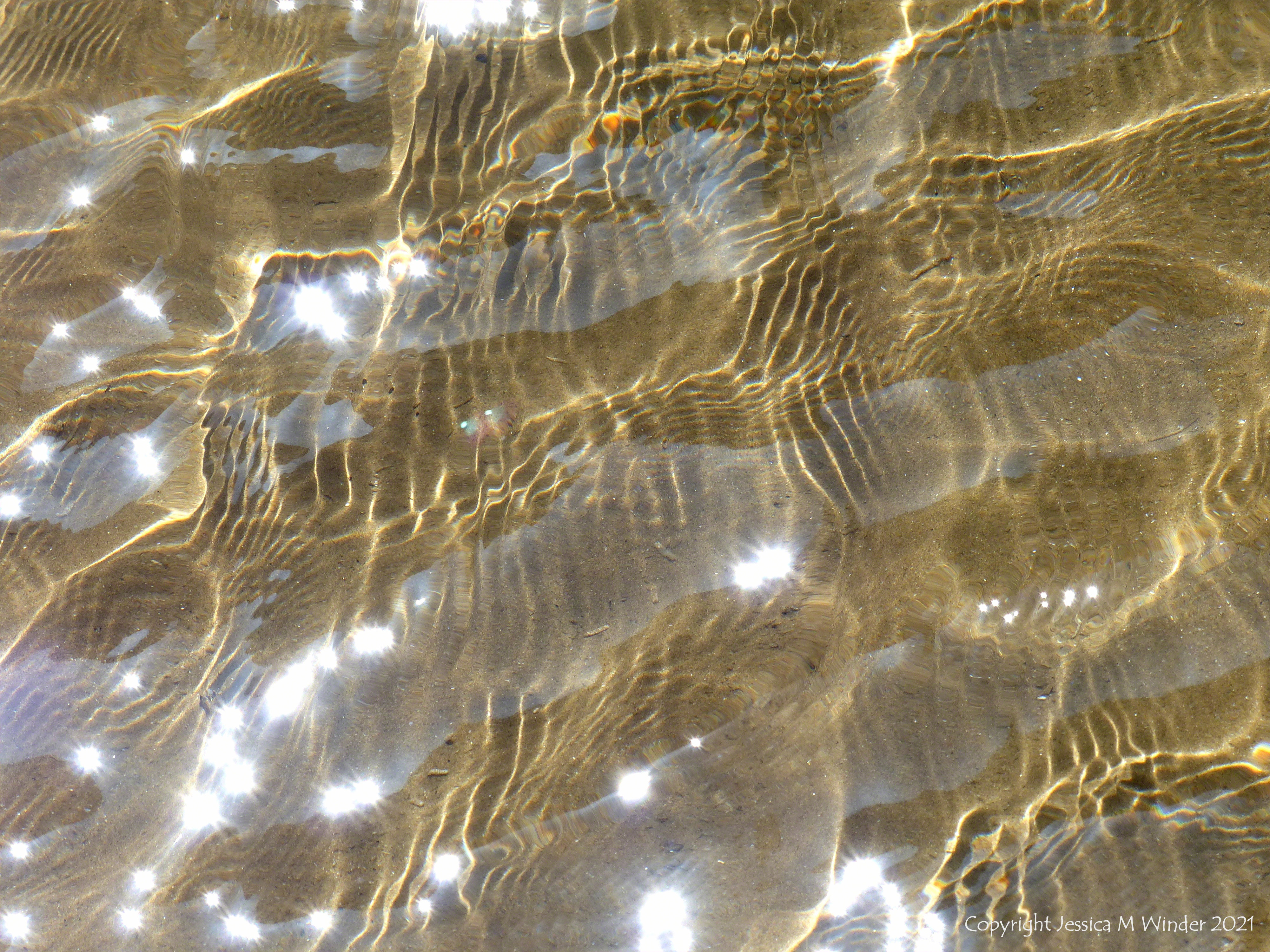 Natural patterns of reflected light with sparkles on the flowing water of the stream called Diles Lake that runs from Llangennith marshes to Rhossili beach, Gower, South Wales, April 2017.