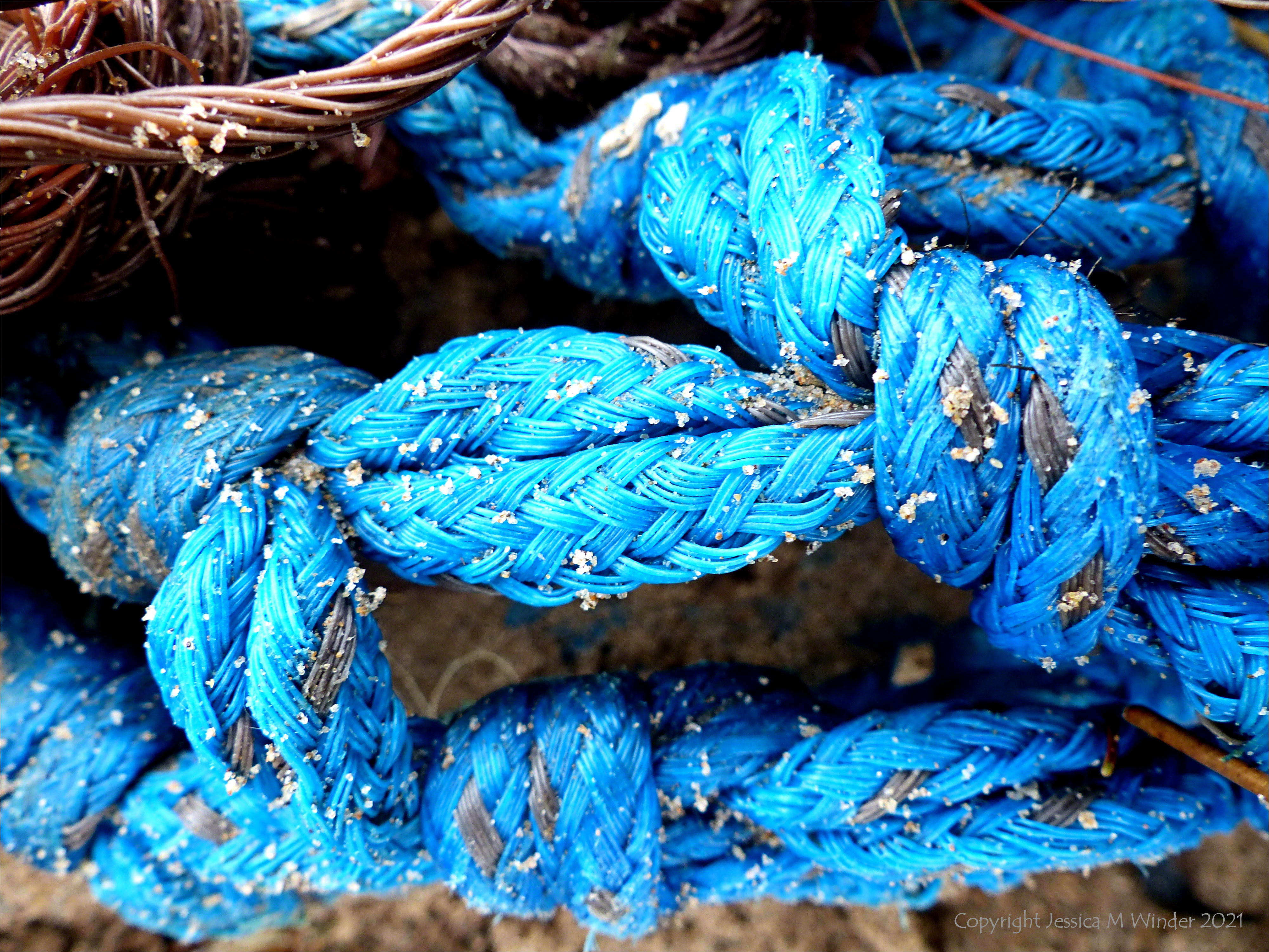Flotsam 14 RBGPSW March 2015 Multi-coloured fishing net washed up as flotsam on the beach at Rhossili Bay, Gower, South Wales, March 2015