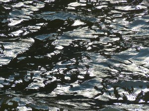 Natural abstract patterns of light reflected on the surface of deep flowing water in the tidal reaches of the River Thames in central London, October 2015