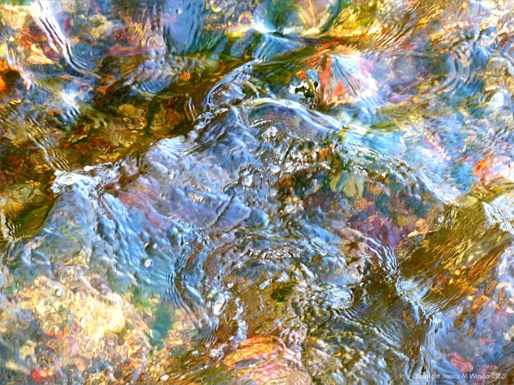 Water texture and colour in the River Cerne just above the sluice at Forston, Dorset, 19 April 2021, showing coloured stones and weed just below the surface.