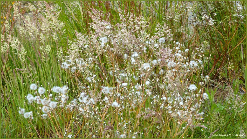 The white fluffy seed heads look like smaller versions of the more familiar dandelion clocks so I am guessing that the plants are members of the Taraxacum Family. Unfortunately there are over 230 species, or rather forms and micro-species, within this group in Britain and they are not easy to identify, especially from a photograph, as the differences are small and nuanced. A good starting point would be the Botanical Society of Britain and Ireland guide to identification if you have the time.