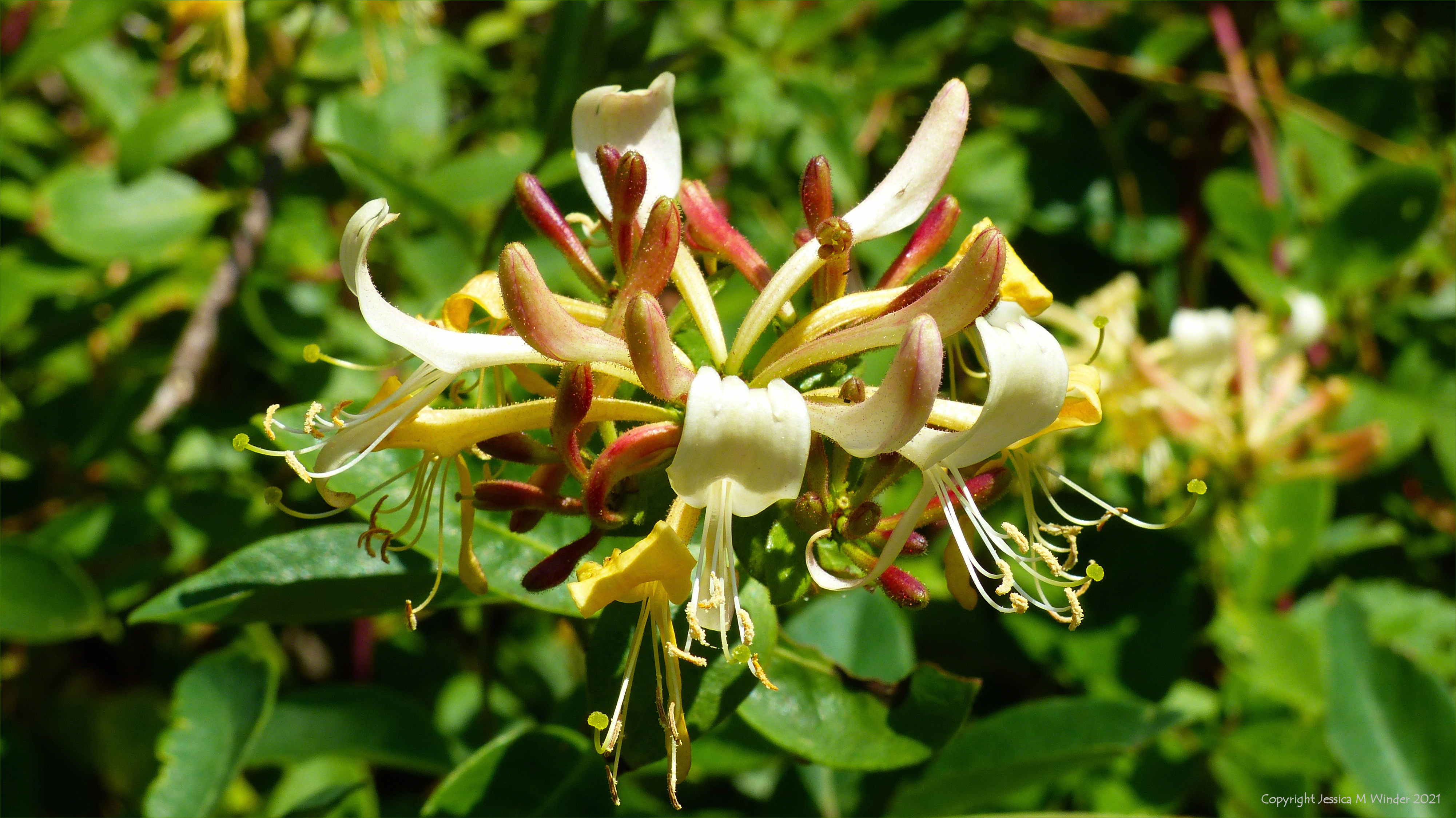 Dunes at Pembrey 4 The undergrowth below one group of pine trees planted on the dunes in Pembrey Forest near Llanelli in Carmarthenshire was extremely varied and beautiful. The Forestry Commission planted the trees here between 1929 and 1954 as part of a programme to replace woods cut down to supply timber for the two World Wars. I am not sure to what extent the forest floor may have been deliberately planted or whether the vegetation colonised naturally. At one point along the path, there is a large stand of honeysuckle which was in full fragrant bloom at the time of my visit on 17 July 2021. I loved the way that the free-roaming flowering foliage contrasted with the regimented columns of the pine tree trunks.