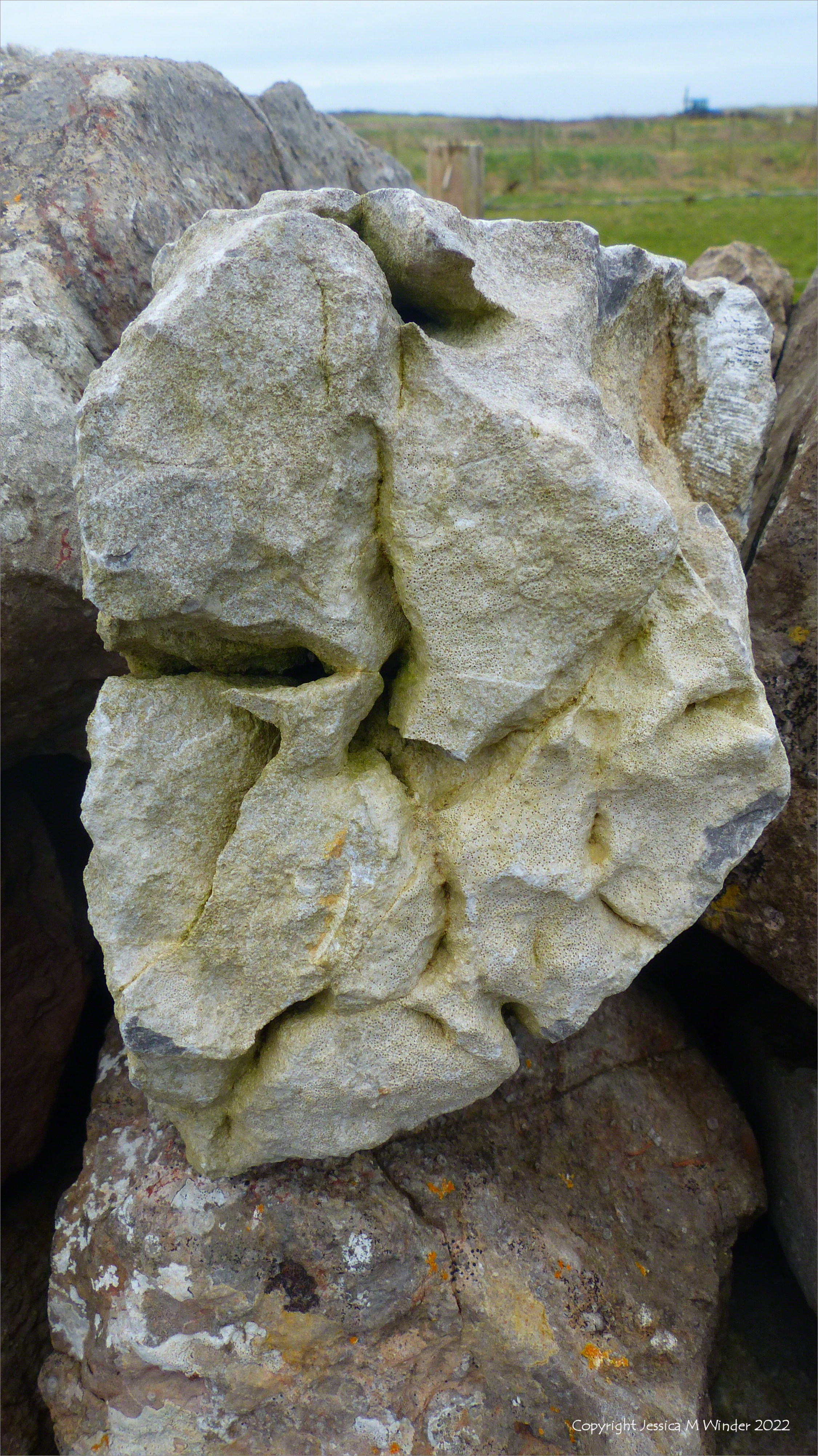 I wonder why the central pale rock looks the way it does with its irregular furrows? It seems to be an odd one amongst the others in the dry stone wall.