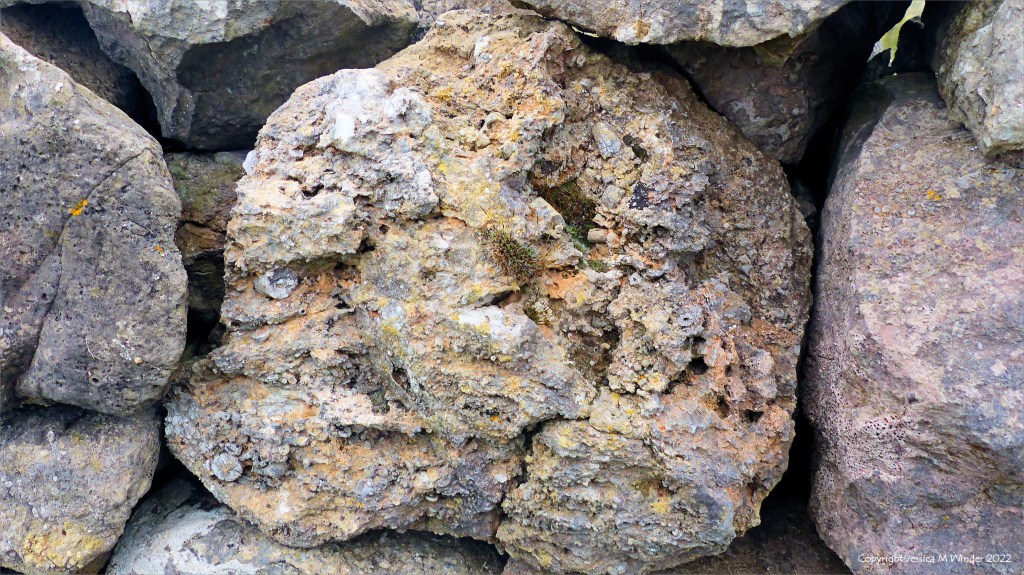 The character of the wall changes regularly as you walk along the path on the Rhossili headland towards Worms Head. The occasional limestone boulder in the drystone wall is crammed full of fossils, again mostly crinoids and corals in fragmentary state. In this particular stone some of the hollower areas of the rough surface have moss growing.