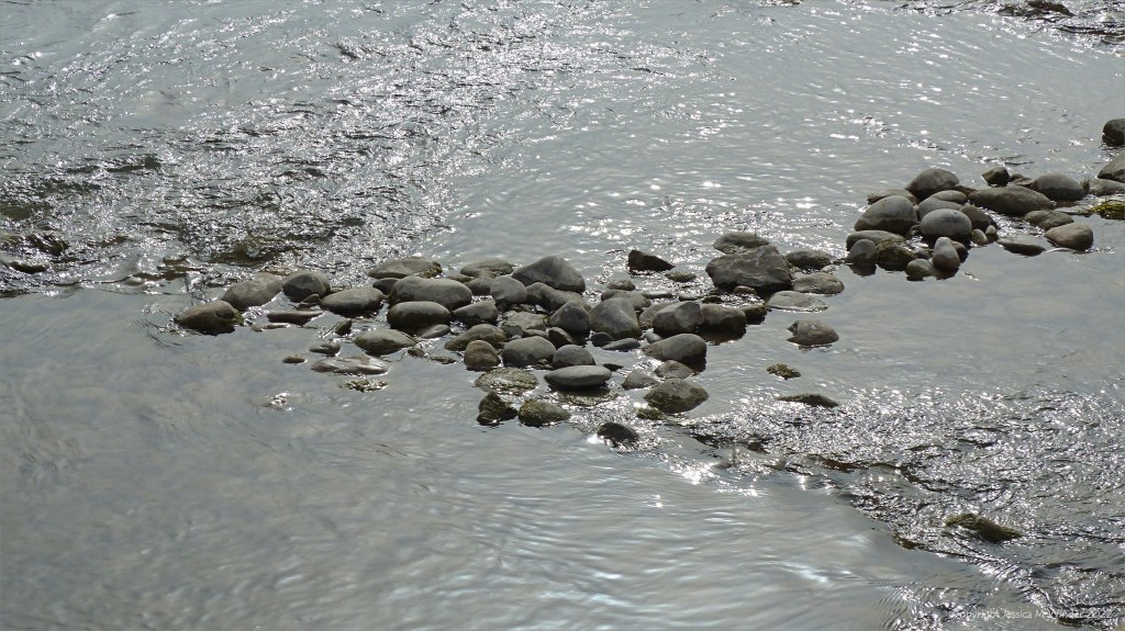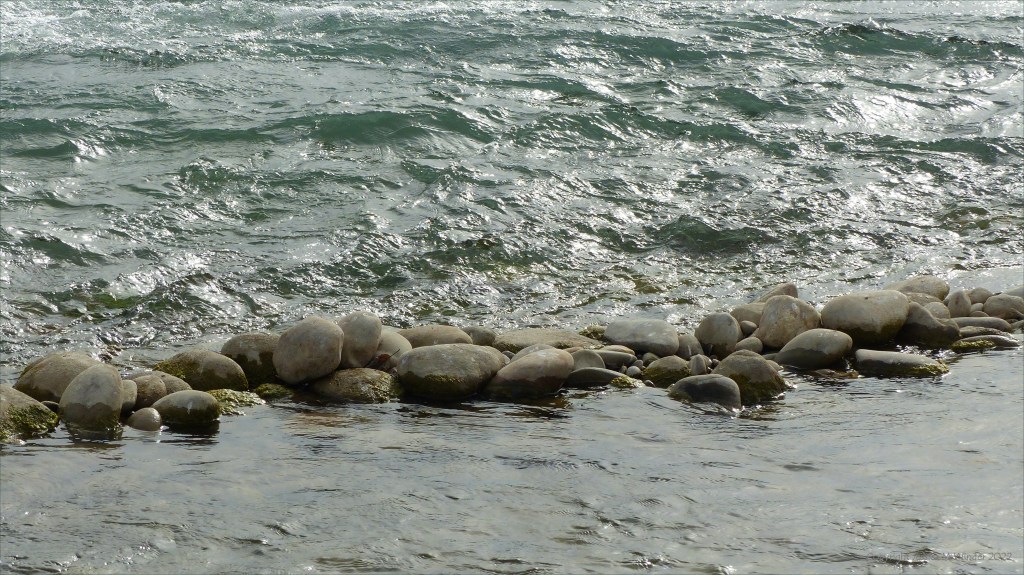 Accumulations of pebbles along the margins of the river section off pools of shallow, calmer water from the turbulent fast-flowing main channel in the Durance River in Provence, France.