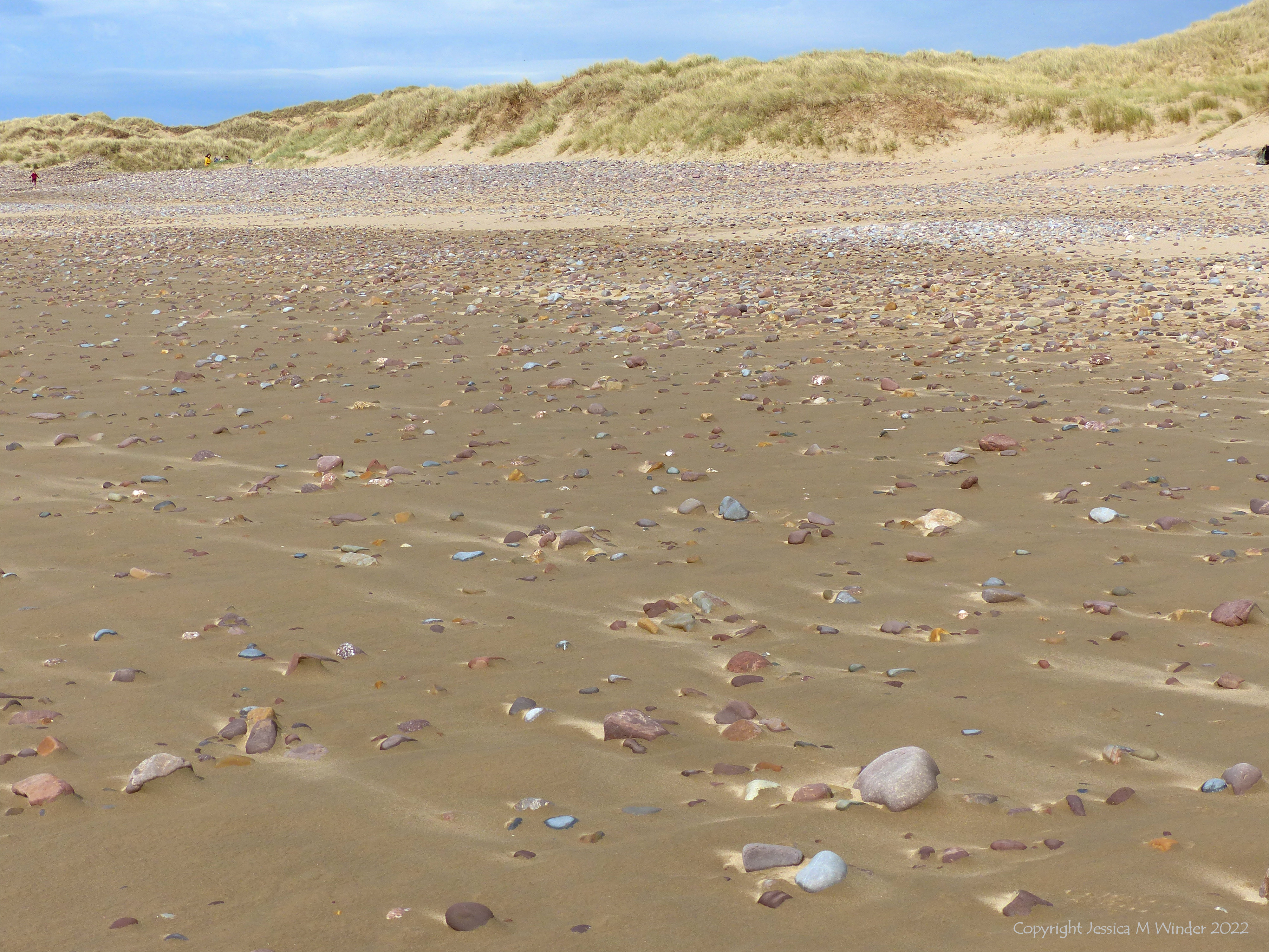 Gale force winds and rough seas heaved sand up the shore to partially cover the multicoloured pebbles and stones at the top of the beach. The sand was still compacted and wet from the outgoing tide but was starting to dry around the edges of the rocks in the strong winds. Rhossili Bay, Gower, South Wales, April 2022.