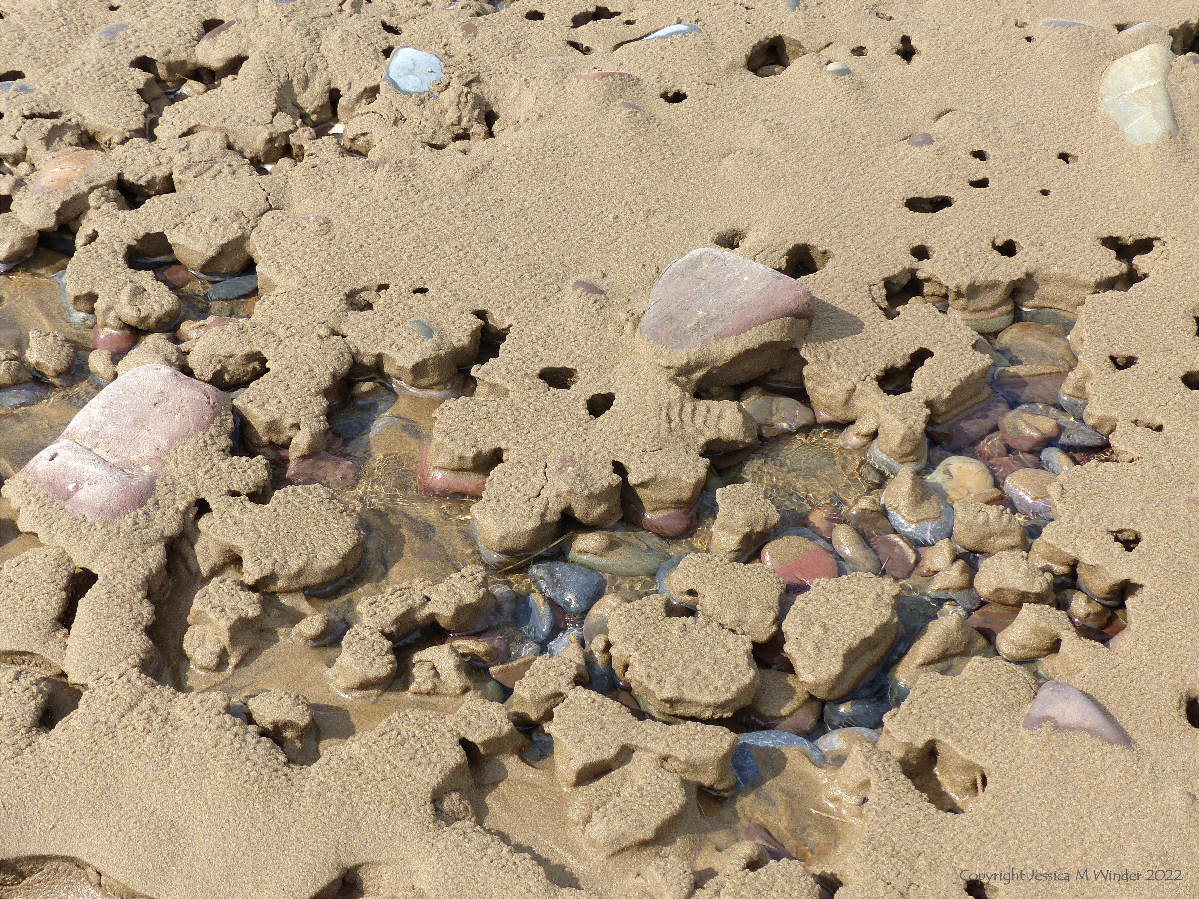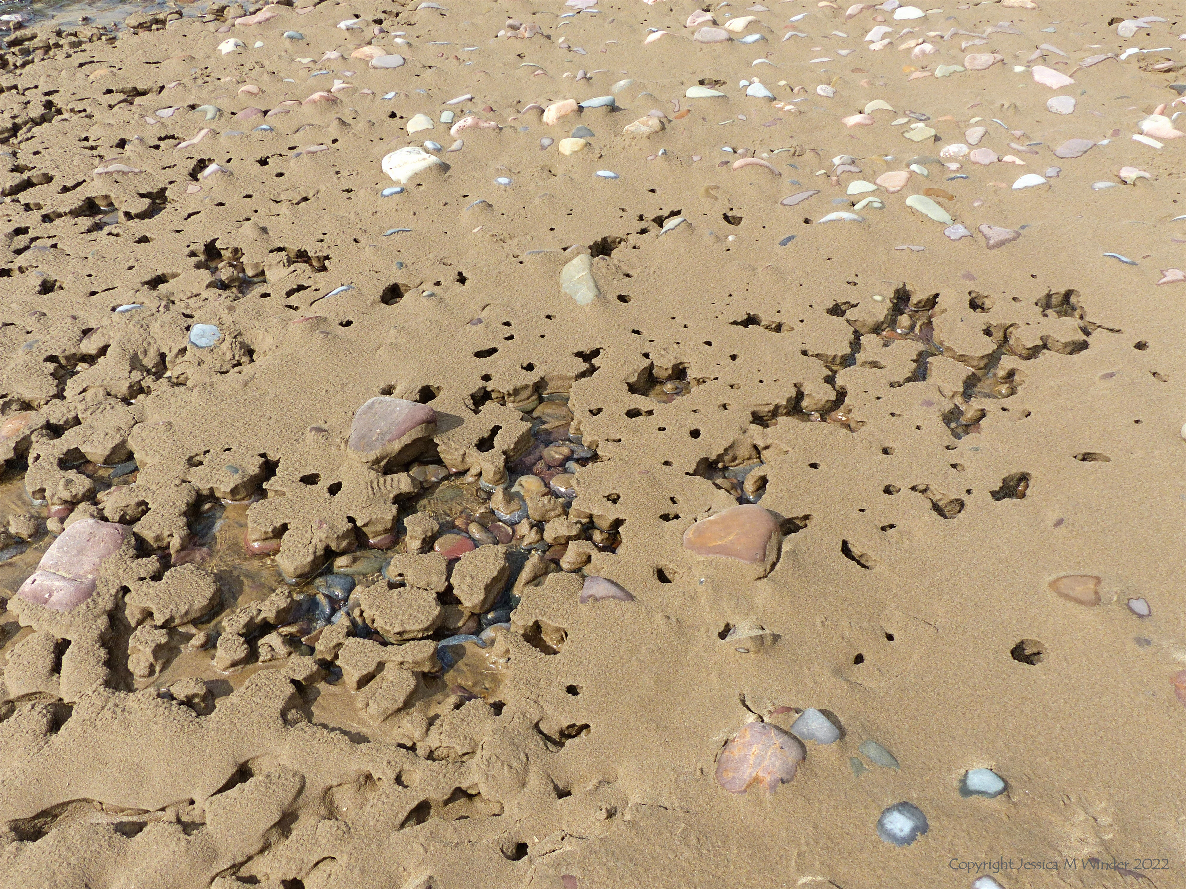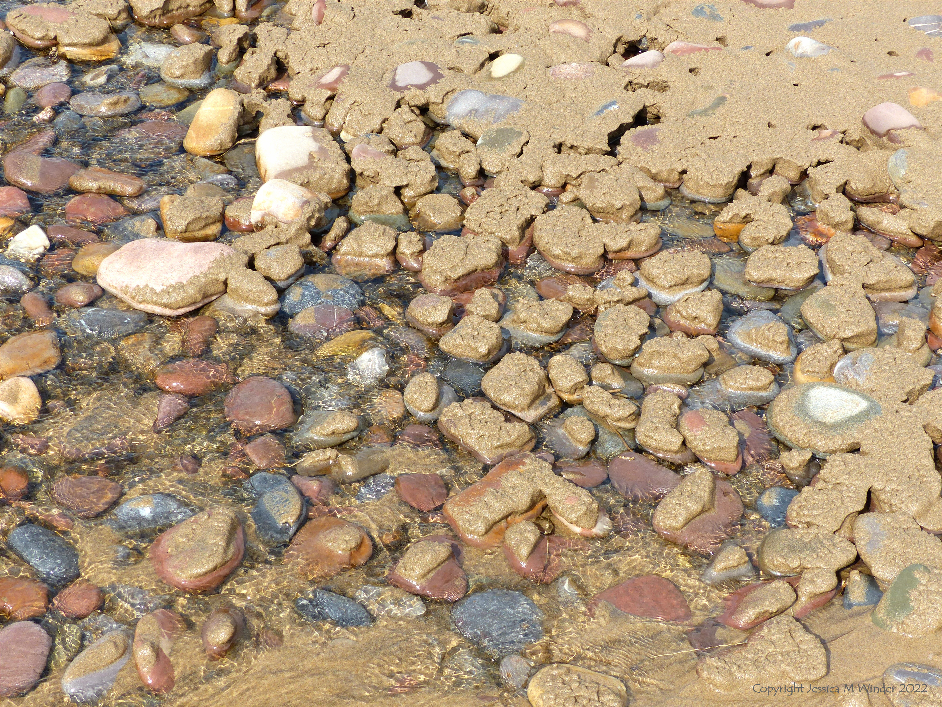 Further along Rhossili beach on that very windy day, a stream was flowing through the dunes and down across the shore to the retreating sea. The fast-flowing shallow water was gradually washing away the newly deposited sand from around the colourful beach stones, leaving caps of wet textured sand deposited on their surfaces.