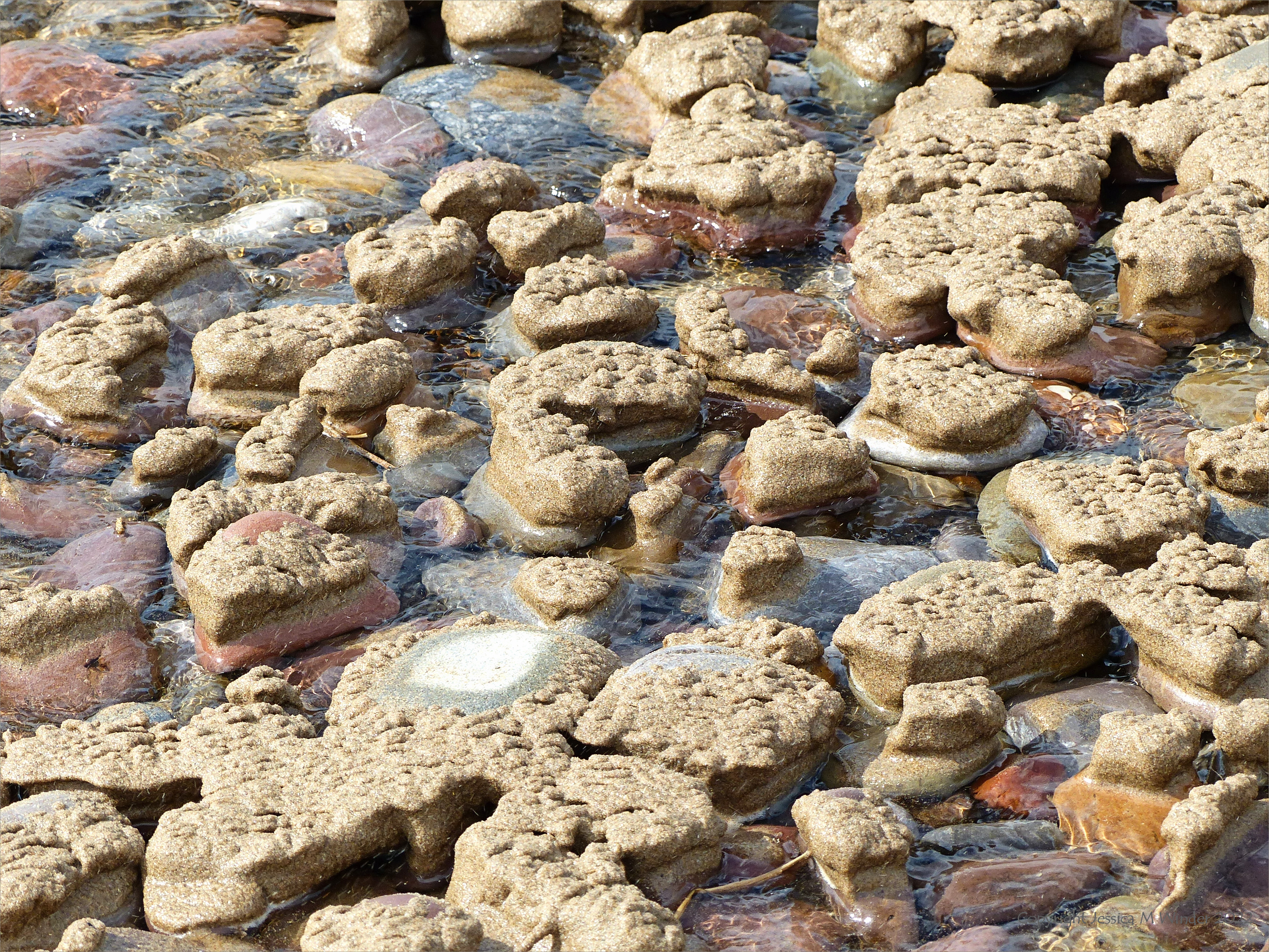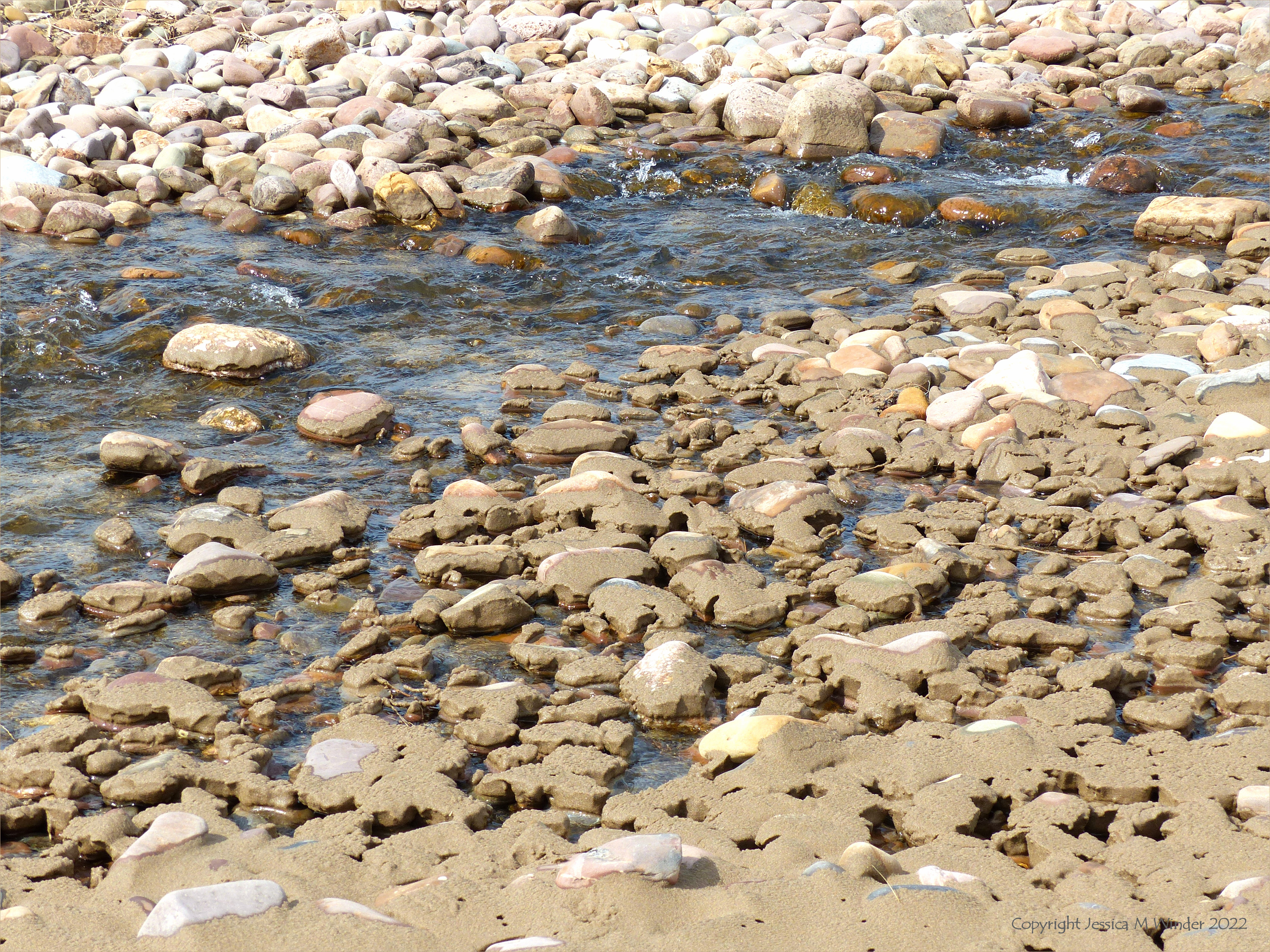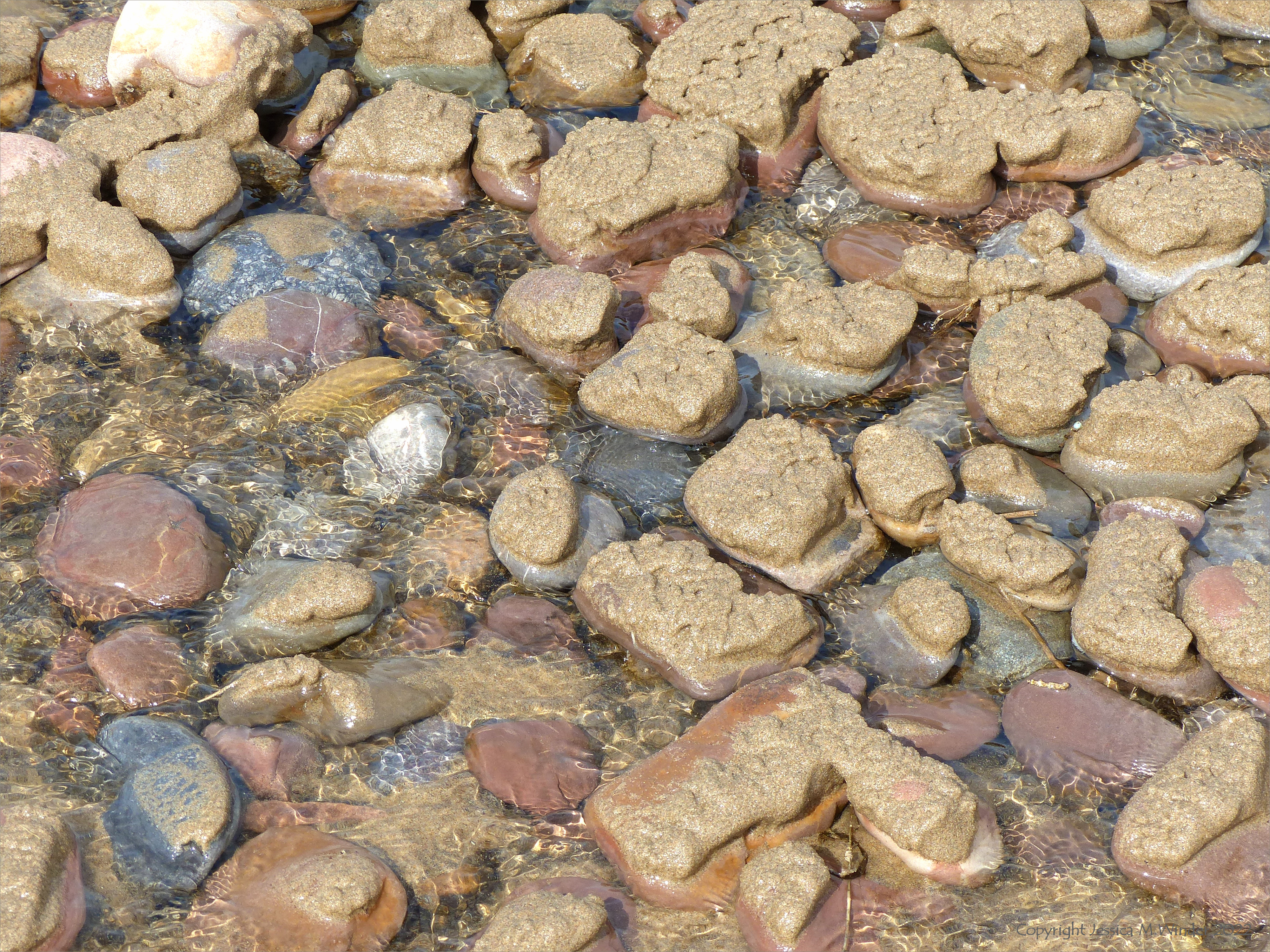 Further along Rhossili beach on that very windy day, a stream was flowing through the dunes and down across the shore to the retreating sea. The fast-flowing shallow water was gradually washing away the newly deposited sand from around the colourful beach stones, leaving caps of wet textured sand deposited on their surfaces.