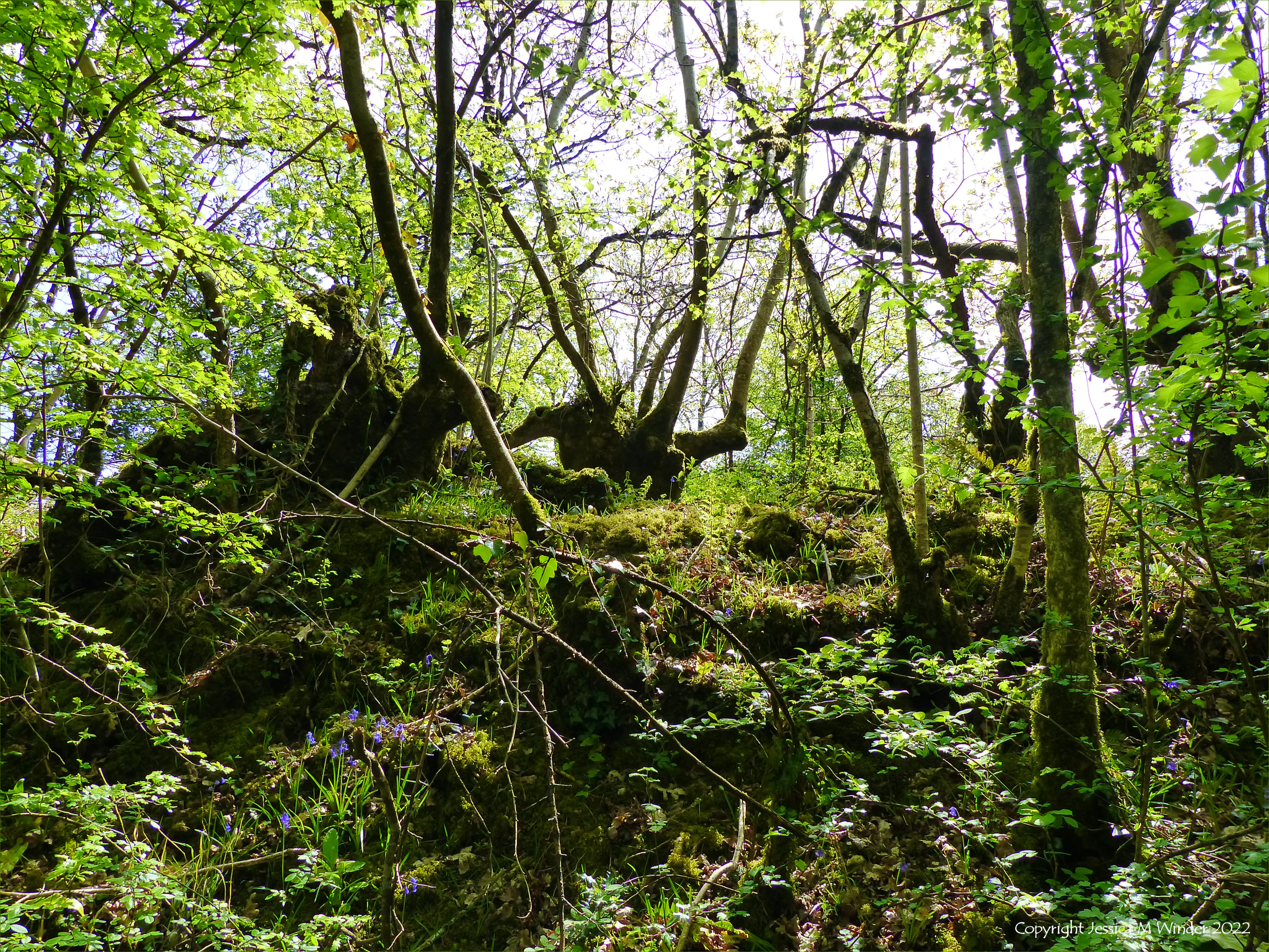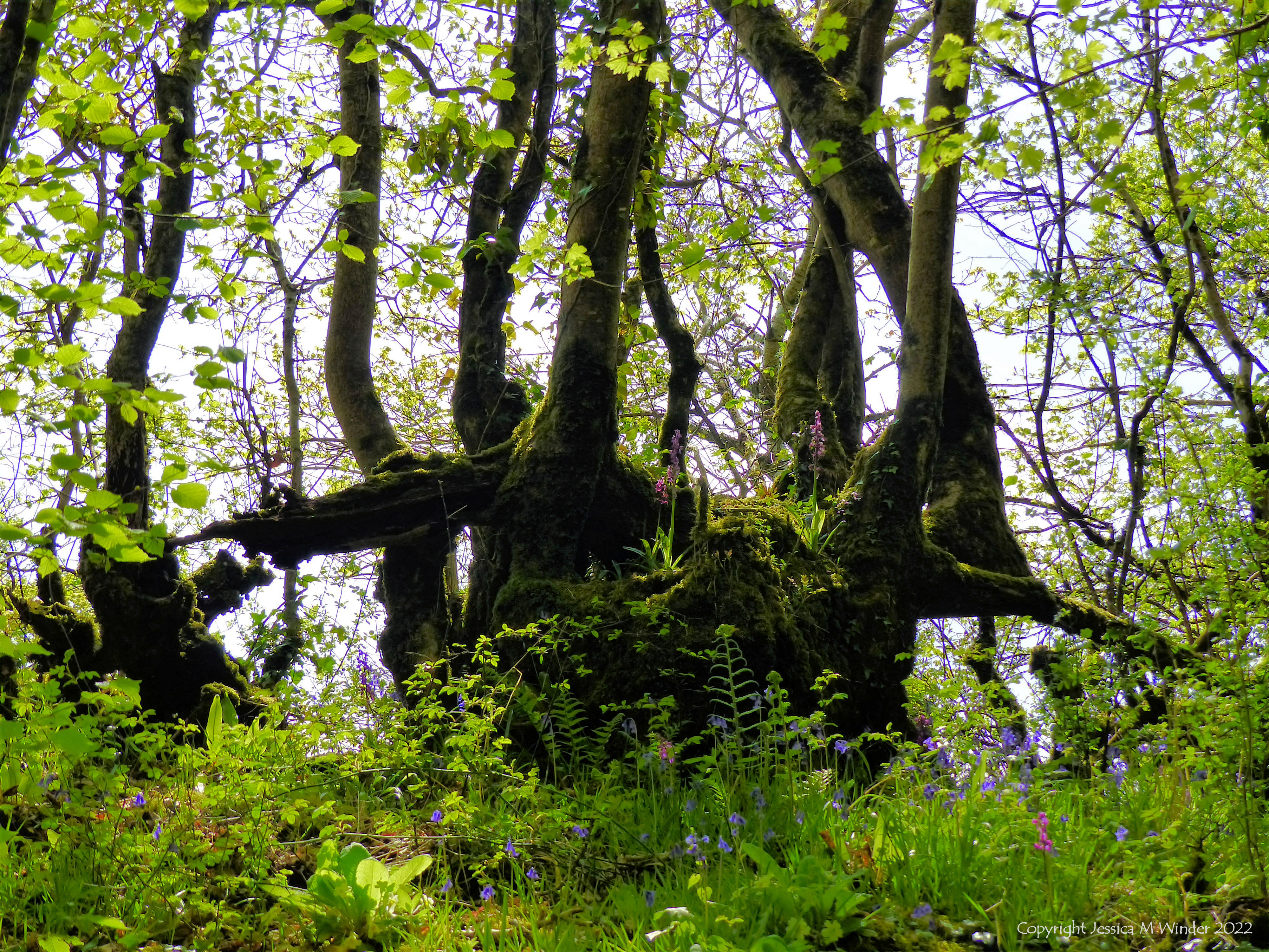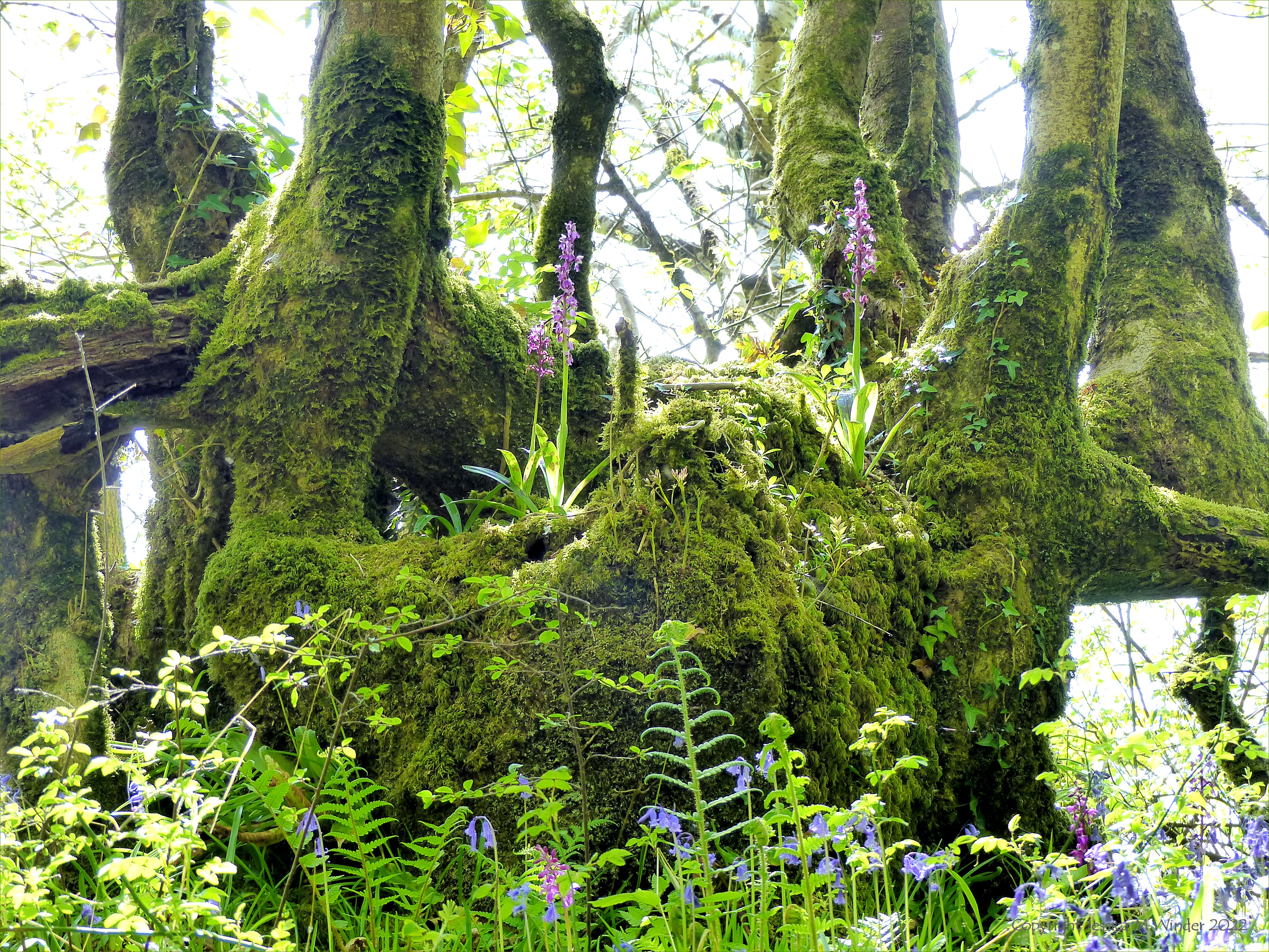 On the top of the banks that line a sunken lane, not quite a hollow way, are ancient trees with strange shapes. They look as if they have once been part of a hedge which was cut and horizontally laid, but have long since been allowed to mature and re-grow vertical branches. The tree trunks are now deeply covered in moss that has created a place where ferns and orchids thrive. Another wonderful part of the Kingcombe Meadows Nature Reserve.