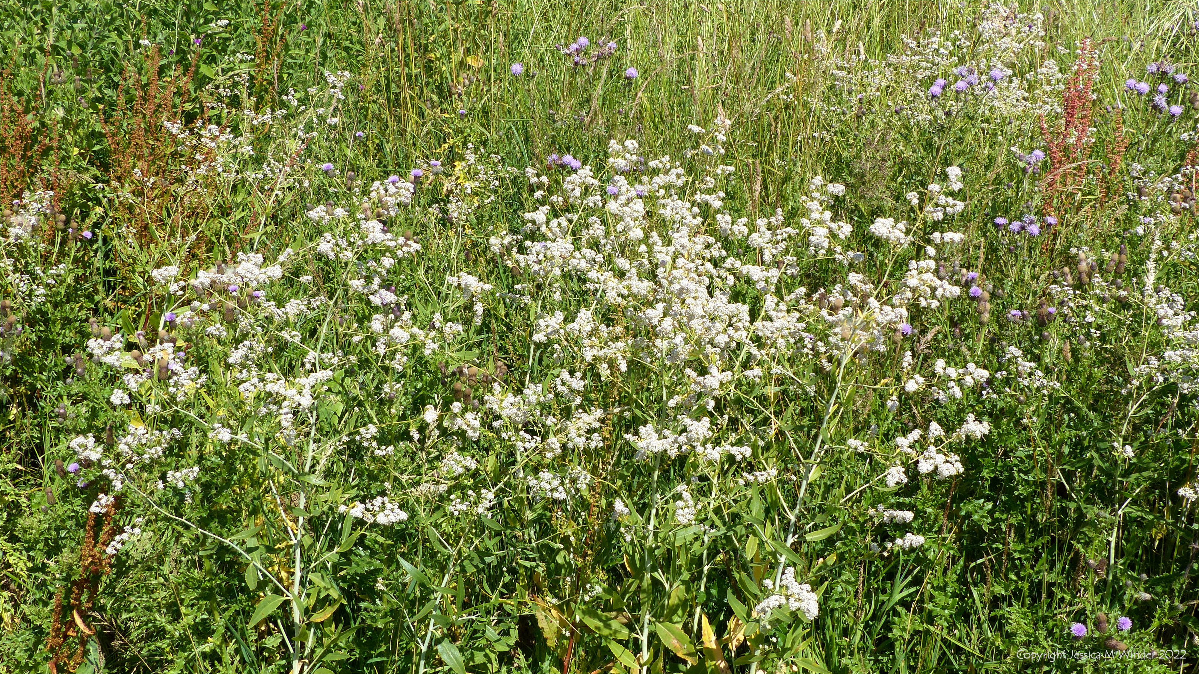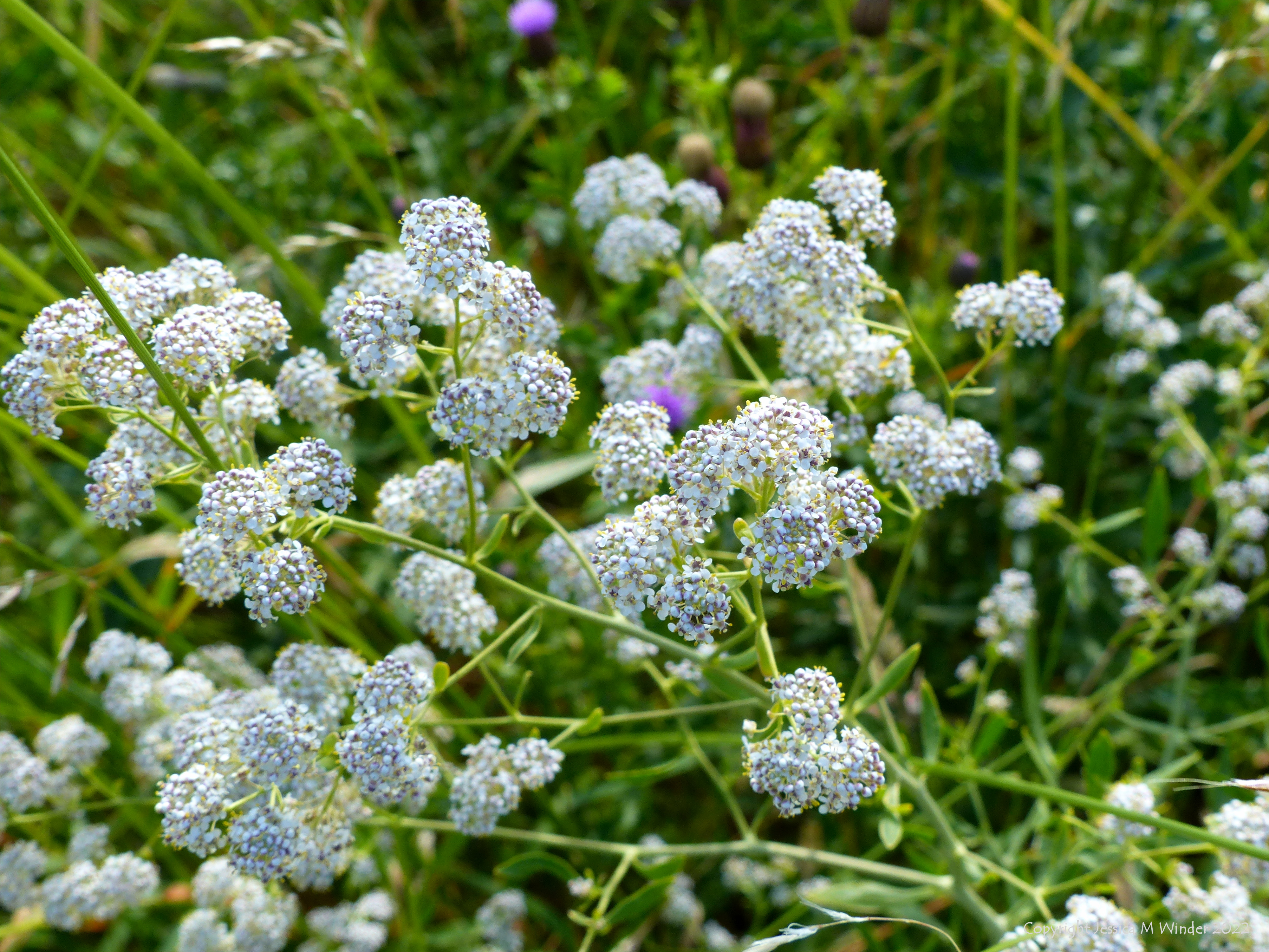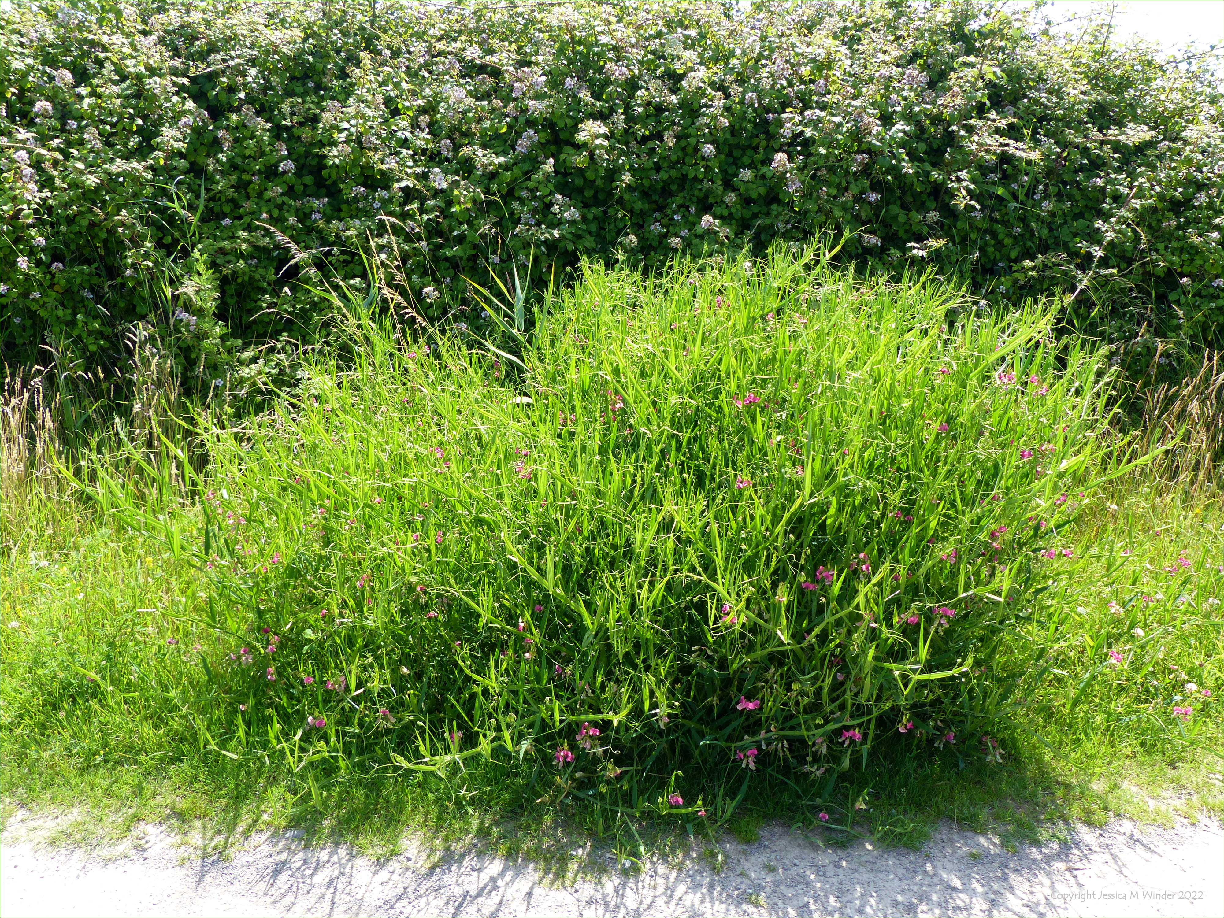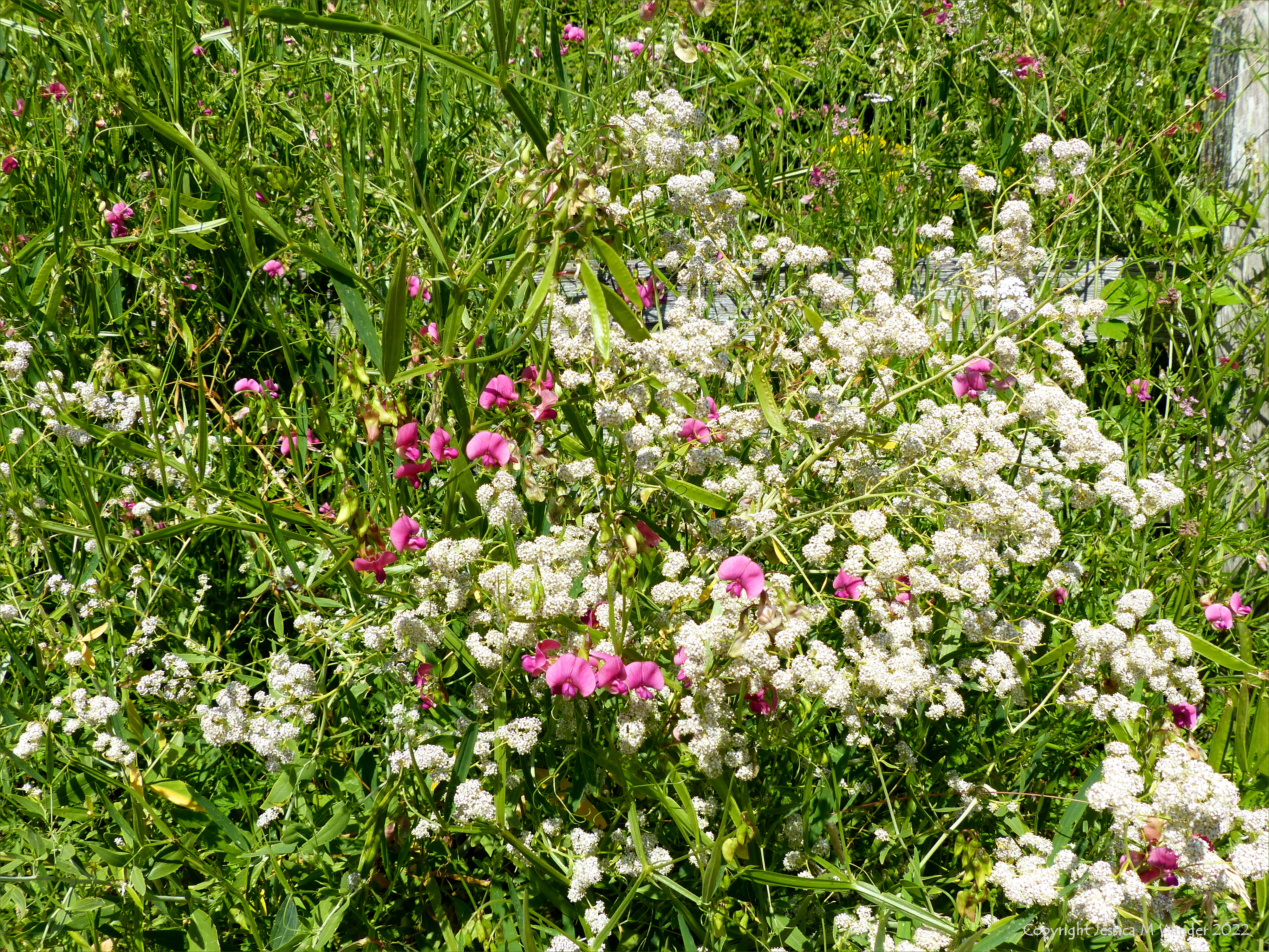 White flowers of Hedge Bedstraw (Gallium mollugo) and pink flowers of Narrow-leaved Everlasting-pea (Lathyrus sylvestris). These two plants occur separately and also entwined together at the Newport Wetlands this July. Either way they looked good. I often wonder to what extent plants grow naturally on these kinds of nature reserves or whether they are judiciously planted.