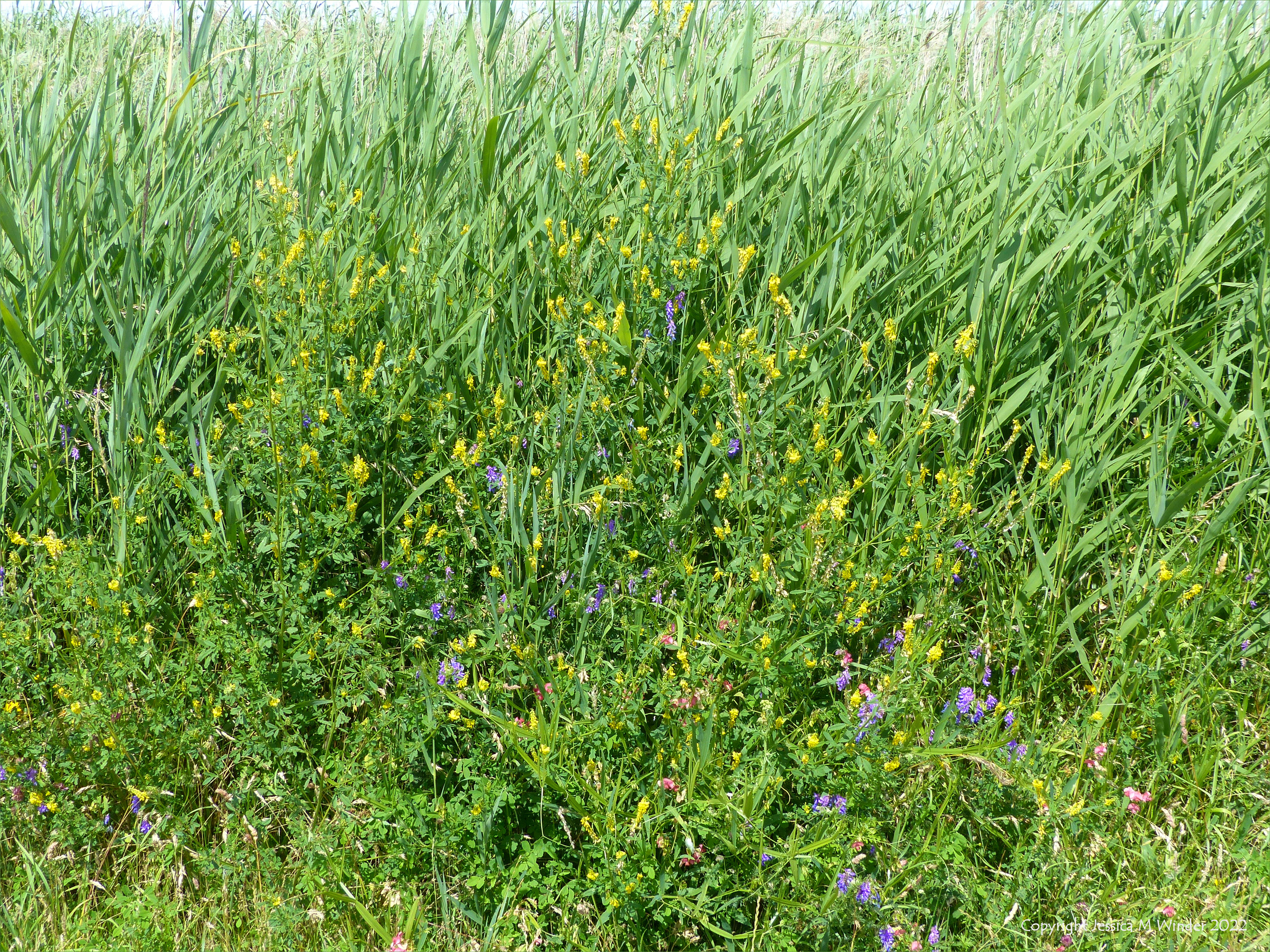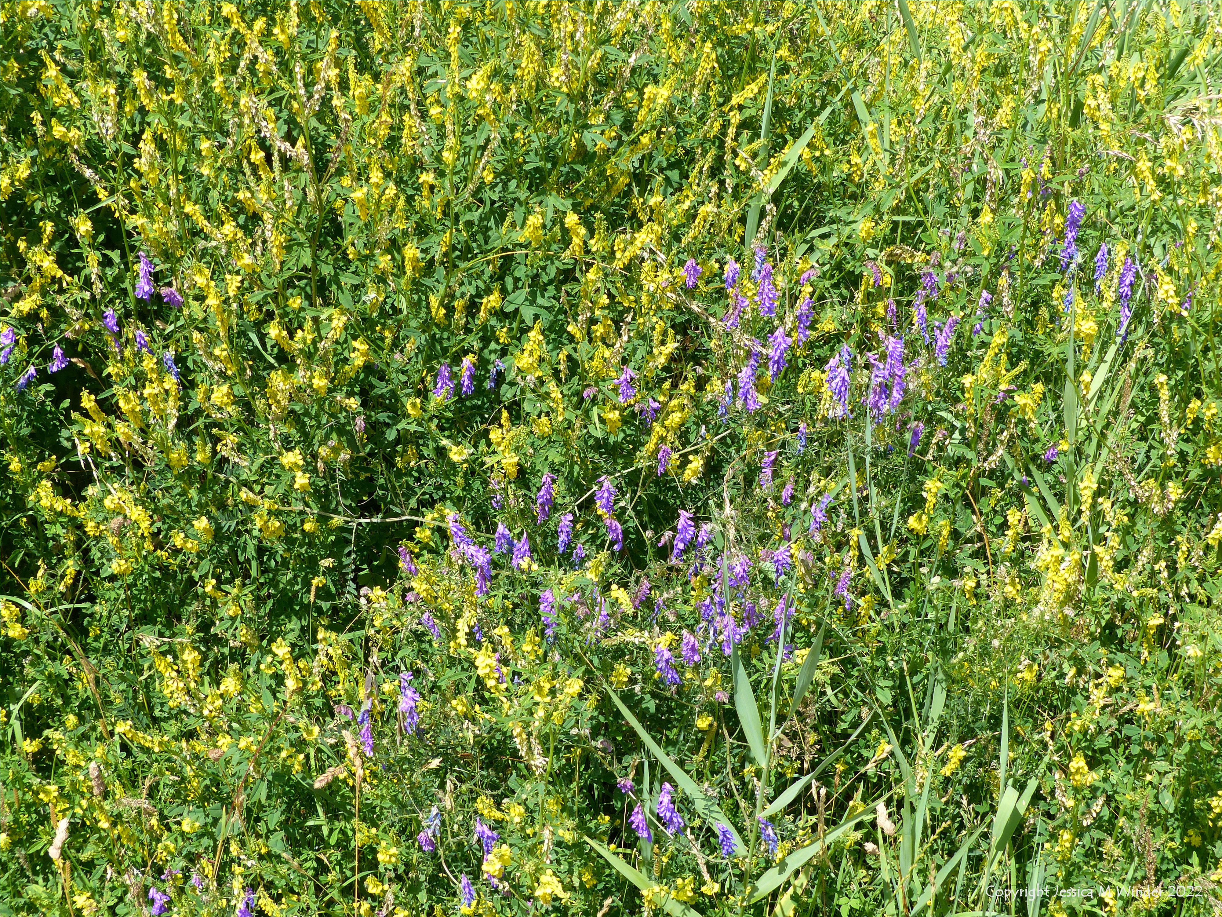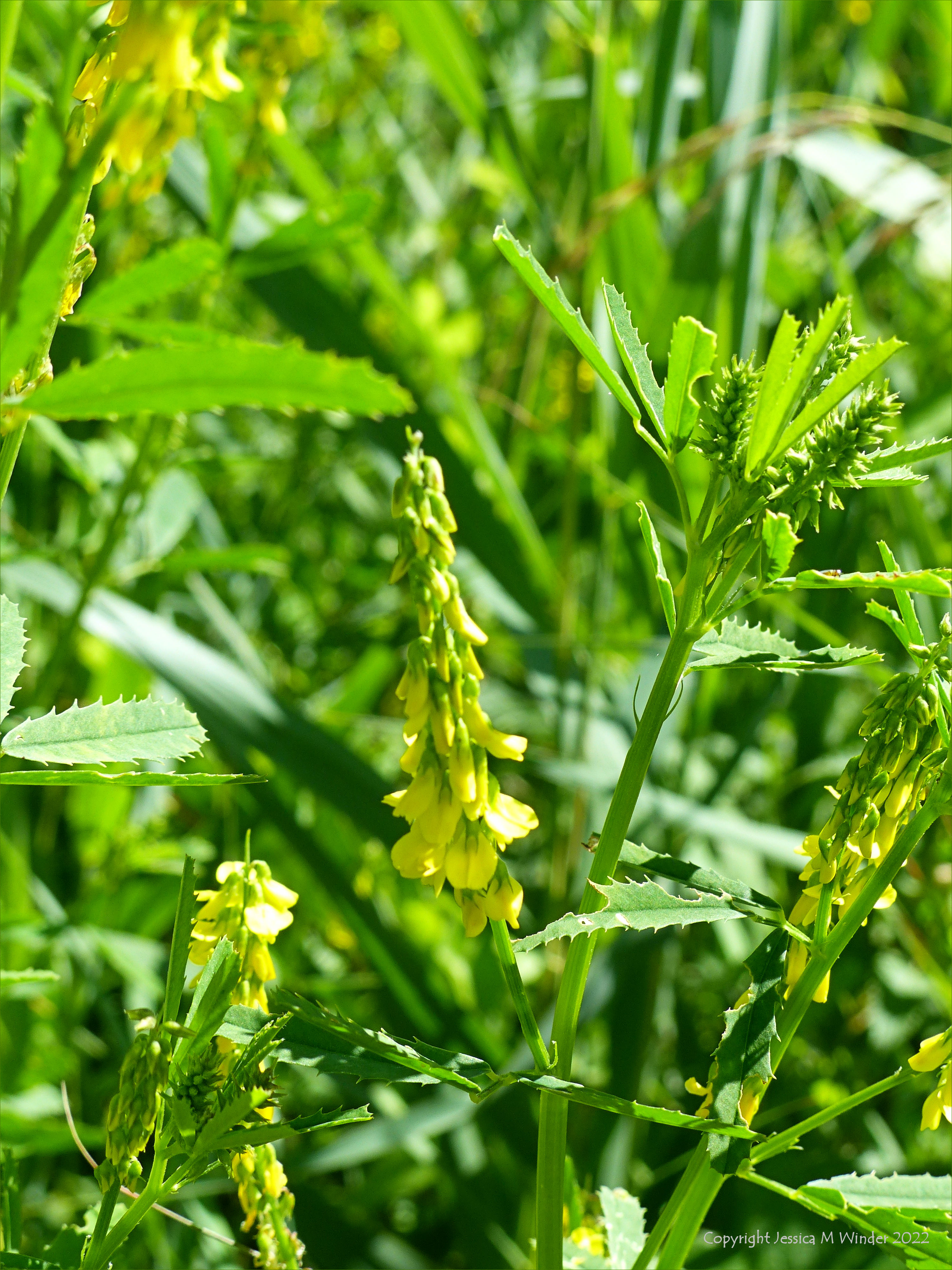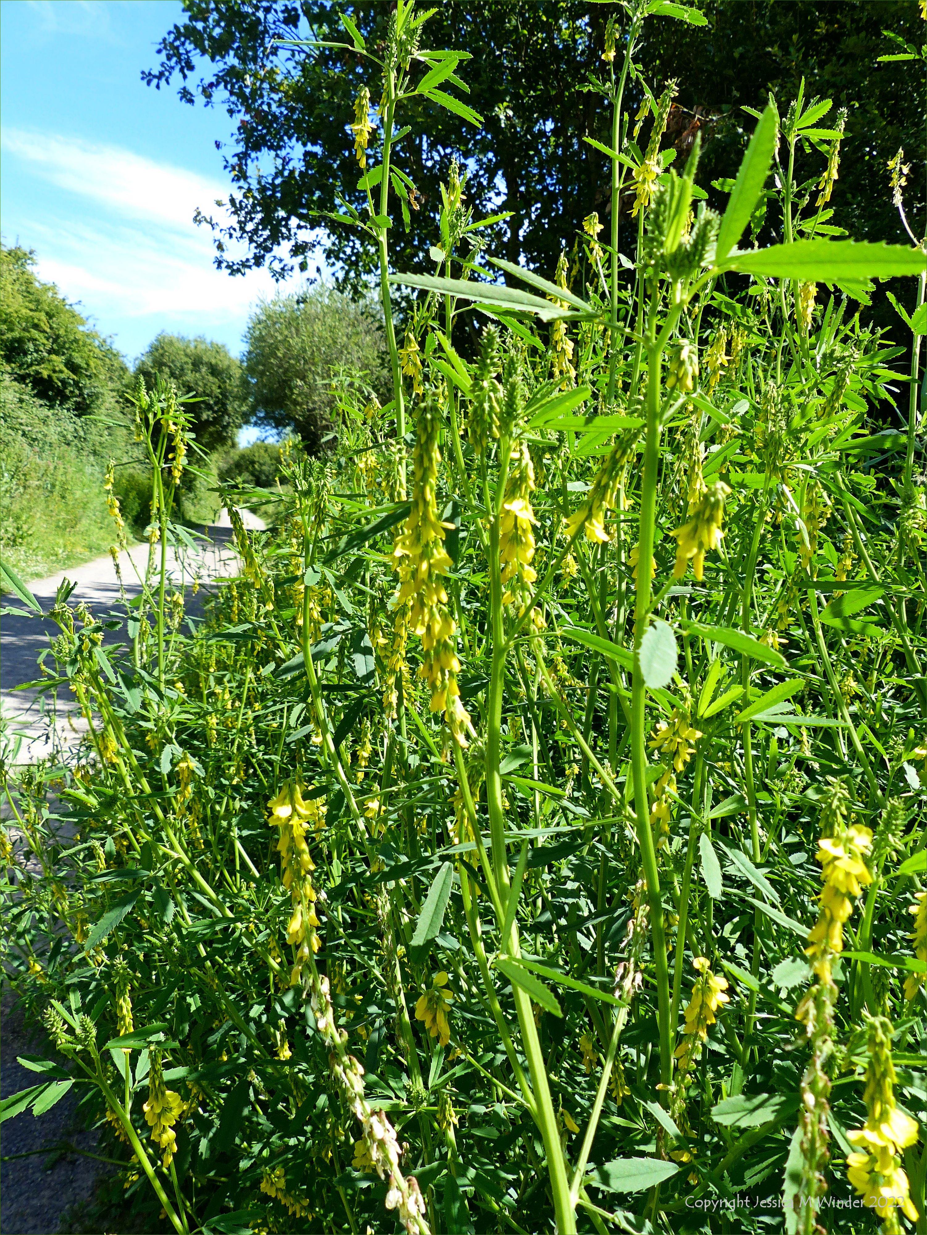 There was a profusion of Ribbed Melilot (Melilotus officinalis) with its spikes of yellow flowers growing at the Newport Wetlands when I visited in July. They seemed to prefer locations along the sides of pathways and sometimes were intermingled with purple flowered Tufted Vetch or the tall blades of the grey-green reeds.