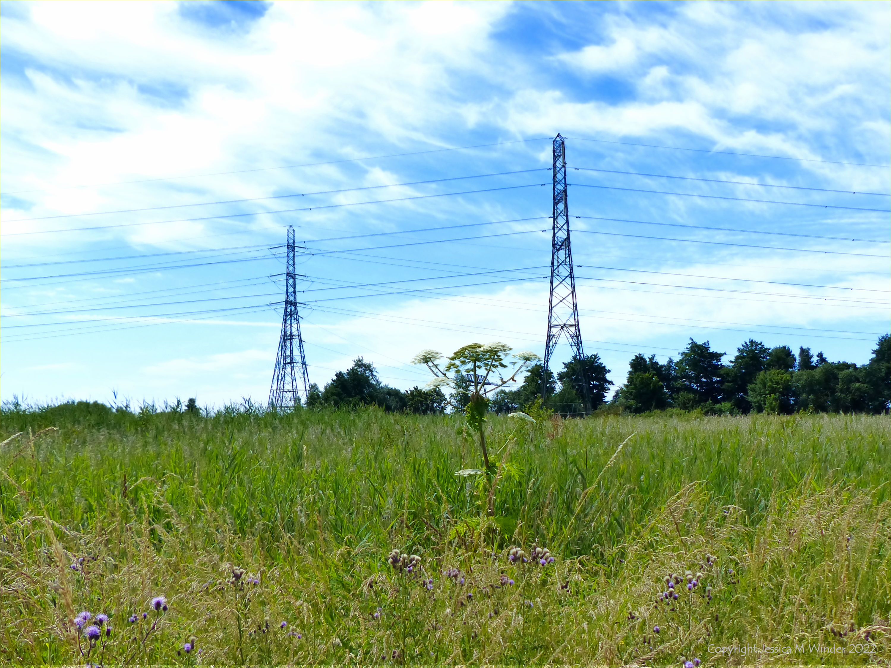 Well back from the pathways, and safe from accidental contact, two Giant Hogweeds vied for attention against a background of pylons on the reserve, They were quite spectacular. I am guessing they were over 3 metres high and unmistakable. Zooming in on the stems, the characteristic purple blotch marks were visible, almost continuous dark colouring on one of them. In some susceptible people, touching one of these plants in sunlight can cause a very severe skin reaction with blistering. They must never be touched. Here they are not accessible by the public.