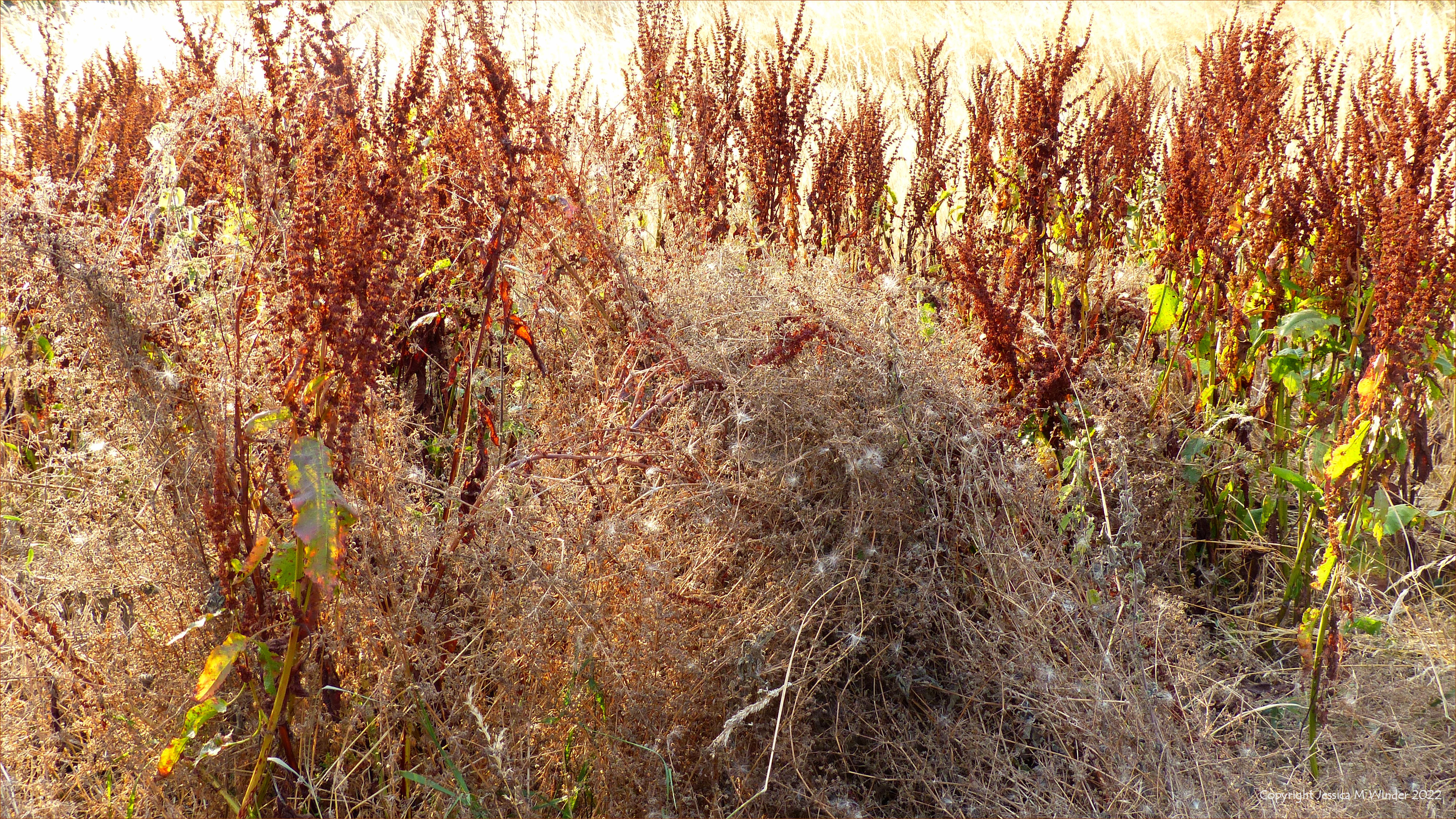 Low evening sunlight shining through a knotted mass of dried Cleavers with seeds, resting against tall stems of rusty-red seeded Docks in a parched field near Charlton Down in Dorset during the current drought.