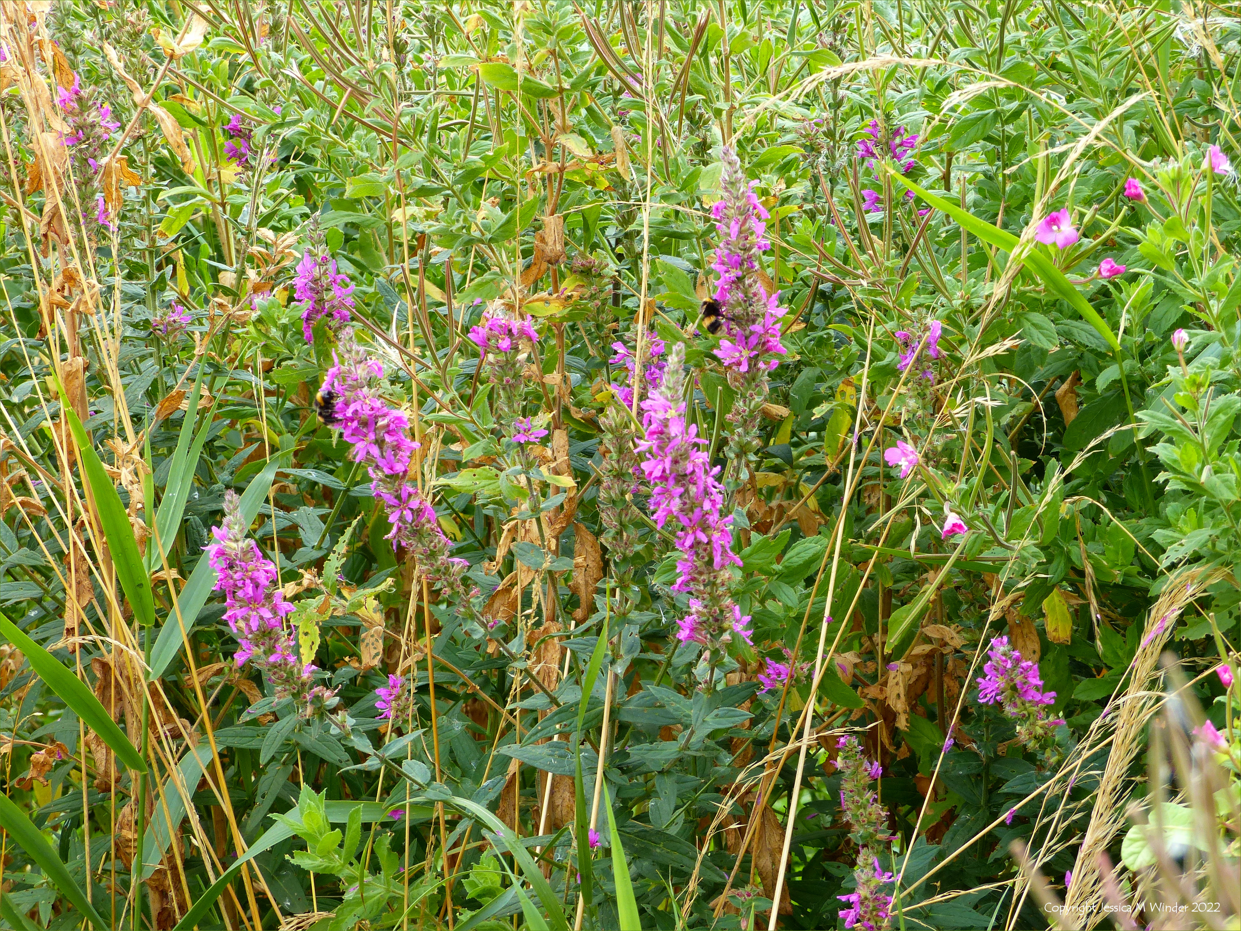 Purple-loosestrife (Lythrum salicaria) is just one of the deep pink wild flowers of the riverbank. Beside the clear chalk stream of the River Cerne near Charlton Down, its tall flower spikes blend with the Himalayan Balsam and Great Wllowherb. These were not particularly tall specimens, about 50 cm compared with an average height in other locations of 1.5m.