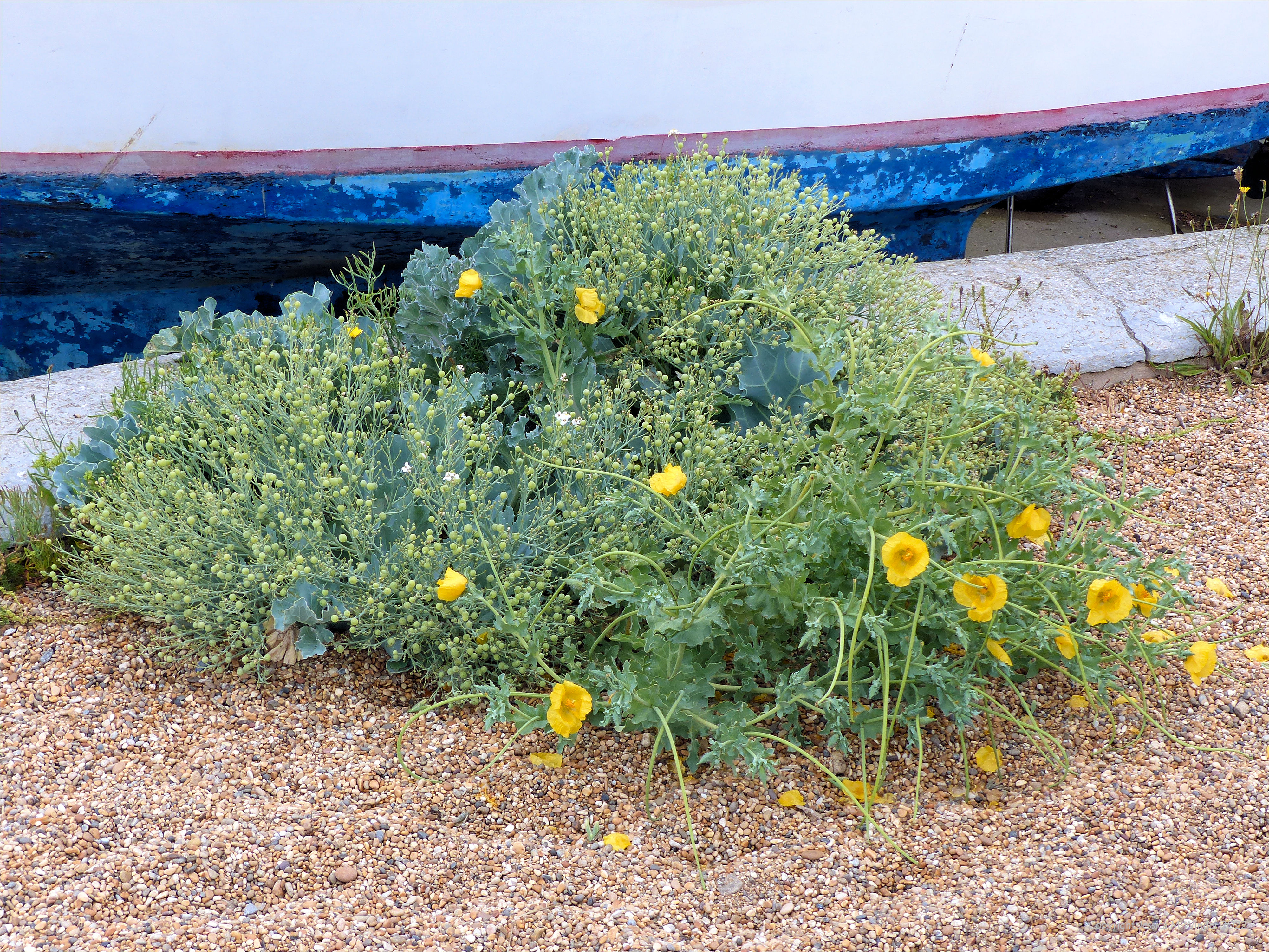 The Yellow Horned-Poppy (Glaucium flavum) grows wild on the shingle beach at West Bay in Dorset. It gets its name from the long thin seed pods that develop from the centre of the flower.