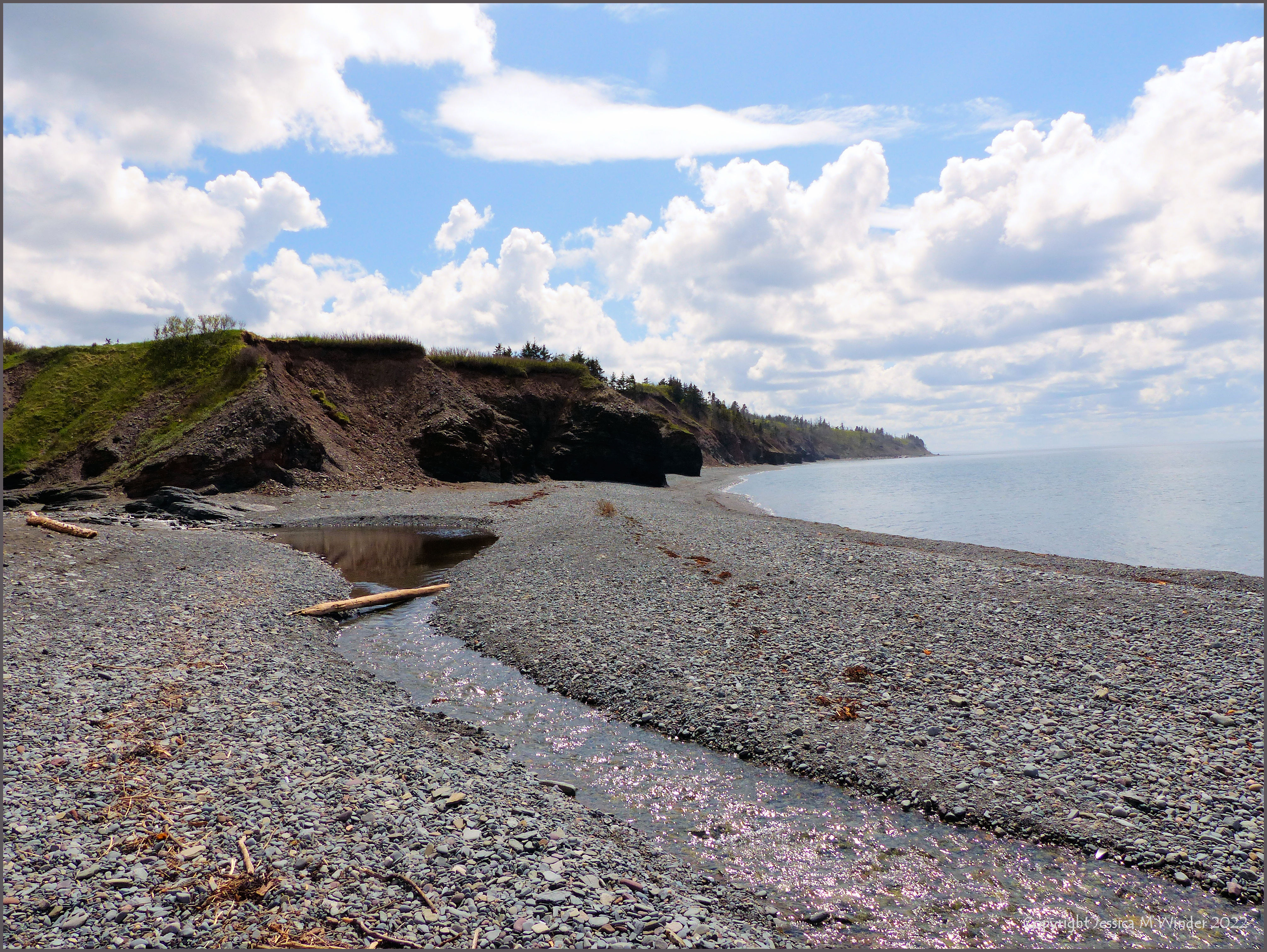 Image 27 of a series of photographs taken at a coastal outcrop of mudstone rocks belonging to the Silurian Period Ross Brook Formation, in Nova Scotia in Canada, showing a stream flowing over the pebble beach.