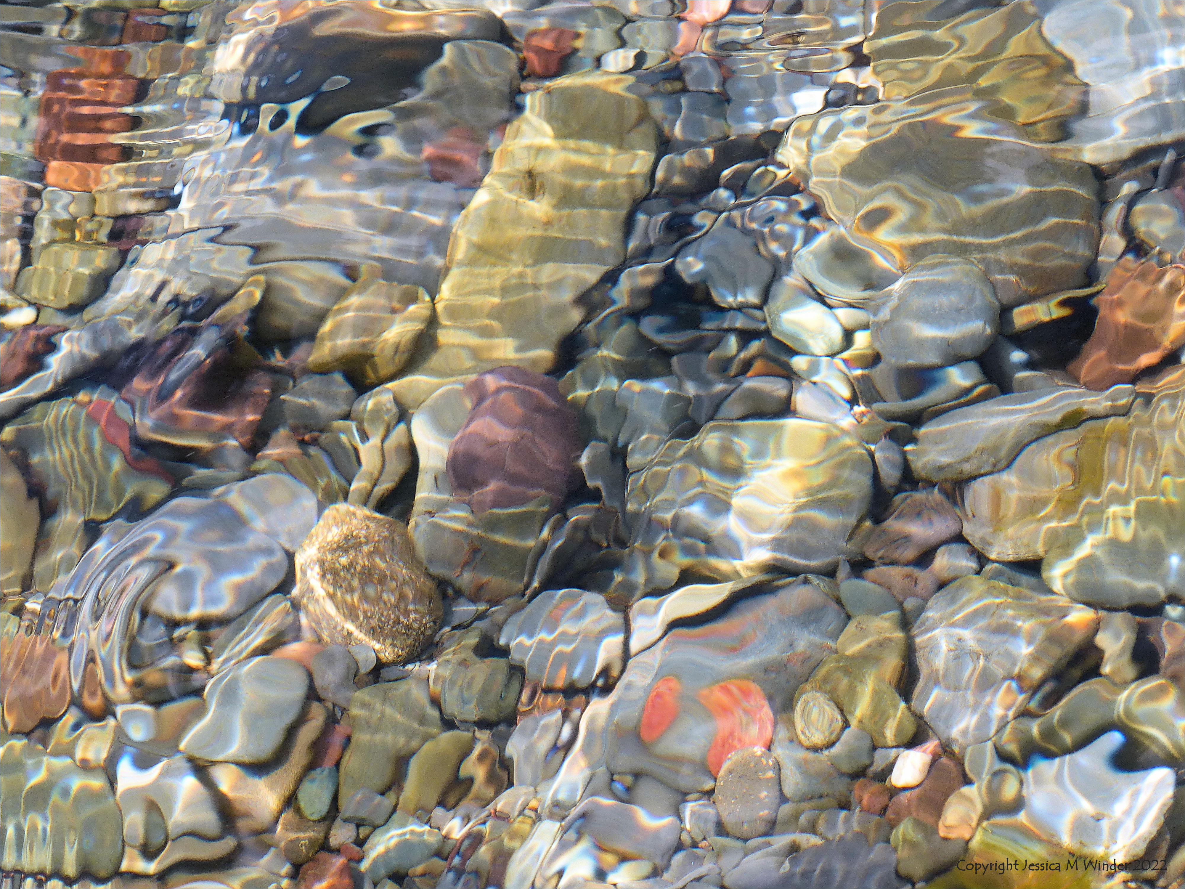 Image 32 of a series of photographs taken at a coastal outcrop of mudstone rocks belonging to the Silurian period Ross Brook Formation on the Northumberland Strait in Nova Scotia, Canada, showing clear stream water flowing over coloured pebbles and stones on the beach below the cliffs.