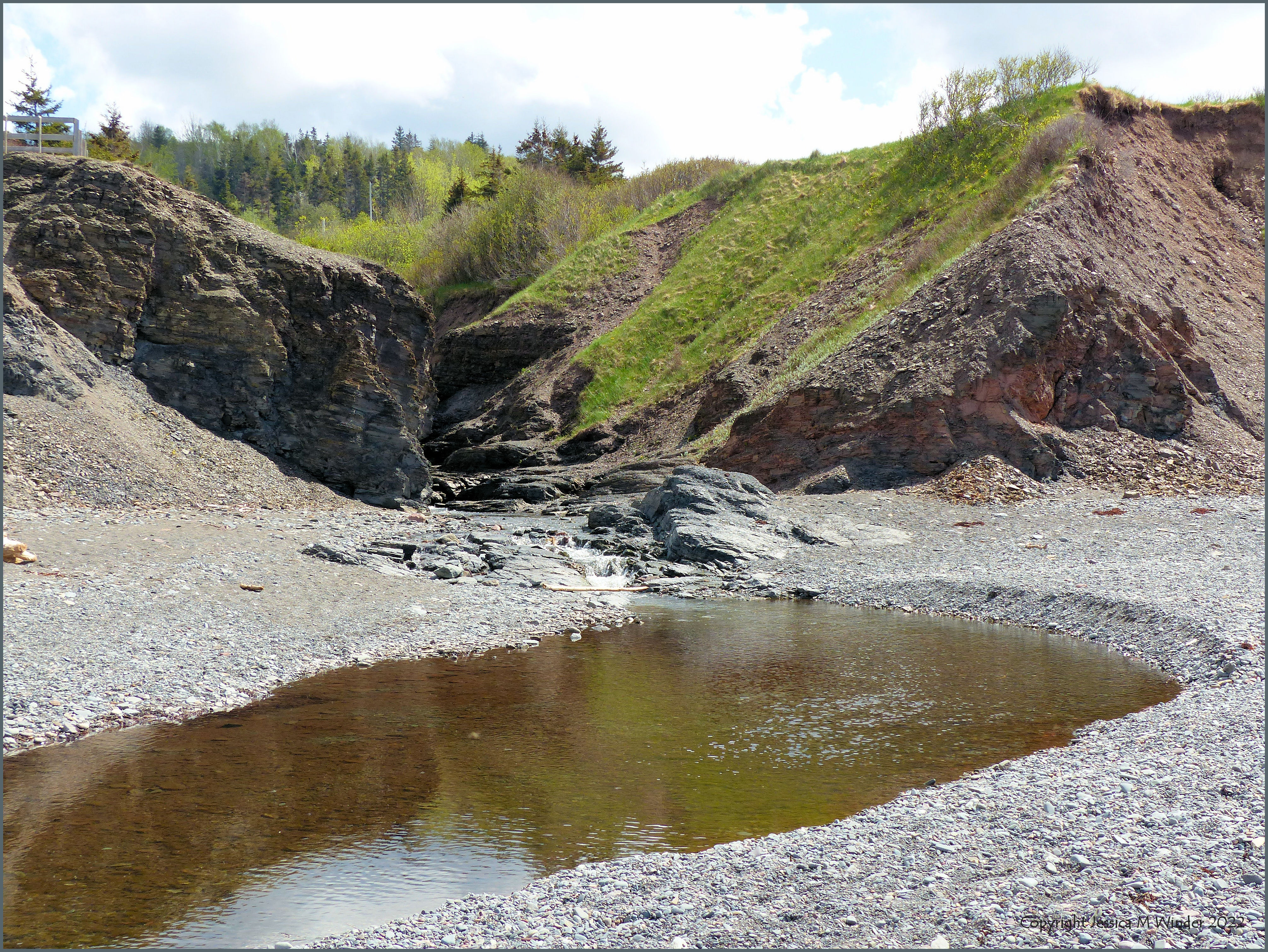 Image 33 of a series of photographs taken at a coastal outcrop of mudstone rocks belonging to the Silurian Period Ross Brook Formation, in Nova Scotia in Canada, showing a brook cutting through the low friable cliffs and then flowing over the pebble beach.