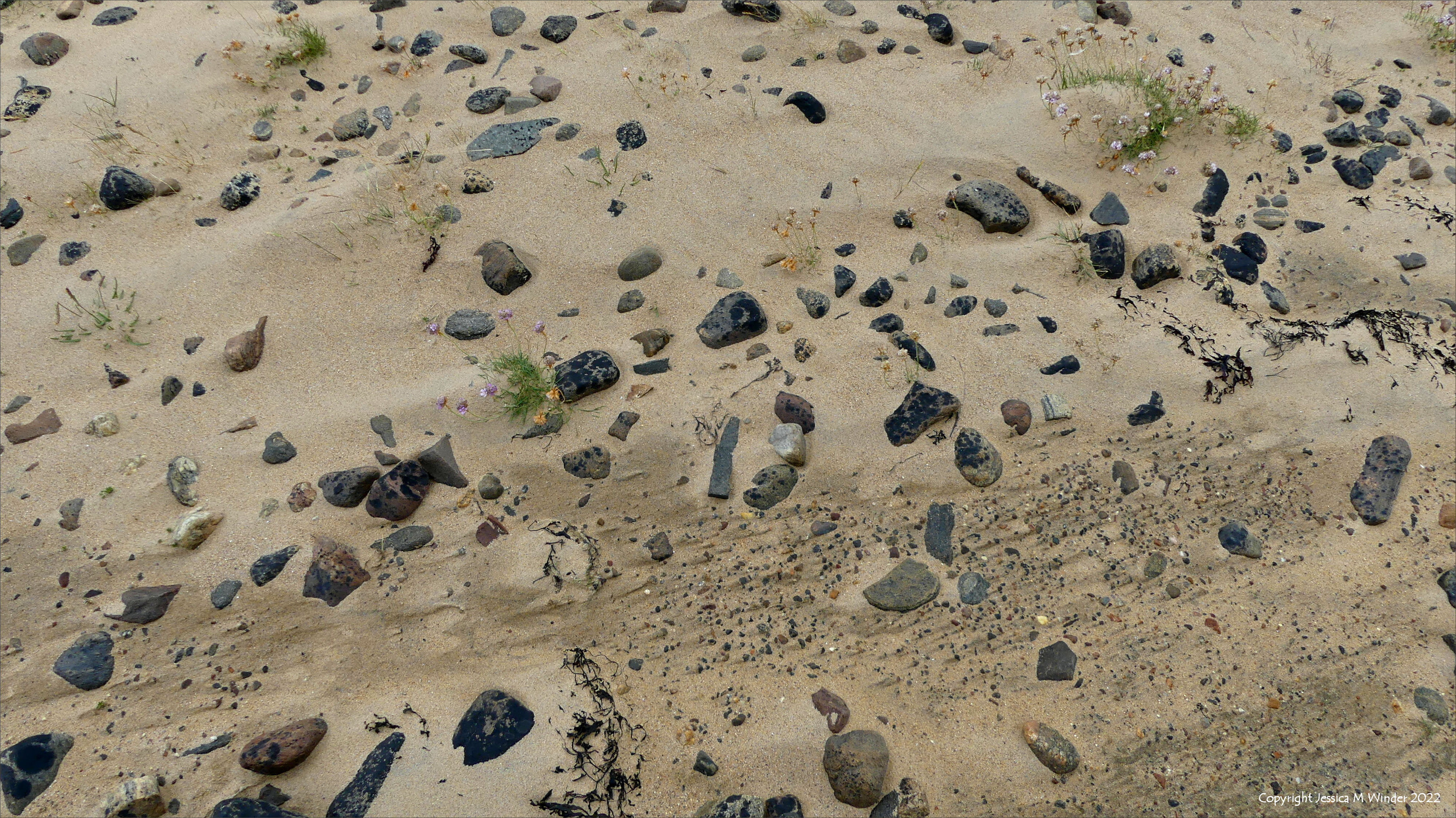 Beach Stone Textures NEB 1-4 Stones from ice age processes on the estuarine banks of the River Naver near Bettyhill on the north coast of Scotland, showing through a layer of wind-blown sand. I believe these stones come from a lateral moraine deposit.