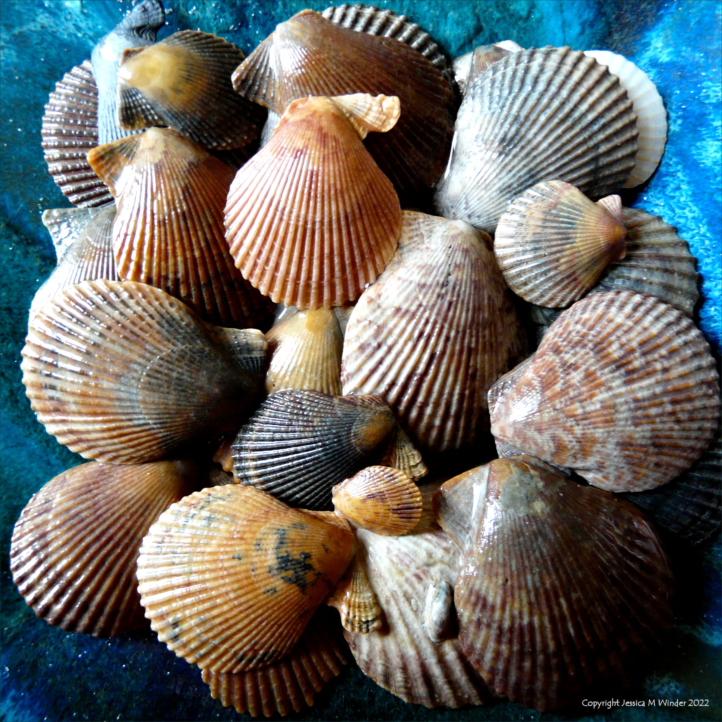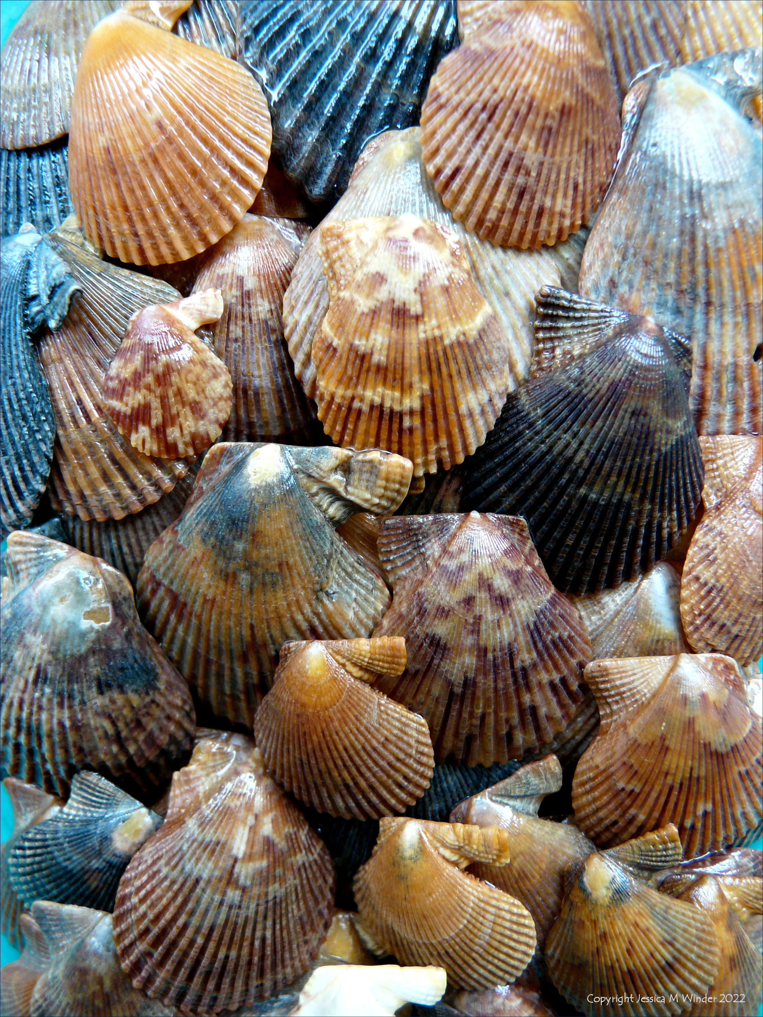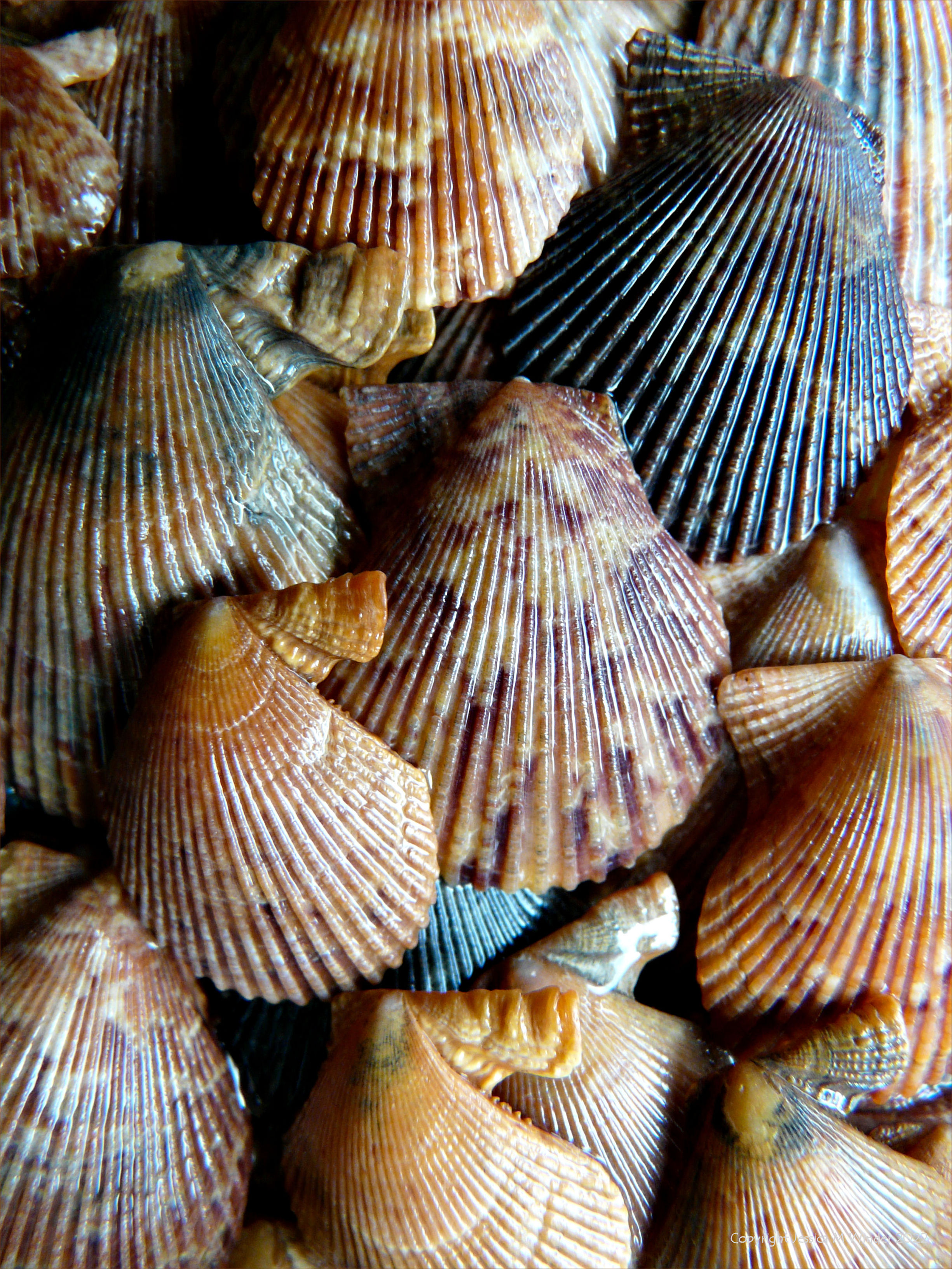 Seashell Textures Small Scallops 1-7 Ribbed and patterned shells of variously coloured small scallop shells found on the beach and piled into assorted arrangemnets.
