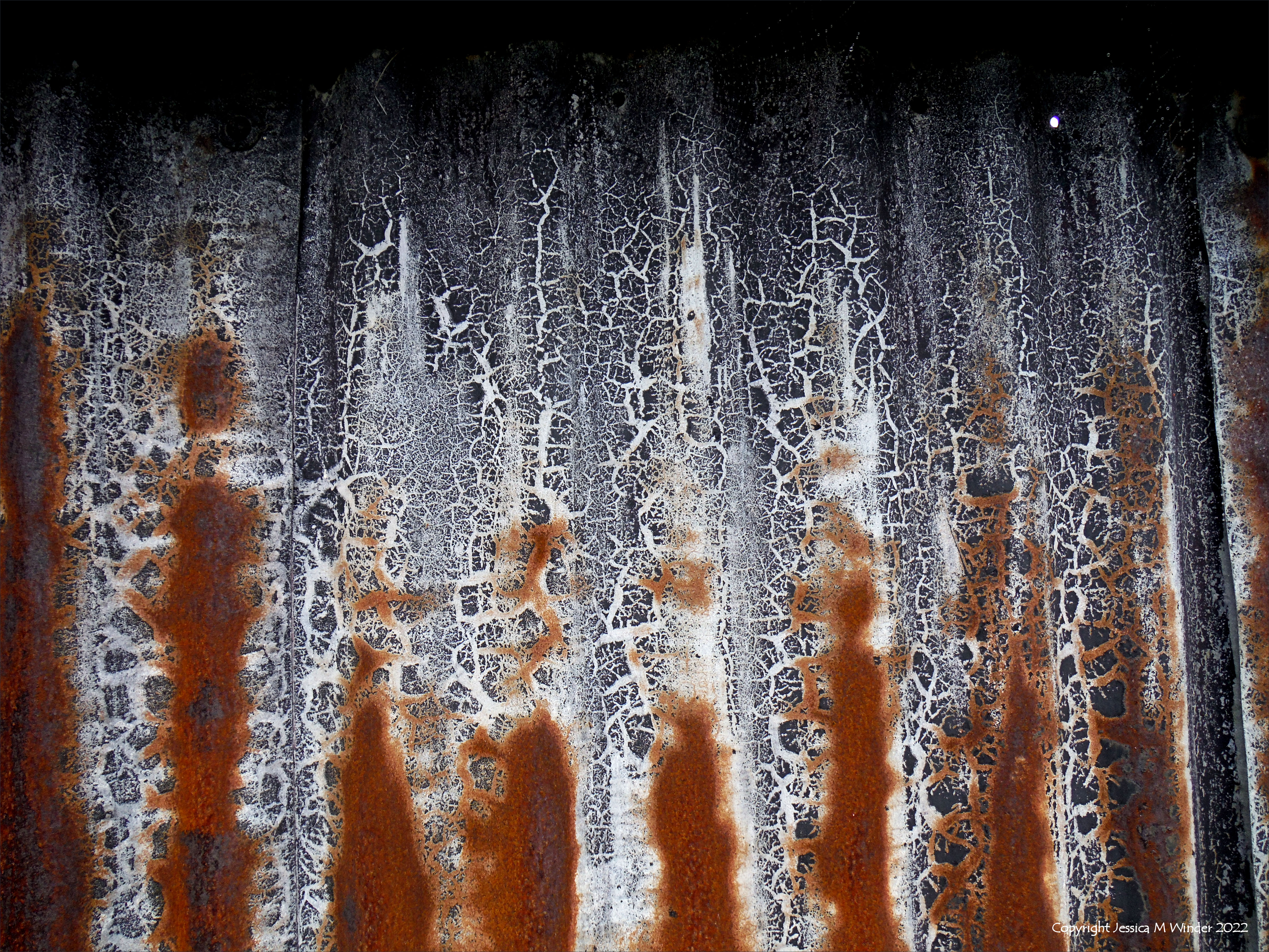 Thank you, Sandy. The white “threads” are in fact the cracks which have opened up in the black paint due to the expansion and contraction of the metal of the corrugated iron as the weather temperature fluctuates throughout the year. The relatively fresh exposed metal surface has not rusted yet in most of the cracks but in the last photo you can see where the oxidation process has started in the fissures.