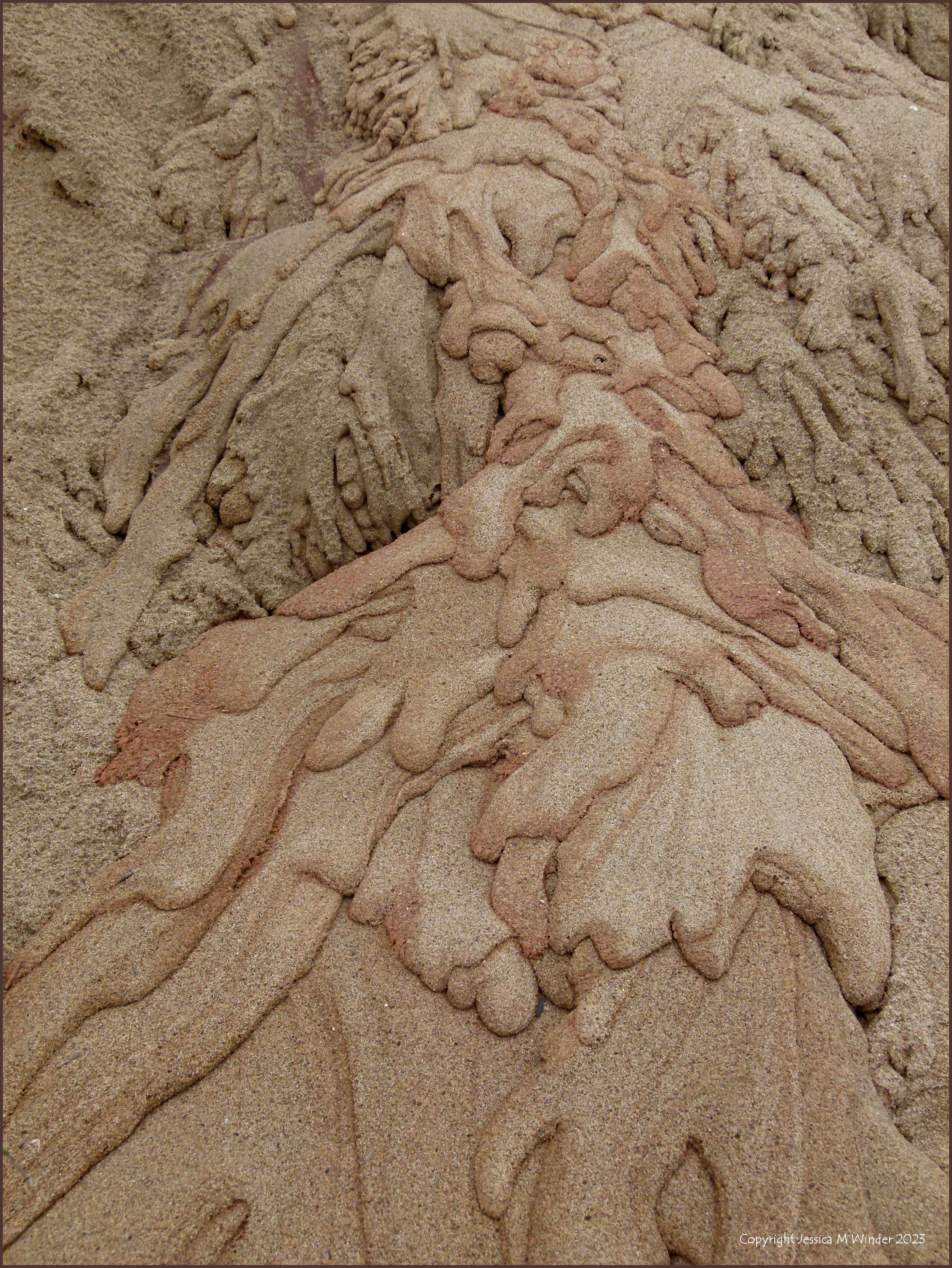 Sand Surface Textures 23-27 Unusual sculpturing of sand after heavy rain that had washed down from a solifluction terrace onto the seashore carrying finer red sediments that mingled with the sand.