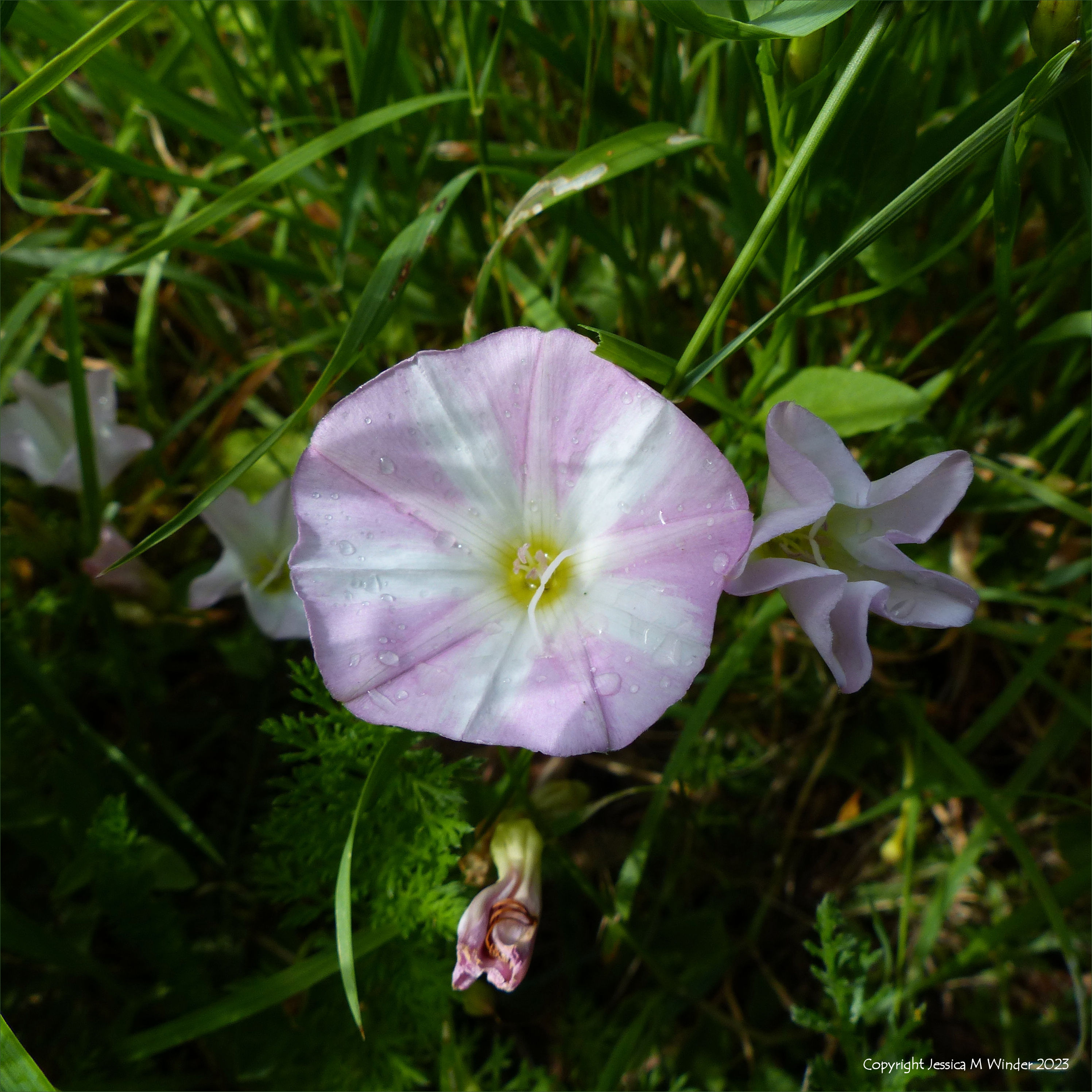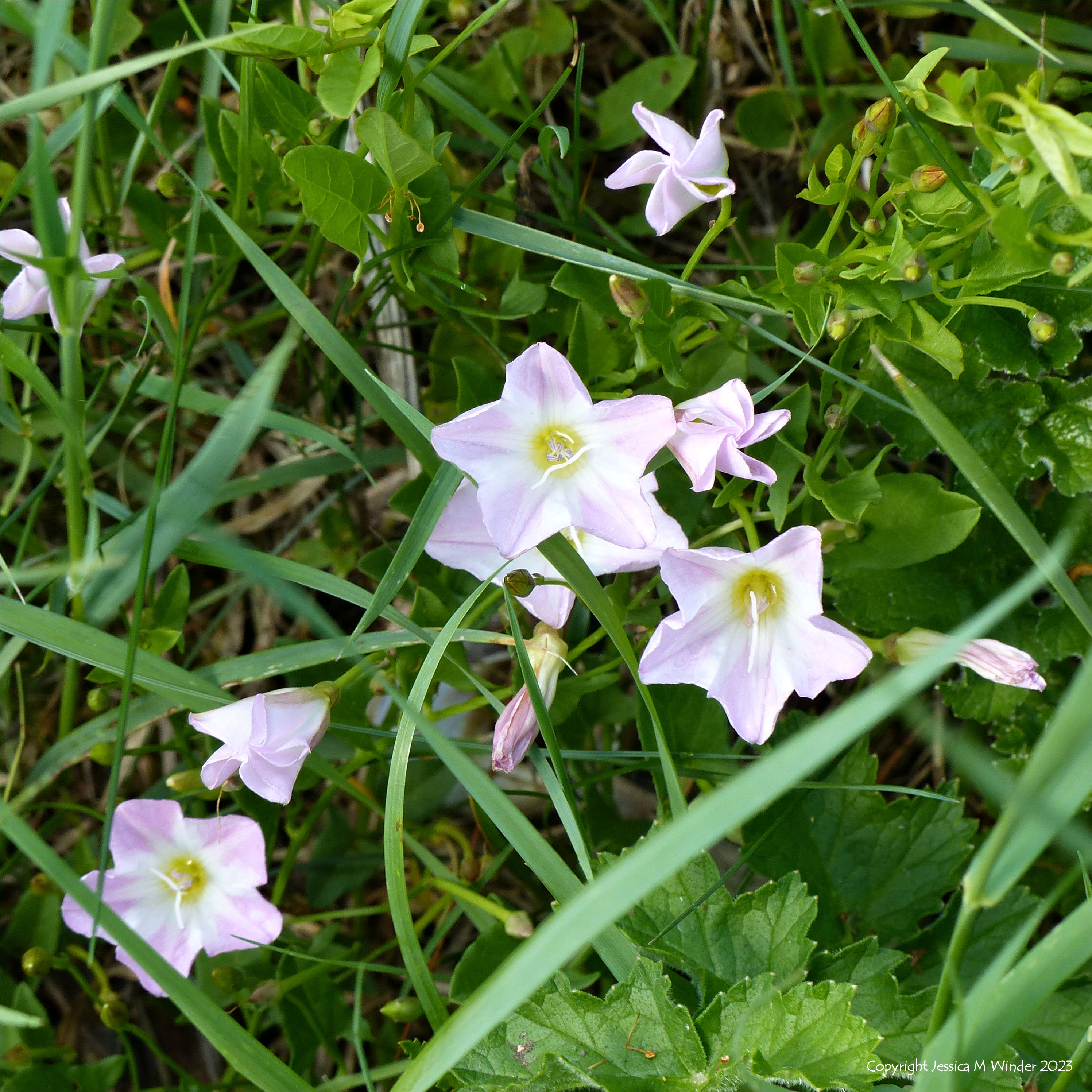 This is the 6th post about the transition of a piece of waste ground into a purposed wild garden. These photos were taken during the year 2020 when it was in its natural state, that is to say, the “before” pictures, when there were already lots of interesting flowering plants, mostly native species but some escapees from gardens. The images this time feature Field Bindweed (Convolvulus arvensis) which is a smaller and more colourful species than the more common Large or Hedge Bindweed. In this location it mostly grew at ground level.
