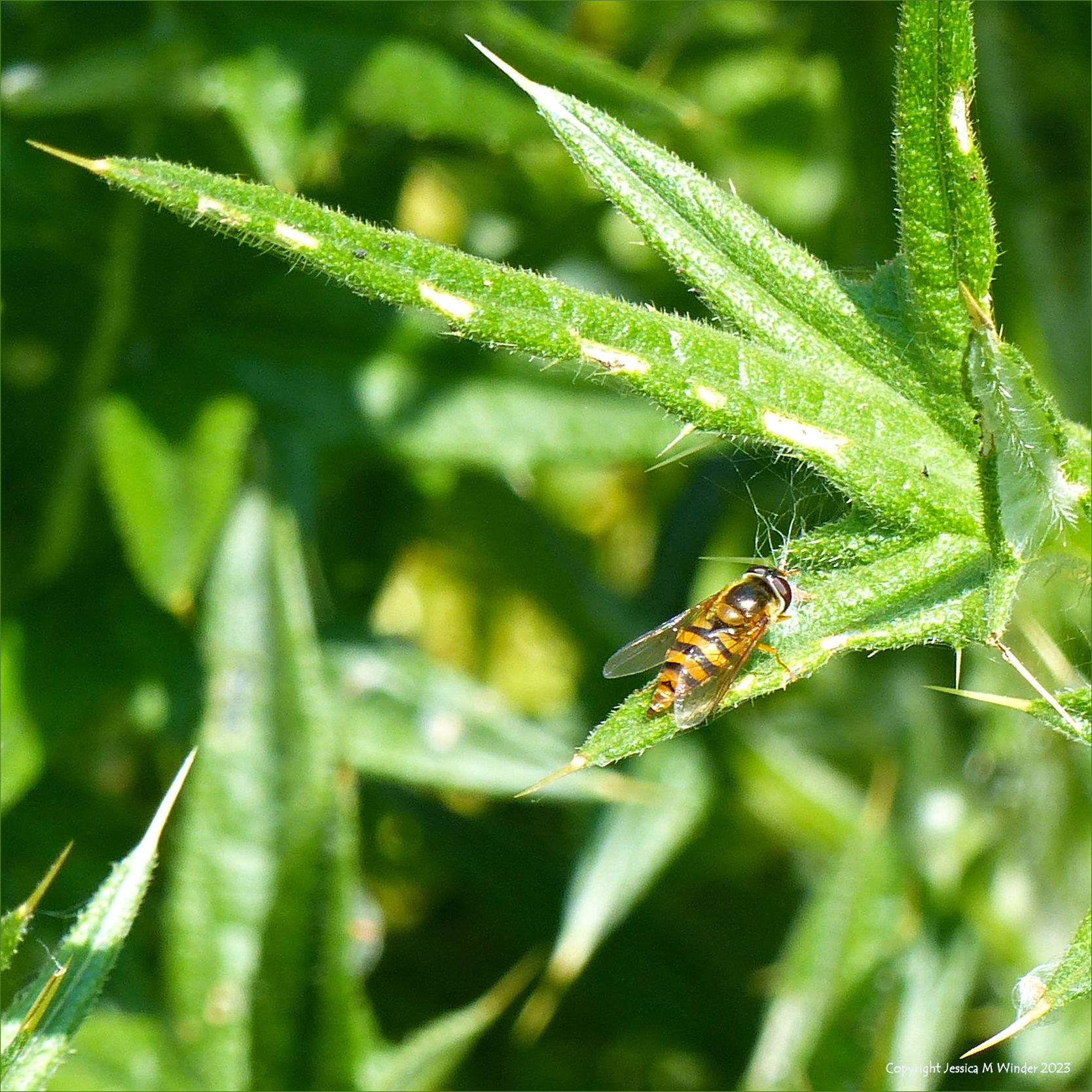 The planting is designed not only to look attractive, colourful, and varied, but also to provide a resource for wildlife, such as food for insects. While photographing the plants I noticed some insects as well, surprisingly few in the early summer when it seemed as if the blooming was out of sync with the hatching of the flying species. Bees were the most frequent visitors but hoverflies, beetles, shieldbugs and butterflies were there too.