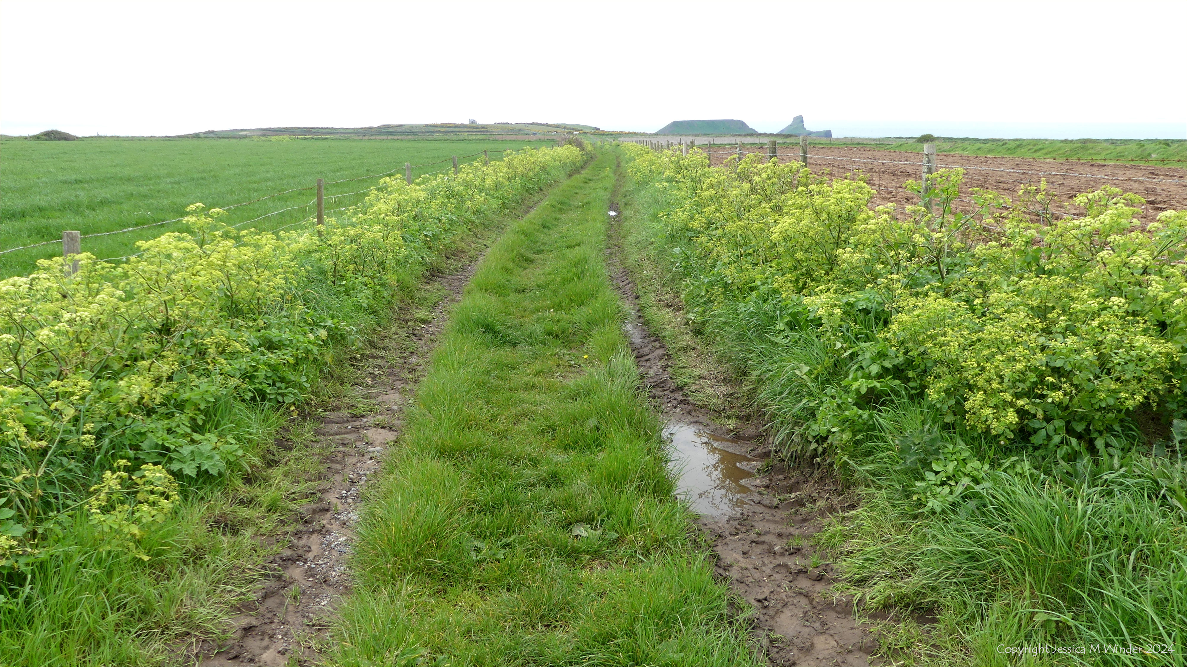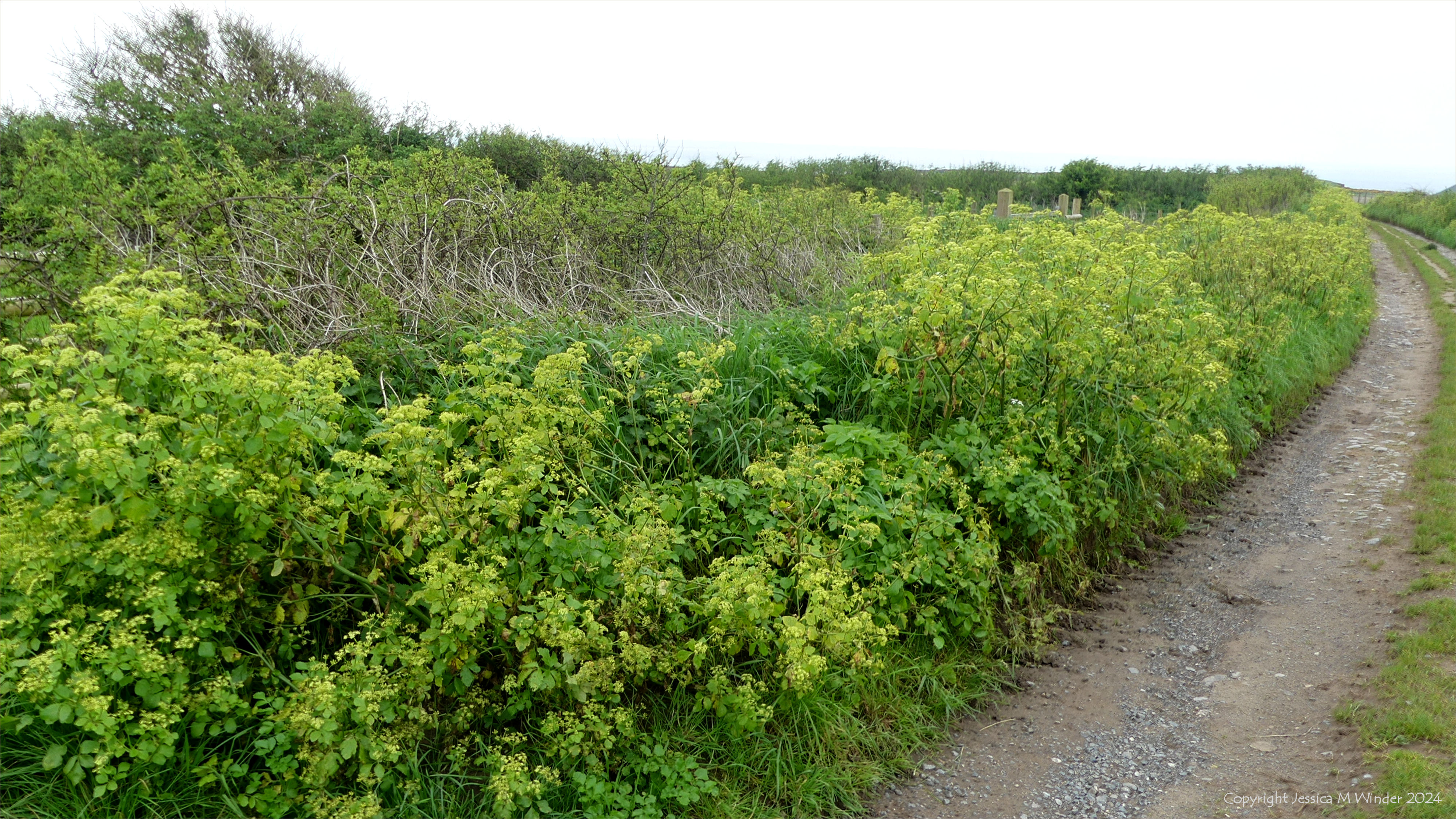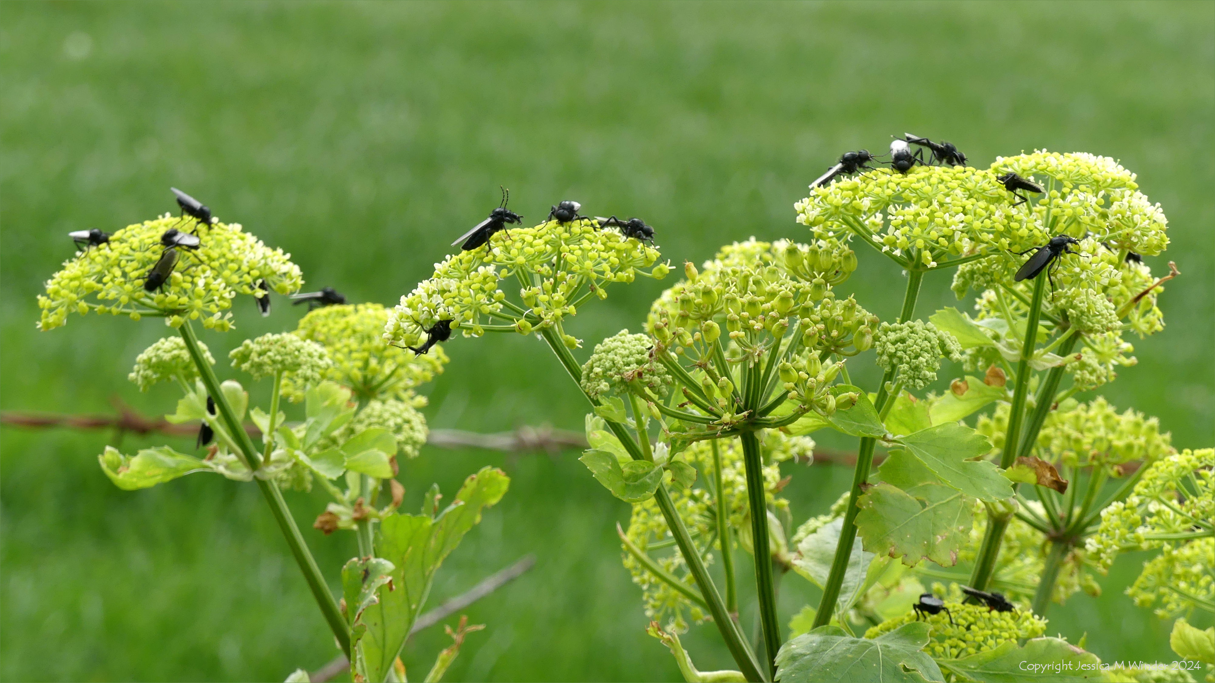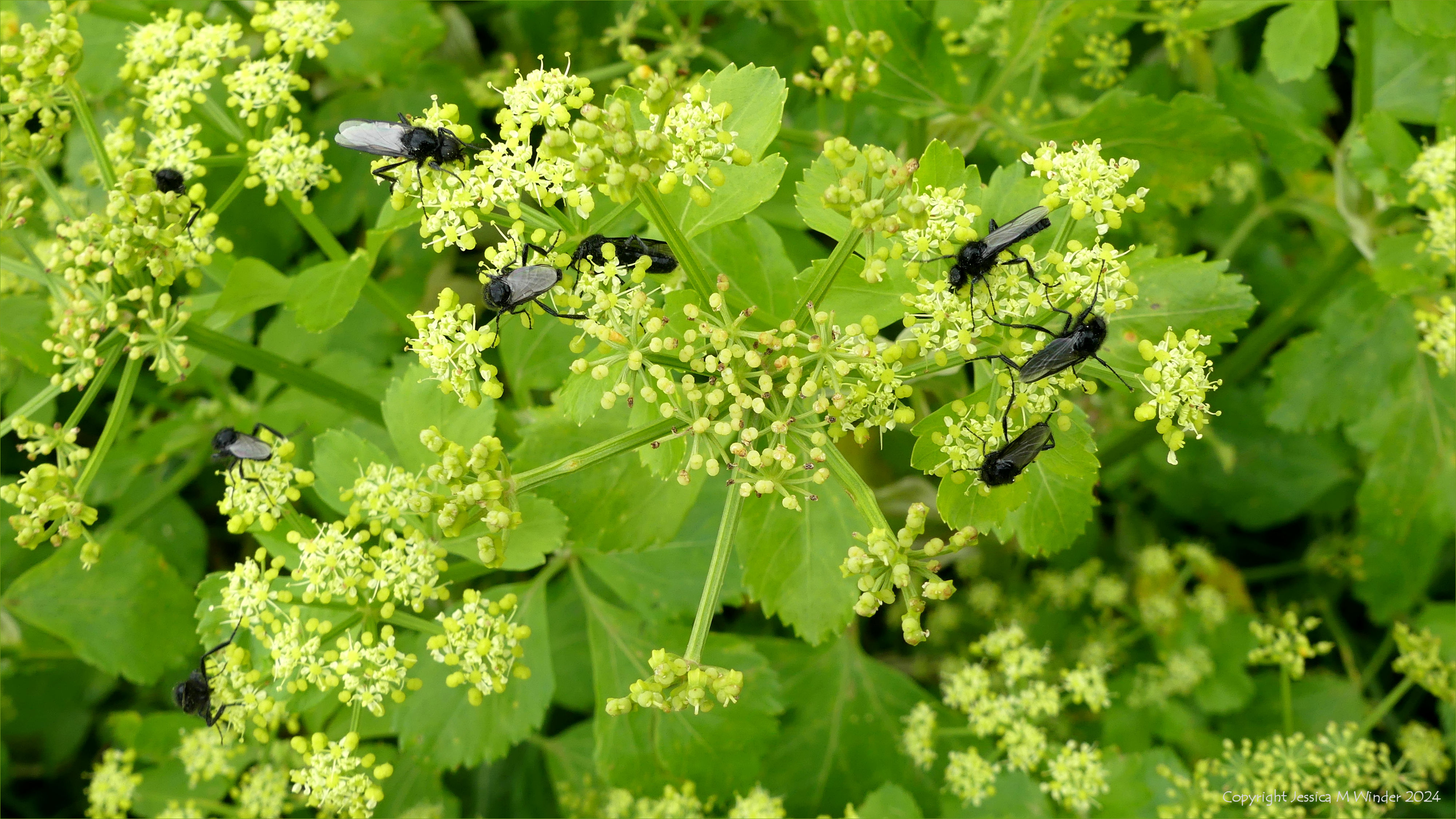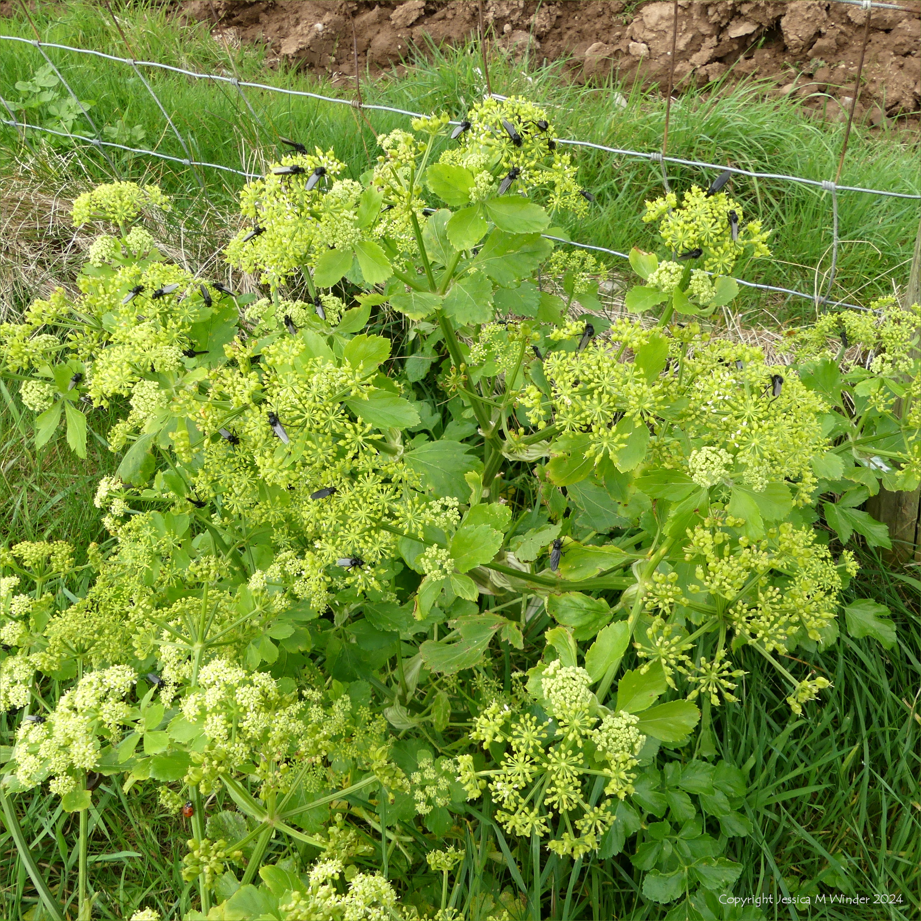On a recent visit to Rhossili I had looked forward to seeing Spring flowers in the ancient Vile strip fields on the promontory but, when I arrived, I was disappointed because most of the fields had just been ploughed or mown. The only flowers of interest were the Alexanders (Smyrnium olusatrum) which were flowering in abundance on either side of one of the lanes. Curiously, each plant was covered with large black flies that I had not seen before, St Mark’s Flies (Bibio marci).