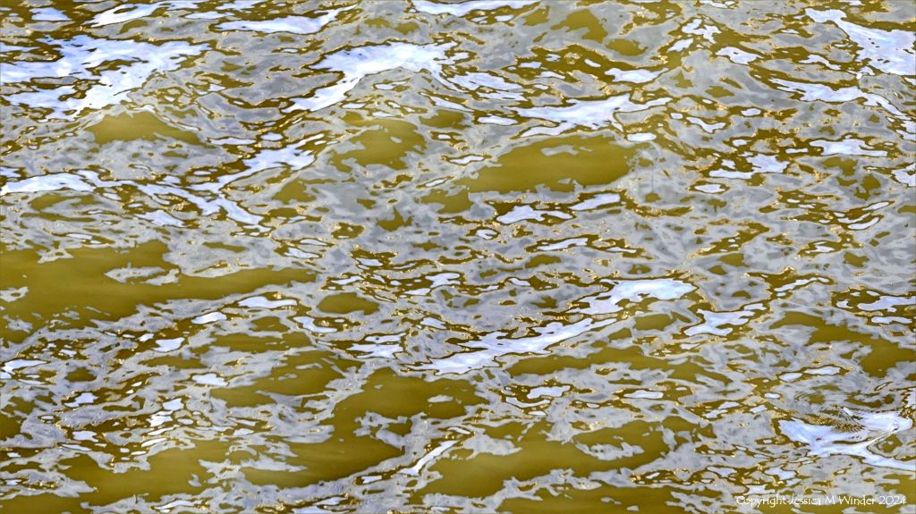 Natural patterns of flow and reflection on the River Thames, December 2024, photographed from Golden Jubilee Bridge between Waterloo and Charing Cross Stations in London.