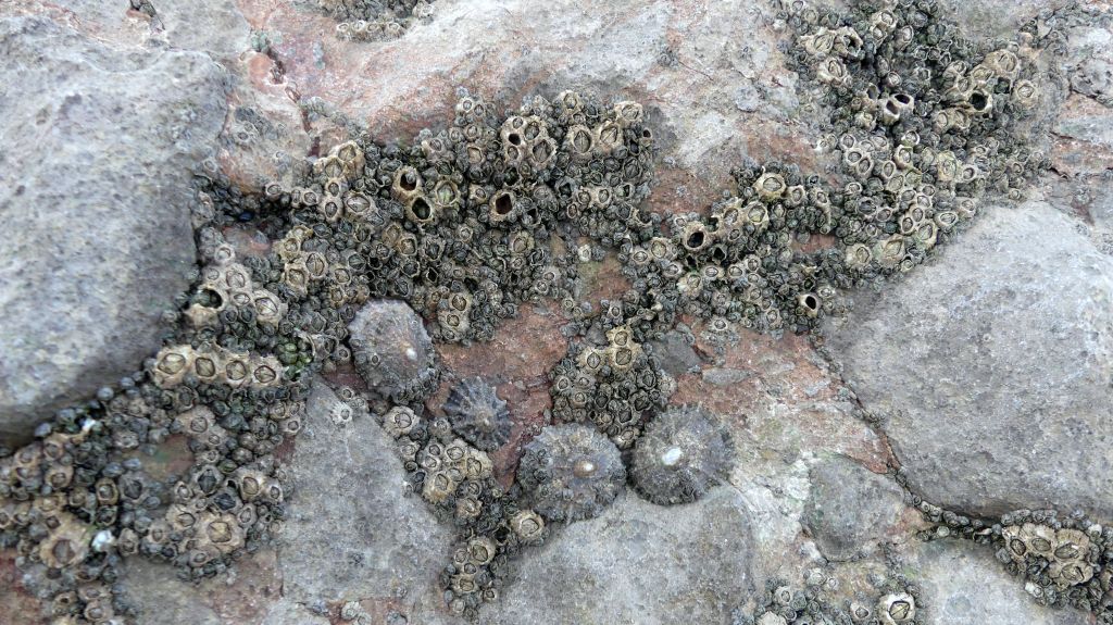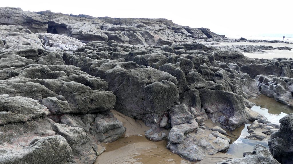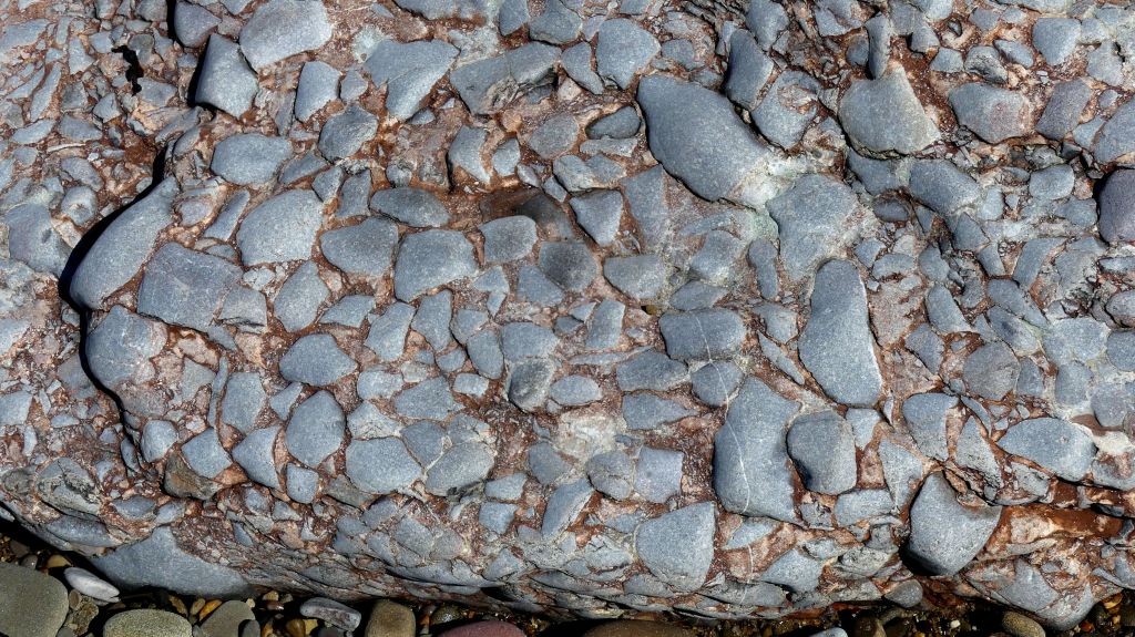 Walking further west along the seashore at Ogmore-by-Sea, the outcropping rocks change from the rock pavement of Pembroke Limestone of Carboniferous age to relatively more recent Triassic sediments from roughly 250 – 200 million years ago. The rock consists of a matrix of red sand and silt in which are embedded rounded and sub-angular pebbles of the Pembroke Group limestone. The photos show details of this rocky headland, and you can find more information online provided by the Geologist’s Association, South Wales Group in their leaflet “Geological Walks in Wales – Ogmore-by-Sea, Vale of Glamorgan” in Locality 3.