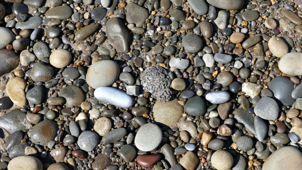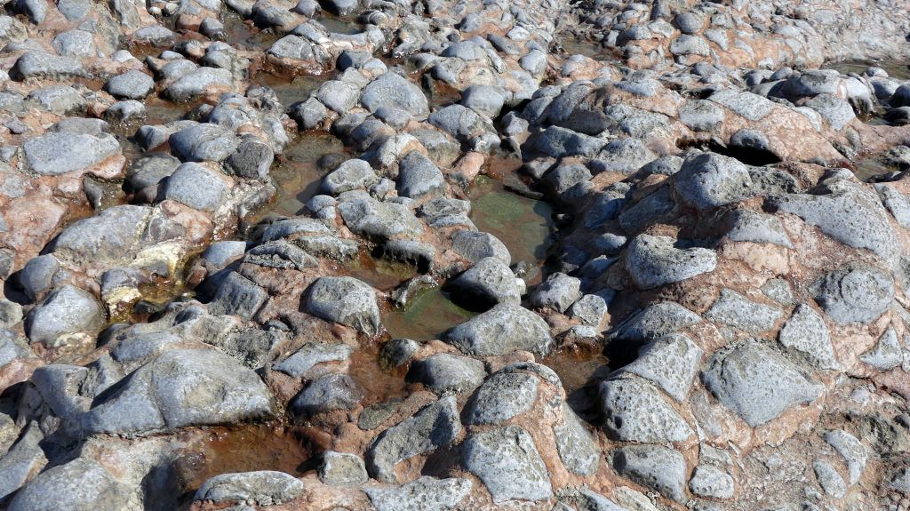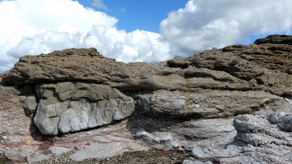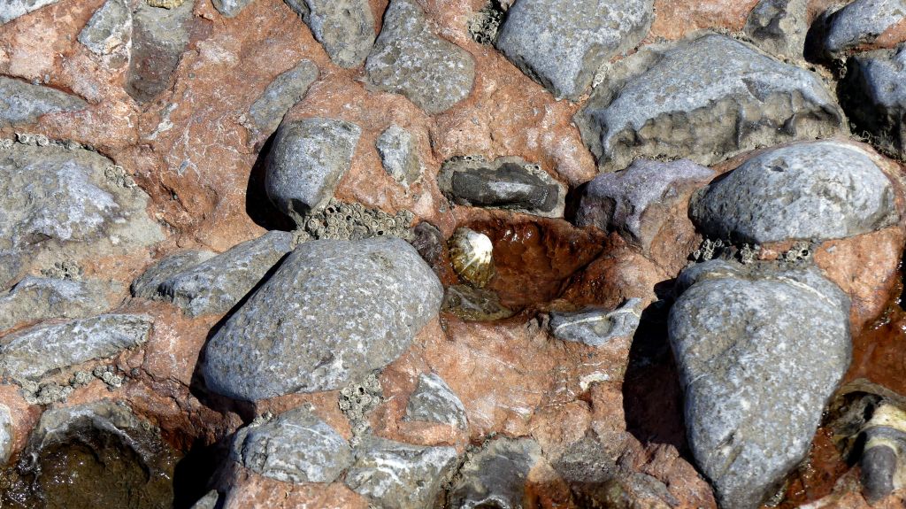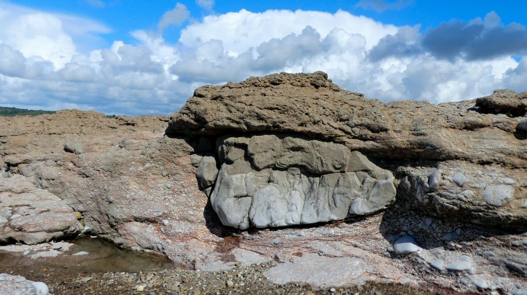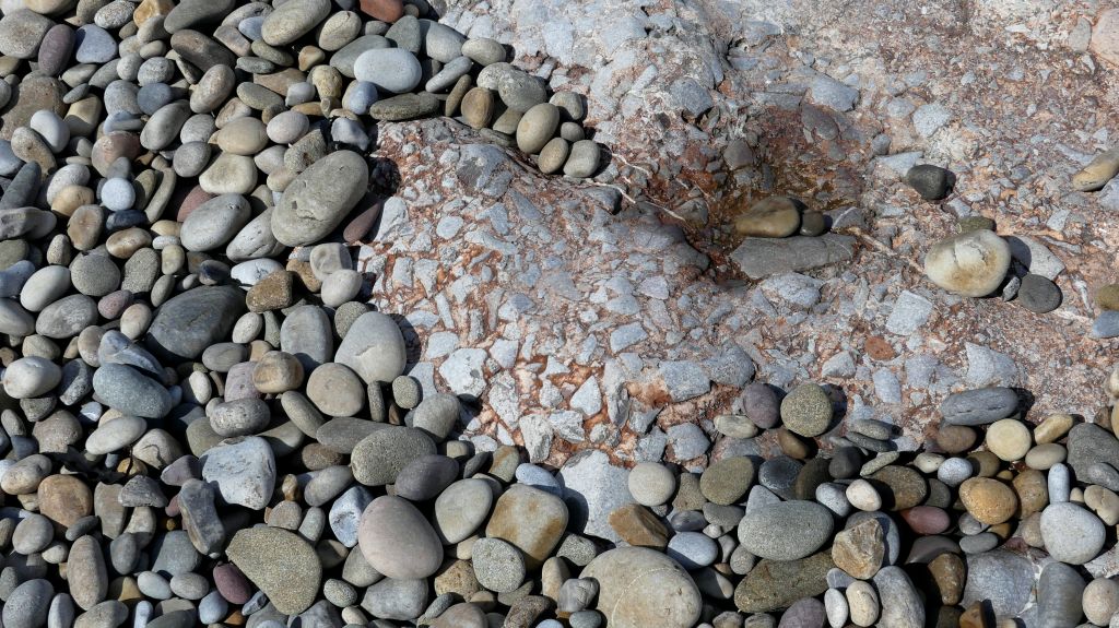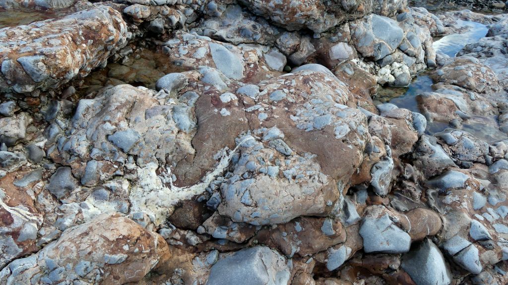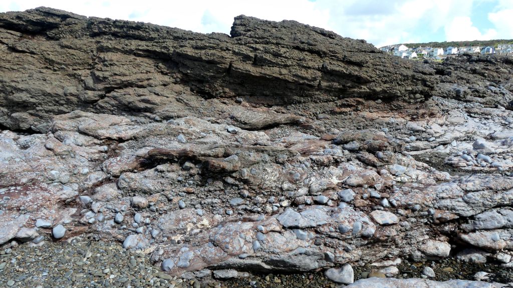 Walking further west along the seashore at Ogmore-by-Sea, the outcropping rocks change from the rock pavement of Pembroke Limestone of Carboniferous age to relatively more recent Triassic sediments from roughly 250 – 200 million years ago. The rock consists of a matrix of red sand and silt in which are embedded rounded and sub-angular pebbles of the Pembroke Group limestone, and sometimes enormous multi-ton boulders. Rock from the Permian era which follows chronologically after the Carboniferous and before the Triassic is entirely absent. The Triassic rock is therefore said to lie unconformably on the Carboniferous ones. The photos show details of this rocky headland, and you can find more information online provided by the Geologist’s Association, South Wales Group in their leaflet “Geological Walks in Wales – Ogmore-by-Sea, Vale of Glamorgan” in Locality 3.
