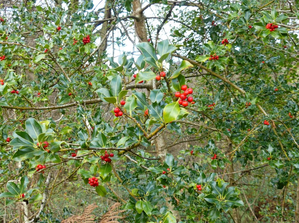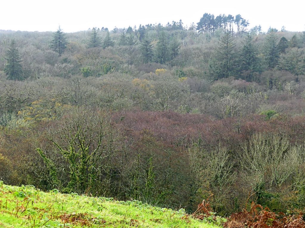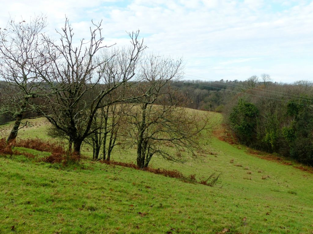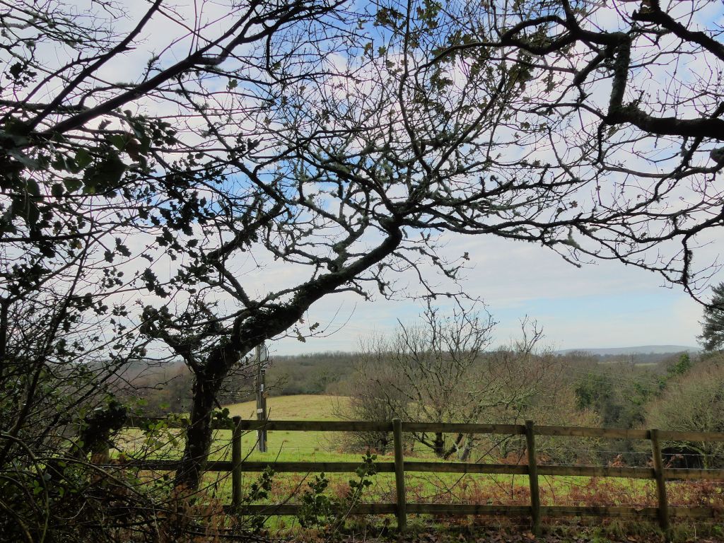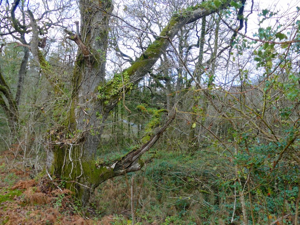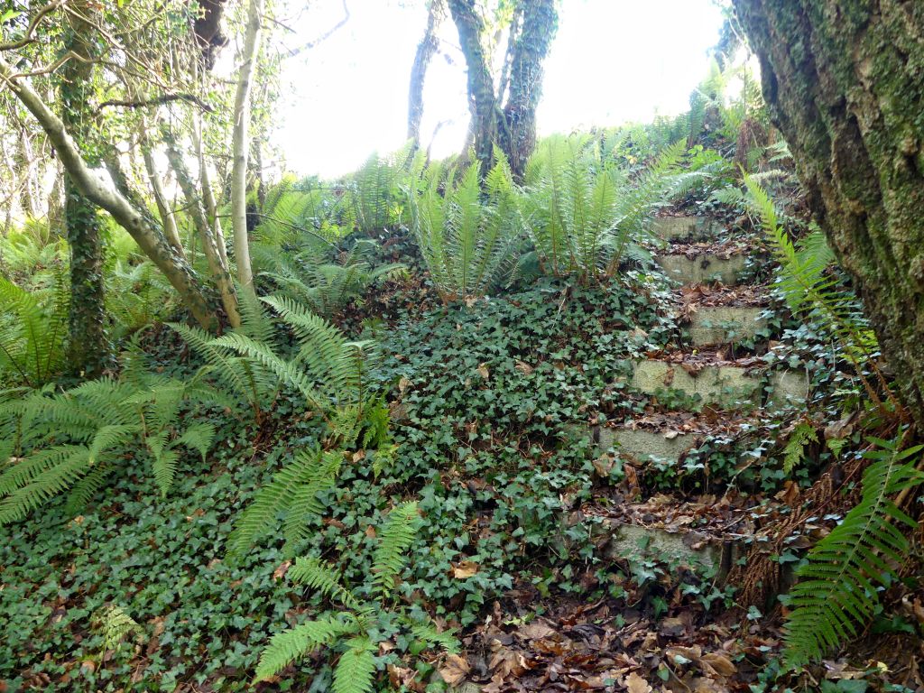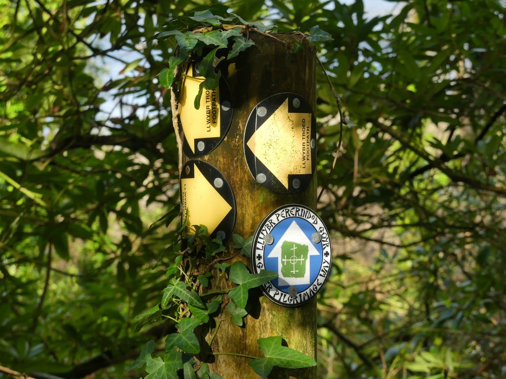 A gateway on the side of the road a few yards below the cottage opens into Mill Wood and the Gower Pilgrimage Way that connects the local St Andrews church in Penrice to 16 other historic churches on the Gower peninsula. The narrow track wends downhill through overarching tall trees covered in mosses, with a steep impenetrable gully to one side and a fern-covered slope up to the field boundary on the other. At one point steps lead to a gate in the boundary fence where an ancient well or spring lies in the field.