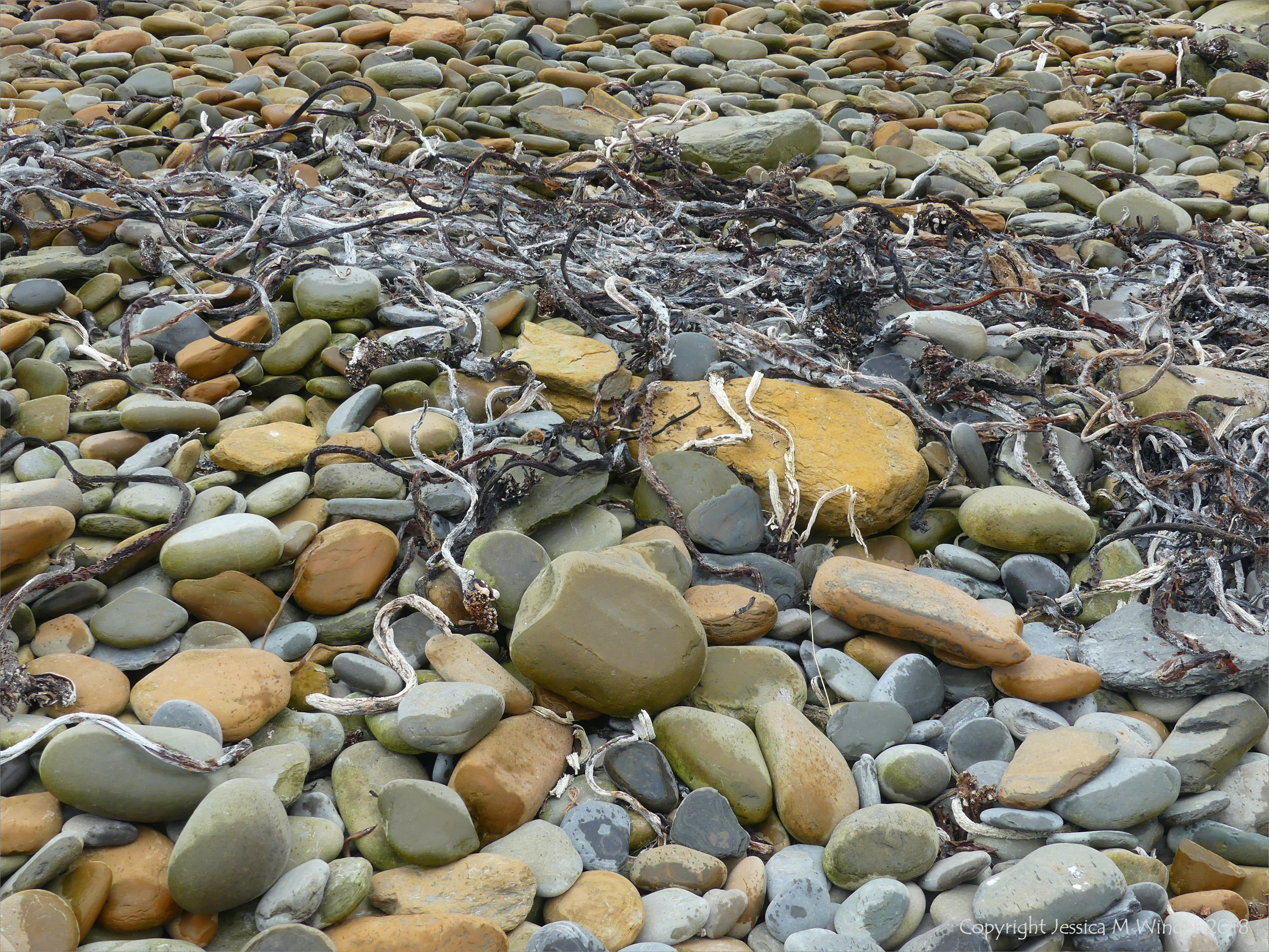 Bay of Skaill 3 – There was a strandline of dried kelp stems lying on the upper shore pebbles at Bay of Skaill in Orkney June 2018