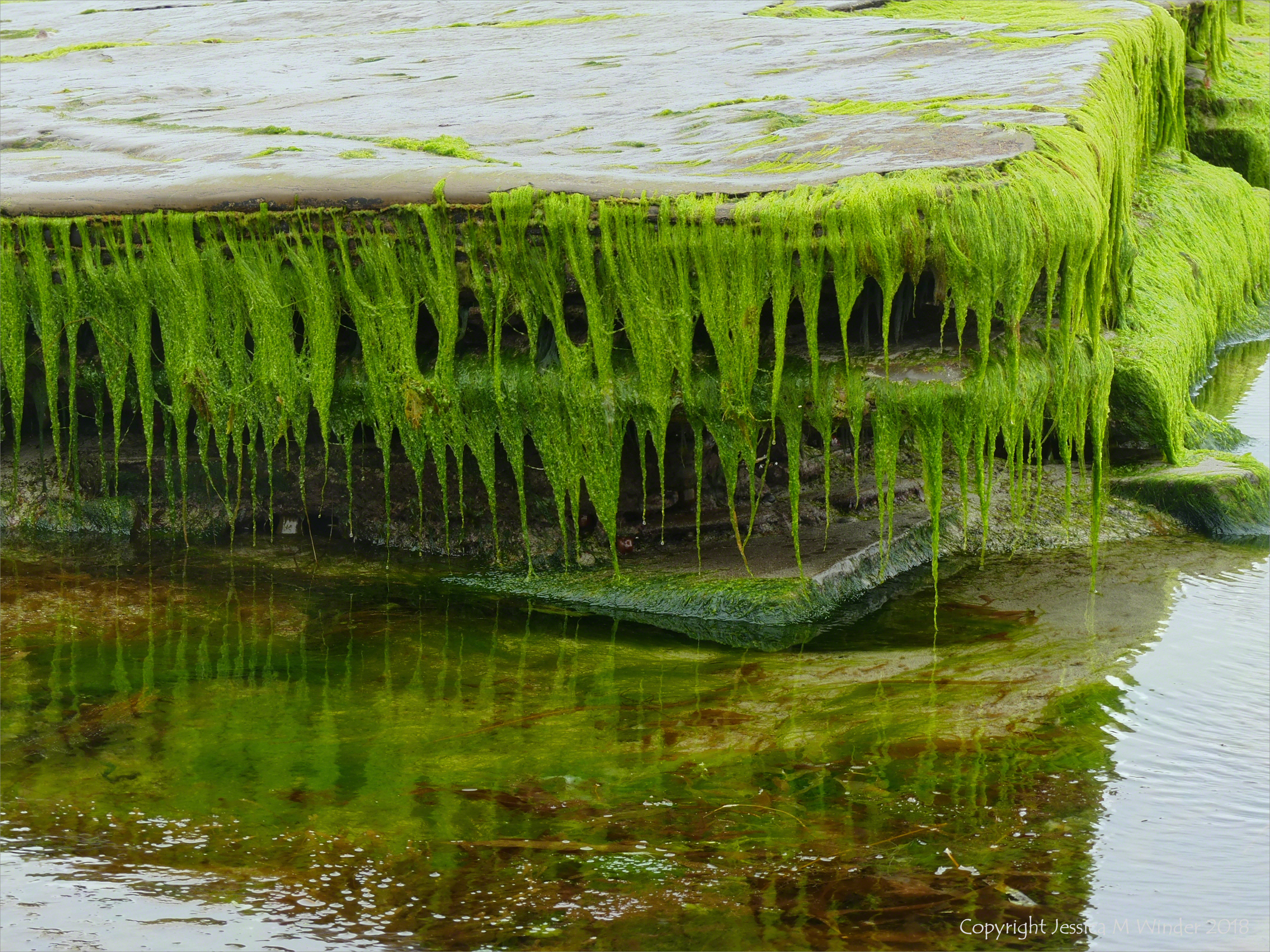 Bay of Skaill 7 – Gently sloping layers of Upper and Lower Stromness Flagstone (part of the Caithness Flagstone Group) were exposed by the ebbing tide, and trailing fringes of bright green seaweed like gutweed festooned their surfaces at Bay of Skaill in Orkney June 2018