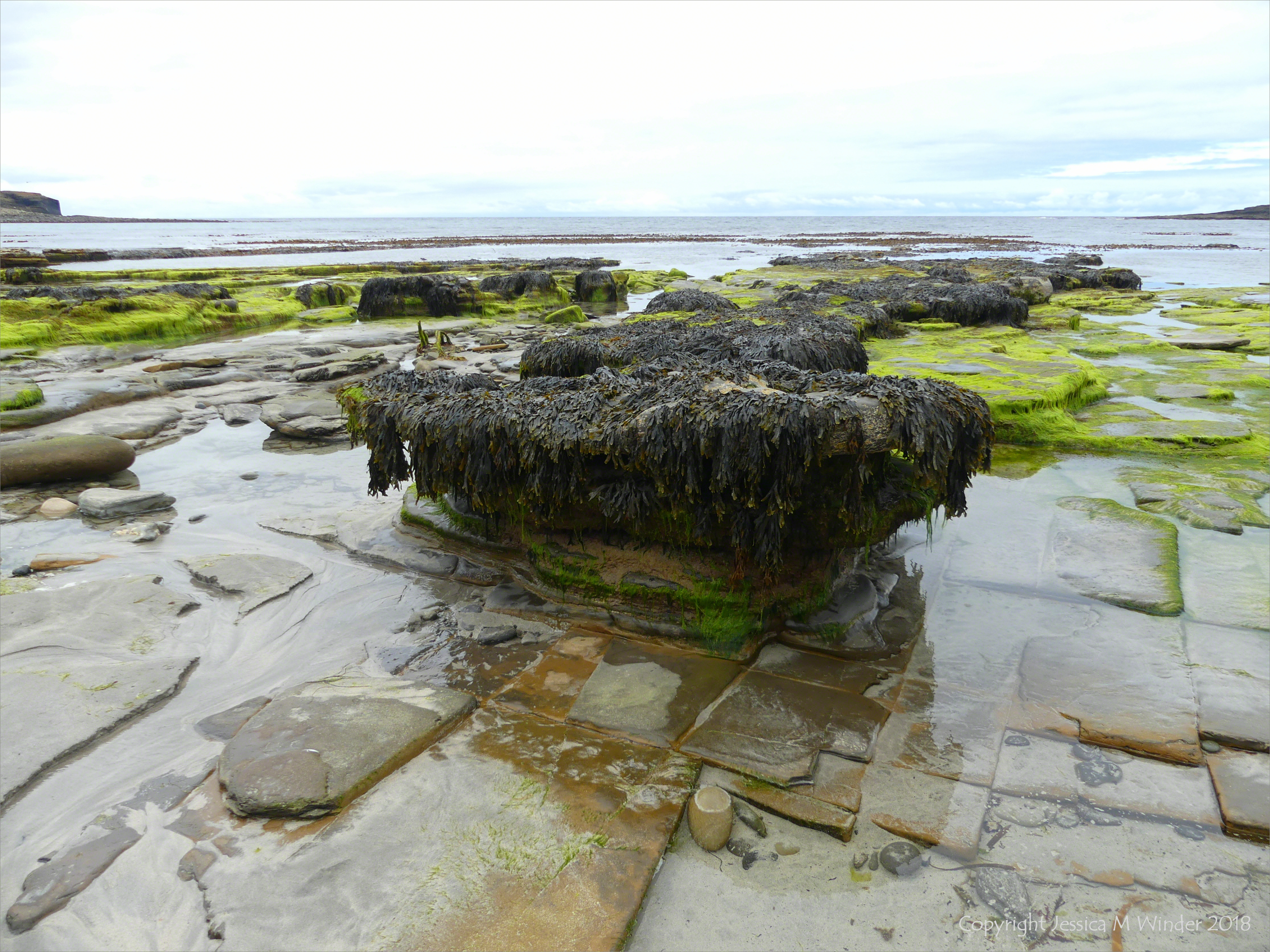 Bay of Skaill 13 – An apparant island of harder rock stands on a pedestal above the flatter Caithness Flagstone on the beach at Bay of Skaill in Orkney June 2018. It was covered with fucoid seaweeds.